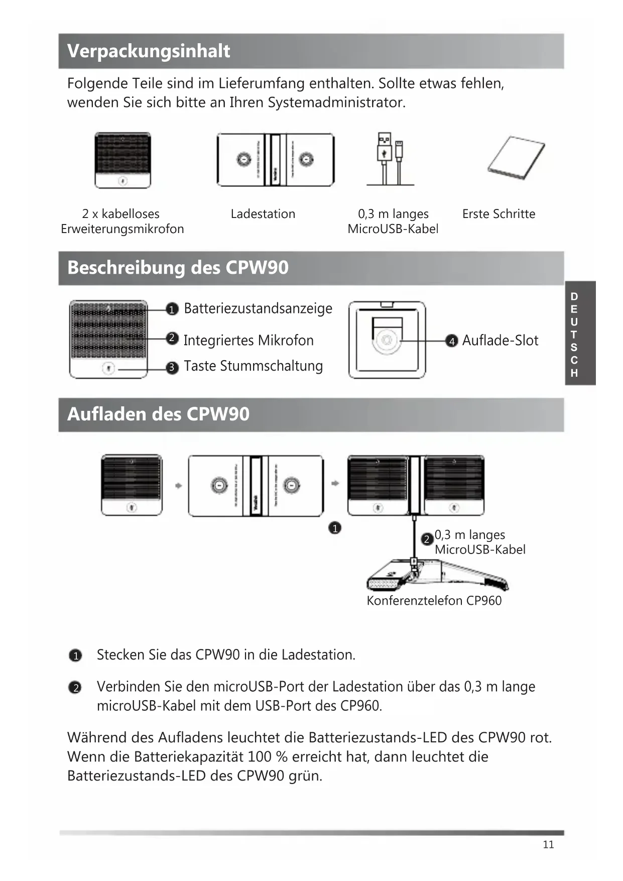 Verpackungsinhalt Beschreibung des CPW90 Aufladen des CPW90 Folgende Teile sind im Lieferumfang enthalten. Sollte etwas fehlen, wenden Sie sich bitte an Ihren Systemadministrator. Ladestation 2 x kabelloses Erweiterungsmikrofon 0,3 m langes MicroUSB-Kabel Erste Schritte 0,3 m langes MicroUSB-Kabel Konferenztelefon CP960 Stecken Sie das CPW90 in die Ladestation. Verbinden Sie den microUSB-Port der Ladestation über das 0,3 m lange microUSB-Kabel mit dem USB-Port des CP960. Während des Aufladens leuchtet die Batteriezustands-LED des CPW90 rot. Wenn die Batteriekapazität 100 % erreicht hat, dann leuchtet die Batteriezustands-LED des CPW90 grün.