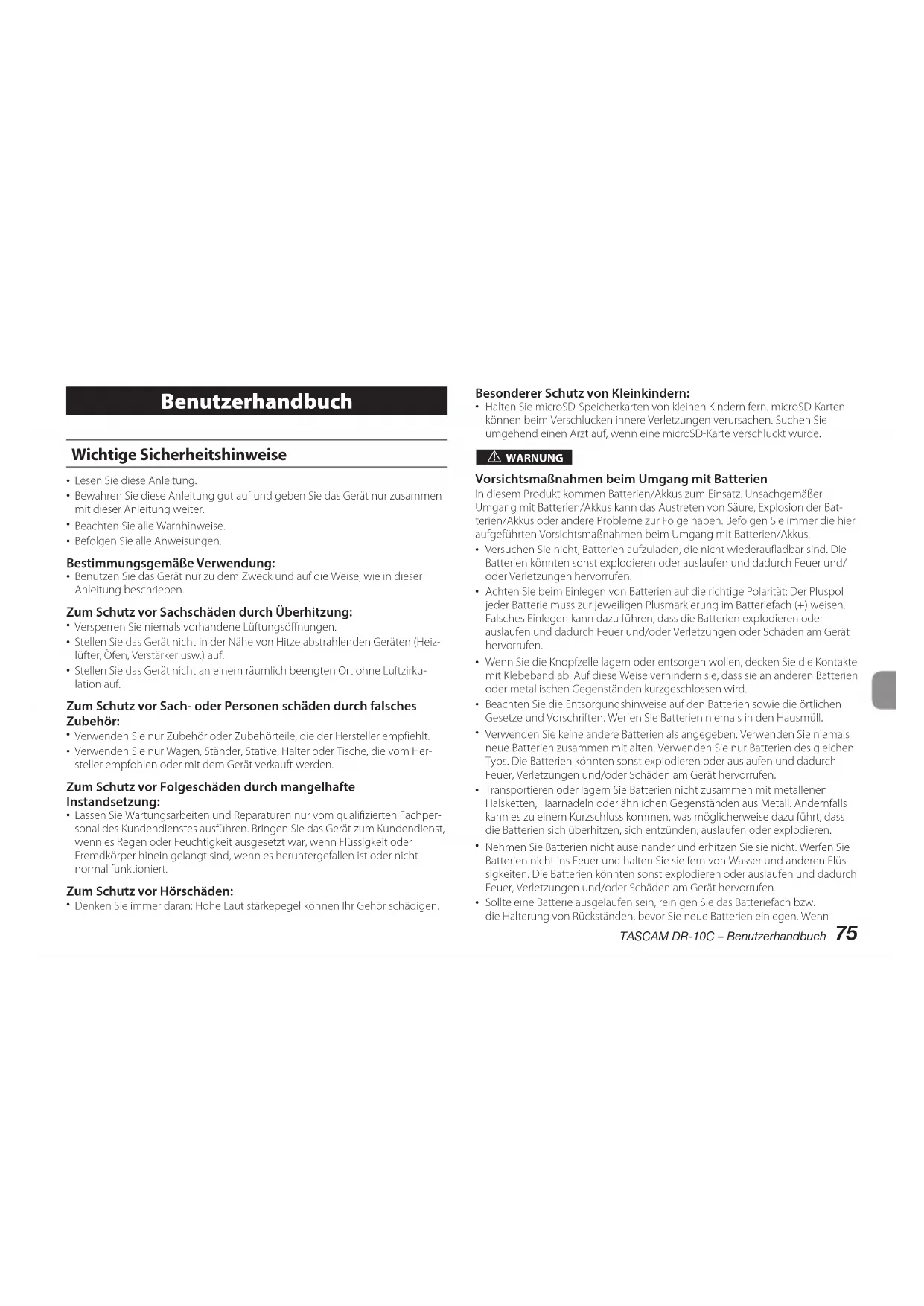 Sollte eine Batterie ausgelaufen sein, reinigen Sie das Batteriefach bzw. die Halterung von Rückständen, bevor Sie neue Batterien einlegen. Wenn76 TASCAM DR-10C – Benutzerhandbuch Batteriesäure ins Auge gelangt, kann dies zum Verlust des Augenlichts führen. Sollte Batteriesäure ins Auge gelangt sein, spülen Sie das Auge ohne zu reiben mit reichlich klarem Wasser aus, und suchen Sie anschließend sofort einen Augenarzt auf. Batteriesäure auf Haut oder Kleidung kann Verätzungen hervor- rufen. Waschen Sie die betroffenen Stellen mit klarem Wasser ab und suchen Sie dann sofort einen Arzt auf.