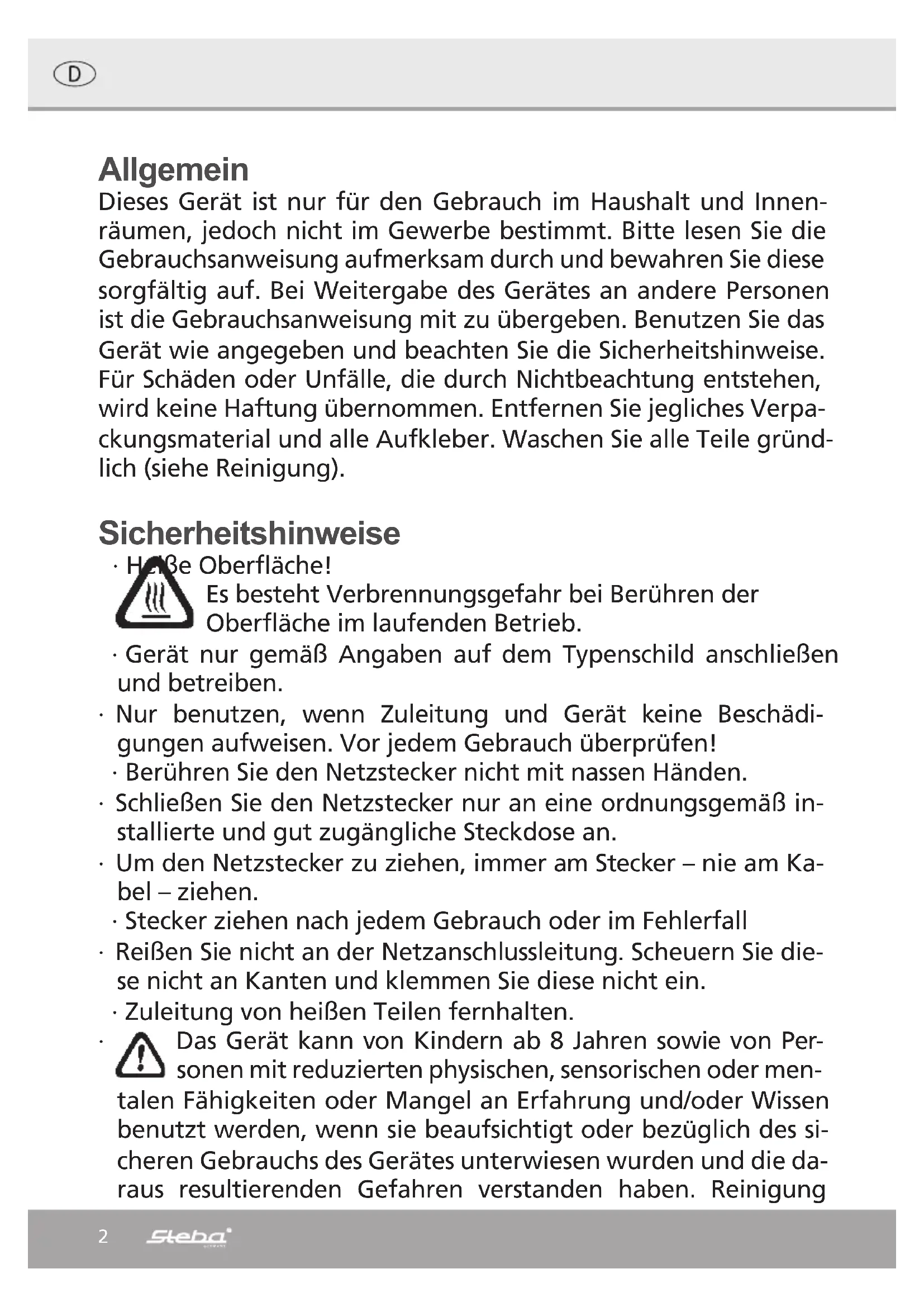 Elektro@steba.com www.steba.com Коммутатор: Тел. 09543-449-0 Факс 09543-449-19 Отдел сбыта: Тел. 09543-449-17 Факс 09543-449-18Art. Nr. 480-13658 Stand 01/2017 Steba Elektrogeräte GmbH & Co. KG Pointstraße 2, D-96129 Strullendorf Zentrale: Tel.: 09543-449- 0 Elektro@steba.com Fax: 09543-449-19 Vertrieb: Tel.: 09543-449-17 www.steba.com Tel.: 09543 -449-18 Garantie-Bedingungen Dieses Gerät ist nur für den Gebrauch im Haushalt bestimmt. Schäden am Gerät, die bei bestim- mungsgemäßem Gebrauch auf Werksfehler zurückzuführen sind und uns unverzüglich nach Feststellung und innerhalb der Garantiezeit nach Lieferung an den Endabnehmer mitgeteilt wurden, beheben wir nach Maßgabe der folgenden Bedingungen. Um Ihren Anspruch geltend zu machen, ist der original Verkaufsbeleg mit Verkaufsdatum beizulegen. Eine Garantiepflicht wird nicht ausgelöst durch geringfügige Abweichungen von der Soll-Be- schaffenheit, die für Wert- und Gebrauchstauglichkeit des Gerätes unerheblich sind sowie für Schäden aus nicht normalen Umweltbedingungen. Die Garantie erstreckt sich ausschließlich auf Mängel, welche auf Material- oder Herstellungsfehler zurückzuführen sind. Die Behebung von uns als garantiepflichtig anerkannter Mängel erfolgt dadurch, dass die mangelhaften Teile durch einwandfreie Teile ersetzt werden. Von der Garantie ausgeschlossen sind: ∙ Normaler Verschleiß ∙ Gebrauchsschäden an der Beschichtung ∙ Glasbruch ∙ Unsachgemäße Anwendung, wie Überlastung oder nicht zugelassene Zubehörteile ∙ Beschädigung durch Fremdeinwirkung, Gewaltanwendung oder Fremdkörper ∙ Schaden durch Nichtbeachtung der Gebrauchsanleitung z. B. falsche Netzspannung Geräte, für die unter Bezugnahme auf diese Garantie eine Mangelbeseitigung beansprucht wird, sind an uns sachgemäß verpackt, gereinigt, mit Fehlerangabe und einschließlich Kauf- beleg einzusenden. Ersetzte Teile gehen in unser Eigentum über. Der Garantieanspruch ist nicht übertragbar und erlischt bei unsachgemäßem Gebrauch oder Zweckentfremdung, wenn Reparaturen oder Eingriffe von dritter Seite vorgenommen wurden; und zwar unabhängig davon, ob die Beanstandung hierauf beruht. Garantieleistungen bewirken weder eine Verlän- gerung der Garantiefrist noch setzen sie eine neue Garantiefrist in Lauf. Die Garantiefrist für eingebaute Ersatzteile endet zum gleichen Zeitpunkt wie die Garantiefrist für das ganze Gerät. Kann der Mangel nicht beseitigt werden oder wird die Nachbesserung von uns abgelehnt oder unzumutbar verzögert, wird auf Wunsch des Endabnehmers innerhalb der gesetzlichen Garan- tiezeit ab Kauf- bzw. Lieferdatum entweder kostenfreier Ersatz geliefert oder der Minderwert vergütet oder das Gerät gegen Erstattung des Kaufpreises zurückgenommen. Weitergehende Ansprüche, insbesondere solche auf Ersatz außerhalb des Gerätes entstande- ner Schäden sind ausgeschlossen. Irrtümer und technische Änderungen vorbehalten, keine Haftung für Übersetzungsfehler