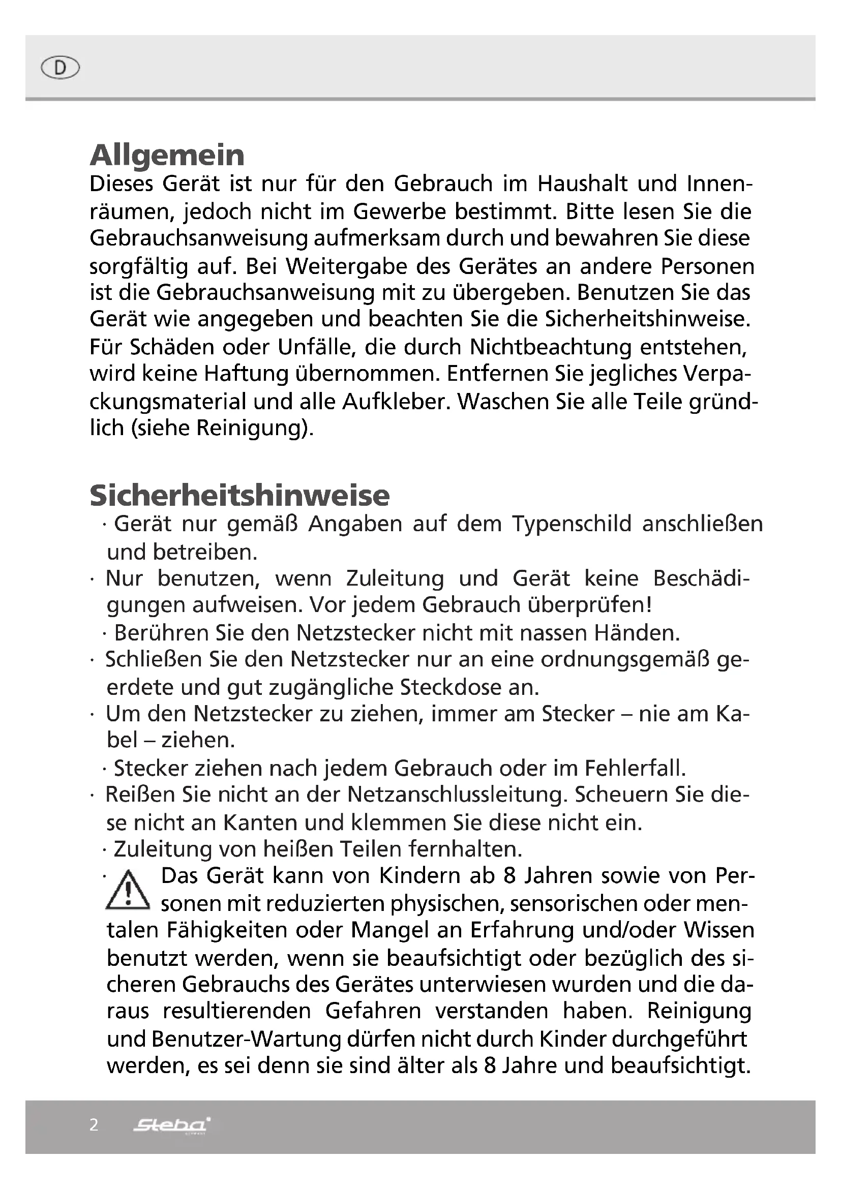 Das Gerät kann von Kindern ab 8 Jahren sowie von Per- sonen mit reduzierten physischen, sensorischen oder men- talen Fähigkeiten oder Mangel an Erfahrung und/oder Wissen benutzt werden, wenn sie beaufsichtigt oder bezüglich des si- cheren Gebrauchs des Gerätes unterwiesen wurden und die da- raus resultierenden Gefahren verstanden haben. Reinigung und Benutzer-Wartung dürfen nicht durch Kinder durchgeführt werden, es sei denn sie sind älter als 8 Jahre und beaufsichtigt.3 ∙ Kinder jünger als 8 Jahre sind vom Gerät und der Anschlusslei- tung fernzuhalten. ∙ Kinder sollten beaufsichtigt werden, um sicherzustellen, dass sie nicht mit dem Gerät oder dem Verpackungsmaterial spielen (z.B. Plastiktüten). ∙ Das Gerät darf nicht mit einer Zeitschaltuhr oder mit einem se- paraten Fernwirksystem betrieben werden! ∙ Bewahren Sie das Gerät nicht im Freien oder einem feuchten Raum auf. ∙ Tauchen Sie das Gerät niemals ins Wasser. ∙ Benutzen Sie das Gerät niemals nach einer Fehlfunktion, z.B. wenn es heruntergefallen ist oder auf eine andere Weise be- schädigt wurde. ∙ Der Hersteller übernimmt keine Verantwortung bei falschen oder unsachgemäßen Gebrauch, der durch die Nichtbeachtung der Gebrauchsanleitung zustande kommt. ∙ Um Gefährdungen zu vermeiden dürfen Reparaturen am Ge- rät, wie z.B. eine beschädigte Zuleitung austauschen, nur durch einen Kundendienst ausgeführt werden. Es dürfen nur original Ersatzteile verwendet werden. ∙ Das Gerät nur für die in der Bedienungsanleitung beschrie- benen Zwecke benutzen. ∙ Dieses Gerät ist dazu bestimmt im Haushalt und ähnlichen An- wendungen verwendet zu werden wie beispielsweise: o in Küchen für Mitarbeiter in Läden, Büros und anderen ge- werblichen Bereichen o in landwirtschaftlichen Anwesen und von Kunden in Hotels, Motels und anderen Wohneinrichtungen o in Frühstückspensionen. ∙ Vor dem ersten Gebrauch: Alle Teile gründlich reinigen und trocknen.