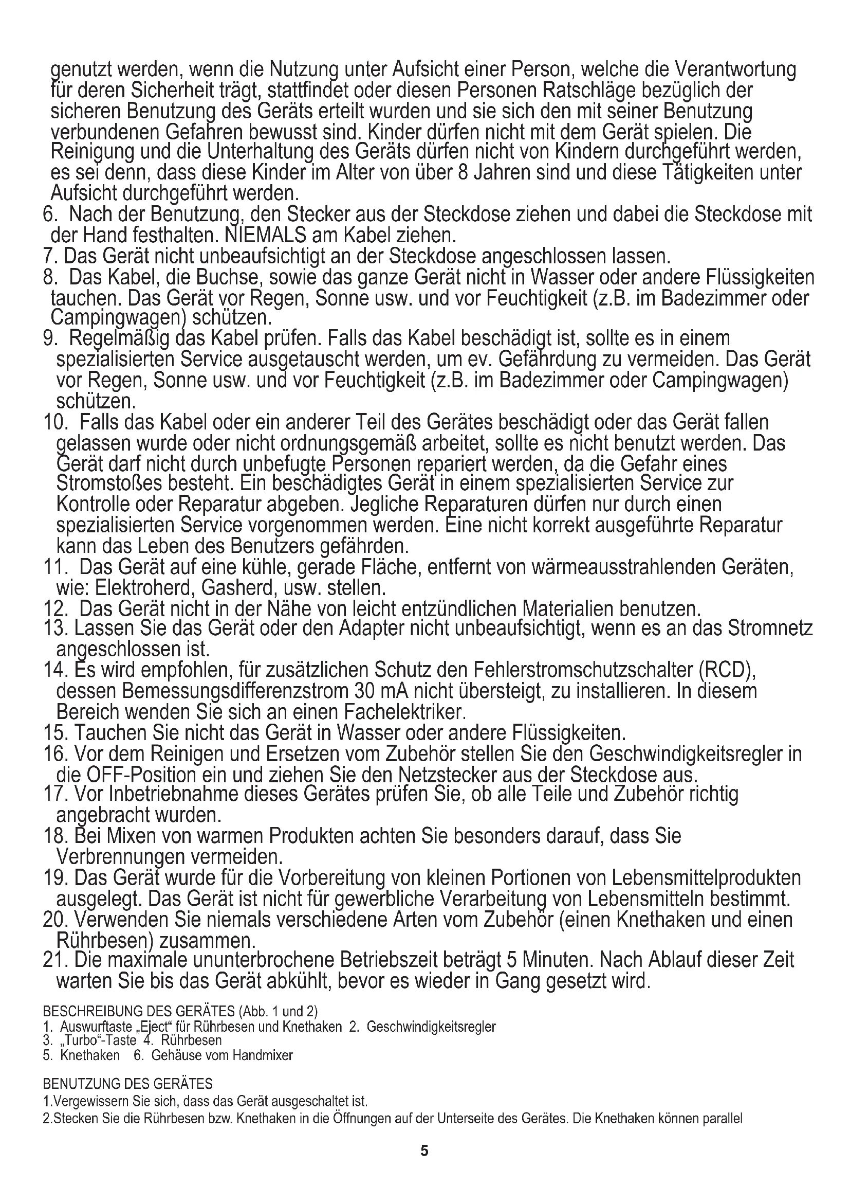 21. Die maximale ununterbrochene Betriebszeit beträgt 5 Minuten. Nach Ablauf dieser Zeit