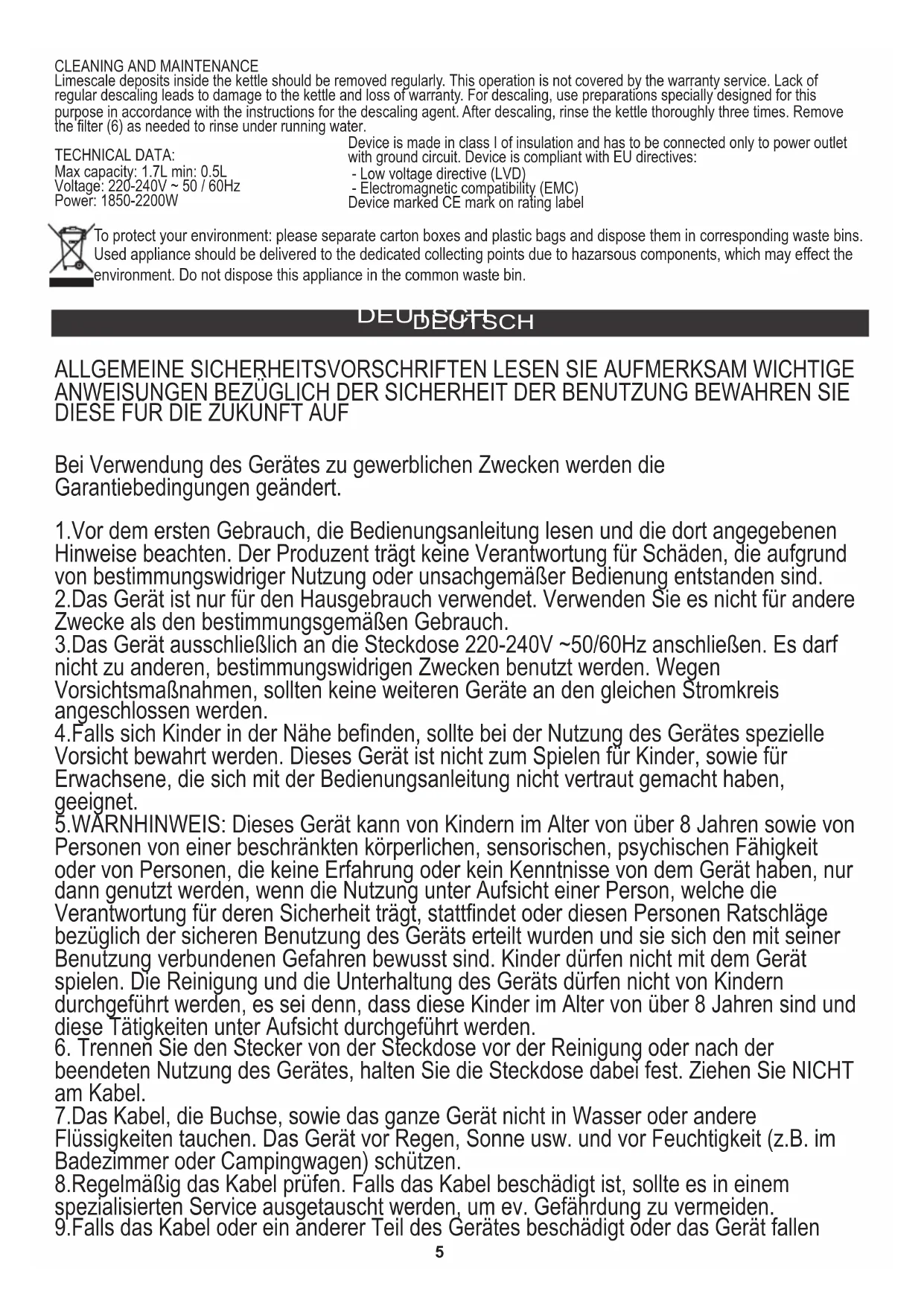 Voltage: 220-240V ~ 50 / 60Hz Power: 1850-2200W TECHNICAL DATA: 8.Regelmäßig das Kabel prüfen. Falls das Kabel beschädigt ist, sollte es in einem spezialisierten Service ausgetauscht werden, um ev. Gefährdung zu vermeiden. 5.WARNHINWEIS: Dieses Gerät kann von Kindern im Alter von über 8 Jahren sowie von Personen von einer beschränkten körperlichen, sensorischen, psychischen Fähigkeit oder von Personen, die keine Erfahrung oder kein Kenntnisse von dem Gerät haben, nur dann genutzt werden, wenn die Nutzung unter Aufsicht einer Person, welche die Verantwortung für deren Sicherheit trägt, stattfindet oder diesen Personen Ratschläge bezüglich der sicheren Benutzung des Geräts erteilt wurden und sie sich den mit seiner Benutzung verbundenen Gefahren bewusst sind. Kinder dürfen nicht mit dem Gerät spielen. Die Reinigung und die Unterhaltung des Geräts dürfen nicht von Kindern durchgeführt werden, es sei denn, dass diese Kinder im Alter von über 8 Jahren sind und diese Tätigkeiten unter Aufsicht durchgeführt werden.