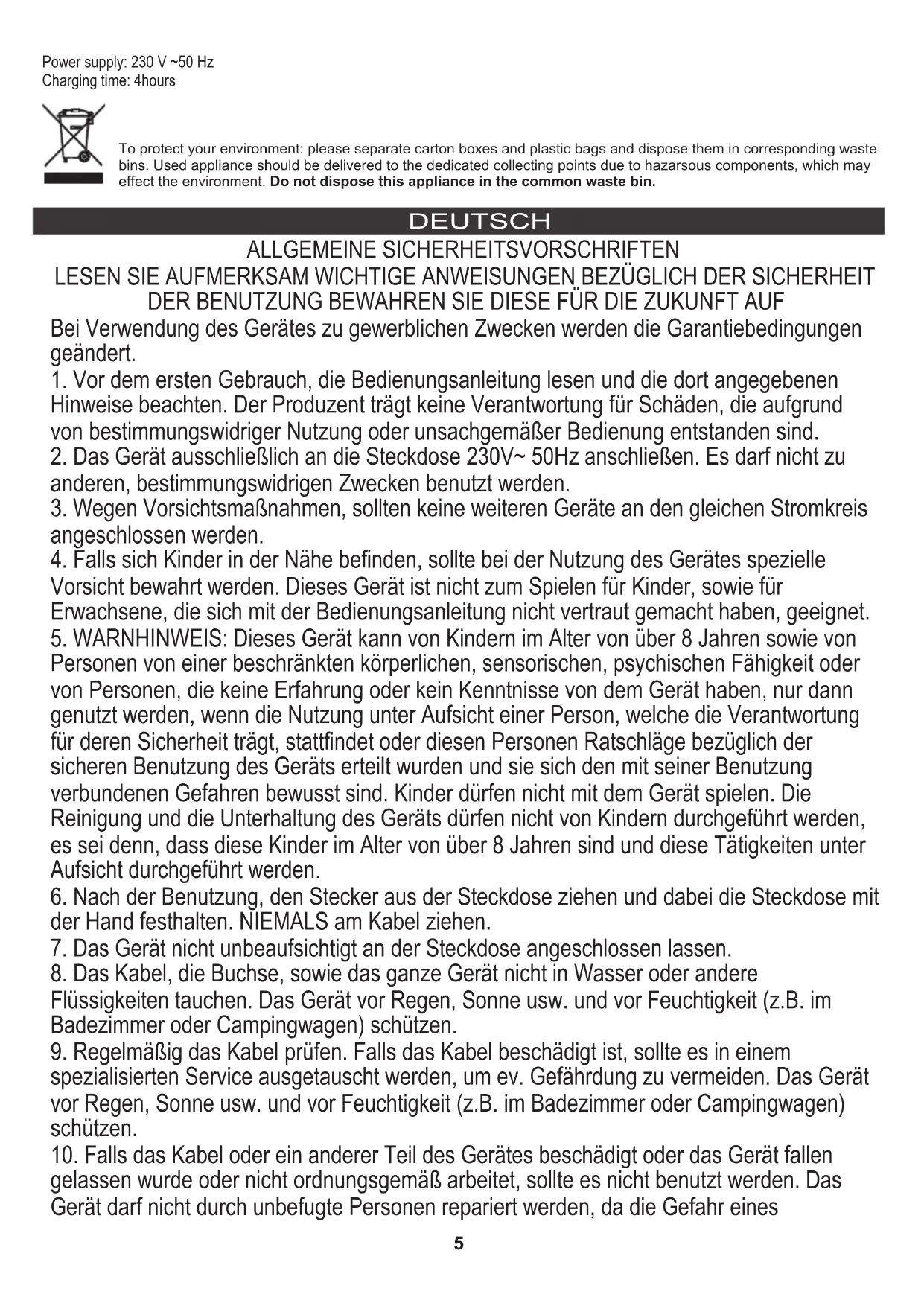 Vor Gebrauch laden Sie den Akku auf. Um den Ladevorgang zu starten, schließen Sie das Netzkabel an die Steckdose des Haarschneiders oder der Ladestation an und das Ladegerät an die Steckdose 100-240V ~50/60Hz. Dann leuchtet die grüne Diode des Ladevorgangs auf (Abb. 1, 4). Die Diode blinkt, bis das Gerät vom Netz getrennt wird oder das Gerät vollständig geladen ist, dann leuchtet 6die Diode grün auf und blinkt in 1-Sekunden-Intervallen. Der erste Ladevorgang dauert 12 Stunden und weitere – jeweils 4Stunden. Der vollständig aufgeladene Akku hält bis 300Minuten Dauerbetrieb. Nach Beendigung des Ladevorgangs ziehen Sie das Ladegerät aus der Steckdose. Wenn der Haarschneider eine längere Zeit nicht benutzt wird, sollte man das Gerät mindestens 1-mal pro 6 Monate aufladen, um eine entsprechende Akku-Kapazität zu erhalten. Nach Akku-Entladung darf der Rasiervorgang mit Verwendung des Ladegerätes fortgesetzt werden. Hierzu stecken Sie den Kabelstecker vom Ladegerät in die Steckdose am Haarschneidergerät. Nach Ablauf von 2 Minuten darf man den Rasiervorgang fortsetzen.BENUTZUNG DES RASIERGERÄTES Wählen Sie mit dem Regler die gewünschte Schneidelänge (Abb. 1, 2) und verfolgen Sie dabei den Verstellbereich der Schneidelänge (Abb. 1, 3). Um den Kamm zu wechseln, sollte man das Gerät abschalten, denn Kamm entfernen (Abb. 5) und einen neuen Kamm aufsetzen (Abb. 4). Starten Sie den Rasiervorgang, indem Sie die gewünschte Drehgeschwindigkeit wählen und das Gerät samt Kammaufsatz in der Richtung „gegen den Strich“ führen. Diese Tätigkeit ist langsam und mit ständiger Geschwindigkeit durchzuführen. Achten Sie auf systematisches Entfernen der Haare aus dem Rasiergerät und Schneidekopf.REINIGUNGTrennen Sie das Gerät von der Stromversorgung. Entfernen Sie den Kopfteil (Abb. 2). Reinigen Sie die Schneiden mit beigefügter Bürste. Nach der Reinigung sollten keine Haare zwischen den Schneiden übrig bleiben. Jeweils nach mehreren Schneide- und Rasiervorgängen schmieren Sie den Schneidekopf mit 2-3 Tropfen Maschinenöl – siehe den auf der Abbildung 5 dargestellten Platz. Den Kopfteil zumachen (Abb. 3). Das Gehäuse mit trockenem oder leicht feuchtem Tuch reinigen. TECHNISCHE DATENStromversorgung: 230V~50HzLadedauer: 4Stunden