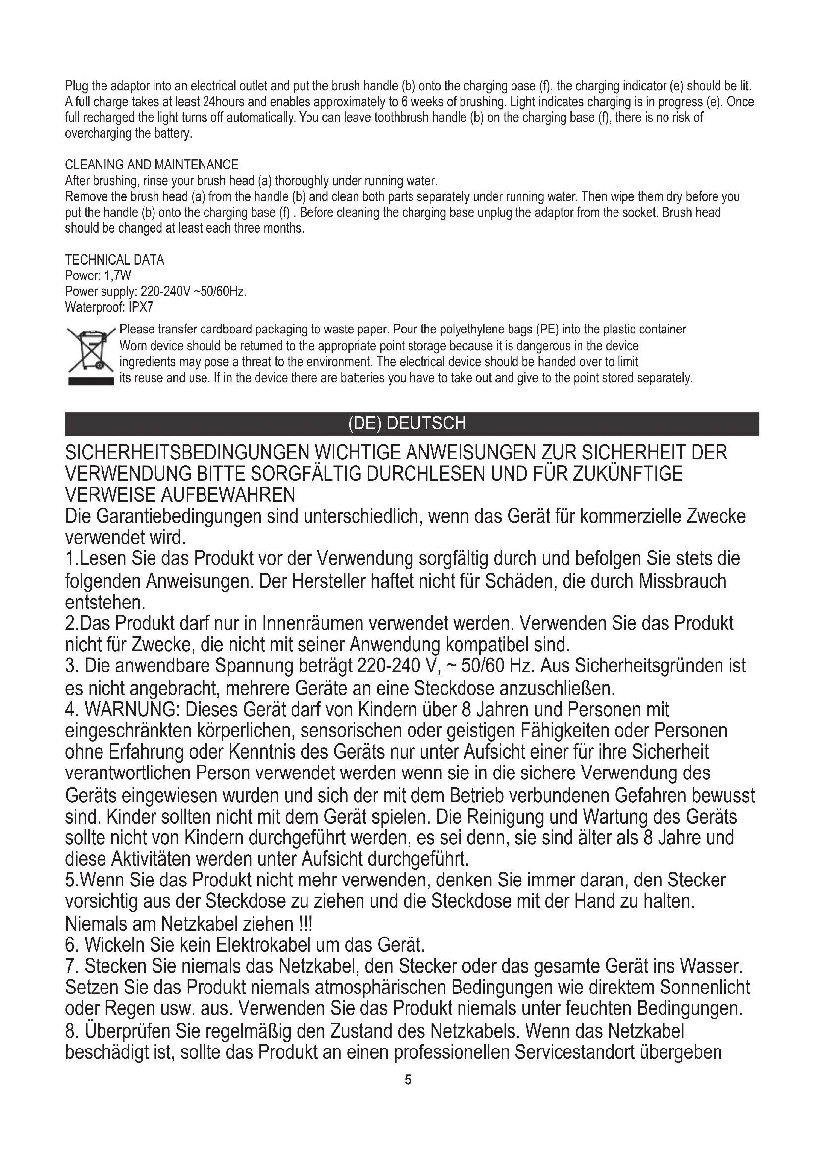 Spülen Sie Ihren Bürstenkopf (a) nach dem Bürsten gründlich unter fließendem Wasser ab. Entfernen Sie den Bürstenkopf (a) vom Griff (b) und reinigen Sie beide Teile getrennt unter fließendem Wasser. Wischen Sie sie dann trocken, bevor Sie den Griff (b) auf die Ladestation (f) setzen. Ziehen Sie vor dem Reinigen der Ladestation den Adapter aus der Steckdose. Der Bürstenkopf sollte mindestens alle drei Monate gewechselt werden. TECHNISCHE DATEN Leistung: 1,7W Stromversorgung: 220-240 V ~ 50/60 Hz. Wasserdicht: IPX7 umdrehen. Wenn es immer noch nicht passt, wenden Sie sich an einen qualifizierten Elektriker. Versuchen Sie nicht, diese Sicherheitsfunktion zu deaktivieren. 28.Verwenden Sie nur die vom Hersteller empfohlenen Anhänge.