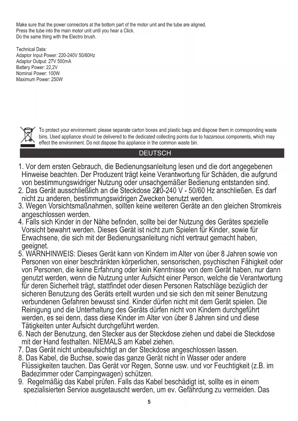 NICHT WÄHREND NASS ODER FEUCHT EINSETZEN ODER ZUSAMMENBAUEN. SICHERSTELLEN, DASS ALLE TEILE VOR DER MONTAGE TROCKEN SIND. BENUTZEN SIE DAS GERÄT NICHT OHNE FILTER. Versammlung:8 Drücken Sie den oberen Teil des Behälters fest gegen die Motoreinheit, bis Sie ein Klicken hören. Tube und Electro Brush. Um das Gerät zu verwenden, wird empfohlen, dass Sie die Röhre und die Elektrobürste verwenden. Stecken Sie dazu bitte das Rohr (7) in die Hauptmotoreinheit. Stellen Sie sicher, dass die Stromanschlüsse am unteren Teil der Motoreinheit und am Schlauch ausgerichtet sind. Drücken Sie den Schlauch in die Hauptmotoreinheit, bis Sie ein Klicken hören. Machen Sie dasselbe mit der Elektrobürste. Technische Daten: Adapter Eingangsleistung: 220-240V 50 / 60Hz Adapterausgang: 27V 500mA Batterieleistung: 22,2V Nennleistung: 100W Maximale Leistung: 250W Bitte ähneln Sie den Filtern und der Tasse, indem Sie die Reinigungsanweisungen rückwärts befolgen. Danach richten Sie den Becher bitte auf die Motoreinheit aus. Am Boden des Staubbehälters befindet sich eine Nut. Stellen Sie den Behälterboden wie in Abbildung 2 gezeigt darauf. Den Pappkarton im Altpapier entsorgen. Polyäthylenbeutel (PE) in dem Behälter für Kunststoff entsorgen. Das abgenutzte Gerät zum Recycling zu einer offiziellen Sammelstelle bringen, da es gefährliche Substanzen enthält, die die Umwelt gefährden können. Das Gerät sollte in einer Form abgegeben werden, die eine weitere Nutzung unmöglich macht. Wenn es Batterien enthält, sollten diese rausgenommen und separat an einer Sammelstelle abgegeben werden. Das Gerät darf nicht in den Hausmüll rausgeworfen werden!!