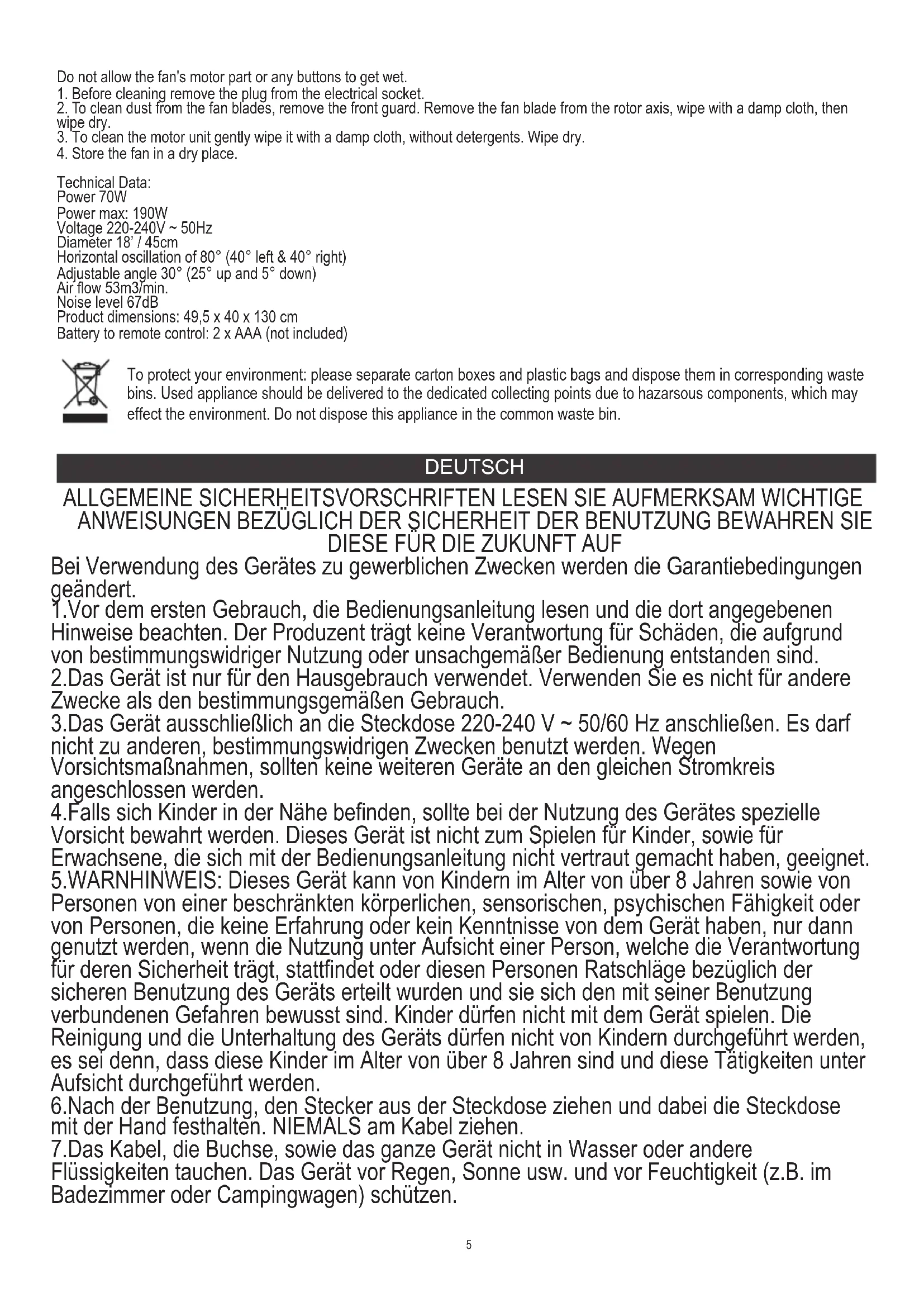 Technical Data: Power 70W Power max: 190W Voltage 220-240V ~ 50Hz Diameter 18’ / 45cm Horizontal oscillation of 80° (40° left & 40° right) Adjustable angle 30° (25° up and 5° down) Air flow 53m3/min. Noise level 67dB Product dimensions: 49,5 x 40 x 130 cm Battery to remote control: 2 x AAA (not included)6 8.Regelmäßig das Kabel prüfen. Falls das Kabel beschädigt ist, sollte es in einem spezialisierten Service ausgetauscht werden, um ev. Gefährdung zu vermeiden. 9.Falls das Kabel oder ein anderer Teil des Gerätes beschädigt oder das Gerät fallen gelassen wurde oder nicht ordnungsgemäß arbeitet, sollte es nicht benutzt werden. Das Gerät darf nicht durch unbefugte Personen repariert werden, da die Gefahr eines Stromstoßes besteht. Ein beschädigtes Gerät in einem spezialisierten Service zur Kontrolle oder Reparatur abgeben. Jegliche Reparaturen dürfen nur durch einen spezialisierten Service vorgenommen werden. Eine nicht korrekt ausgeführte Reparatur kann das Leben des Benutzers gefährden. 10.Das Gerät auf eine kühle, gerade Fläche, entfernt von wärmeausstrahlenden Geräten, wie: Elektroherd, Gasherd, usw. stellen. 11.Das Gerät nicht in der Nähe von leicht entzündlichen Materialien benutzen. 12.Das Kabel darf nicht außerhalb der Tischkante hängen oder heiße Flächen berühren. 13.Lassen Sie das Gerät oder den Adapter nicht unbeaufsichtigt, wenn es an das Stromnetz angeschlossen ist. 14.Es wird empfohlen, für zusätzlichen Schutz den Fehlerstromschutzschalter (RCD), dessen Bemessungsdifferenzstrom 30 mA nicht übersteigt, zu installieren. In diesem Bereich wenden Sie sich an einen Fachelektriker.