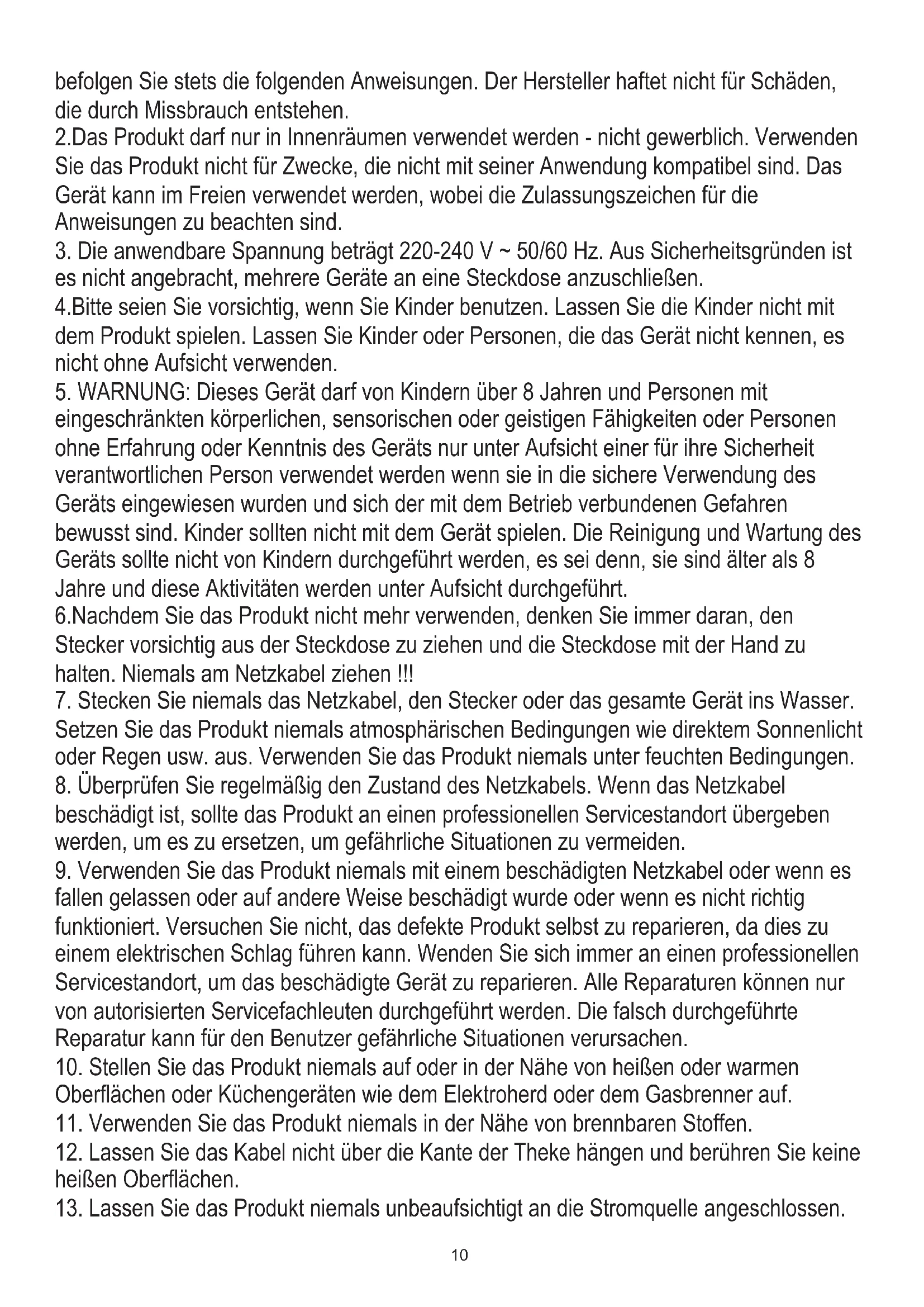 eingeschränkten körperlichen, sensorischen oder geistigen Fähigkeiten oder Personen ohne Erfahrung oder Kenntnis des Geräts nur unter Aufsicht einer für ihre Sicherheit verantwortlichen Person verwendet werden wenn sie in die sichere Verwendung des Geräts eingewiesen wurden und sich der mit dem Betrieb verbundenen Gefahren bewusst sind. Kinder sollten nicht mit dem Gerät spielen. Die Reinigung und Wartung des Geräts sollte nicht von Kindern durchgeführt werden, es sei denn, sie sind älter als 8 Jahre und diese Aktivitäten werden unter Aufsicht durchgeführt. 6.Nachdem Sie das Produkt nicht mehr verwenden, denken Sie immer daran, den Stecker vorsichtig aus der Steckdose zu ziehen und die Steckdose mit der Hand zu halten. Niemals am Netzkabel ziehen !!!