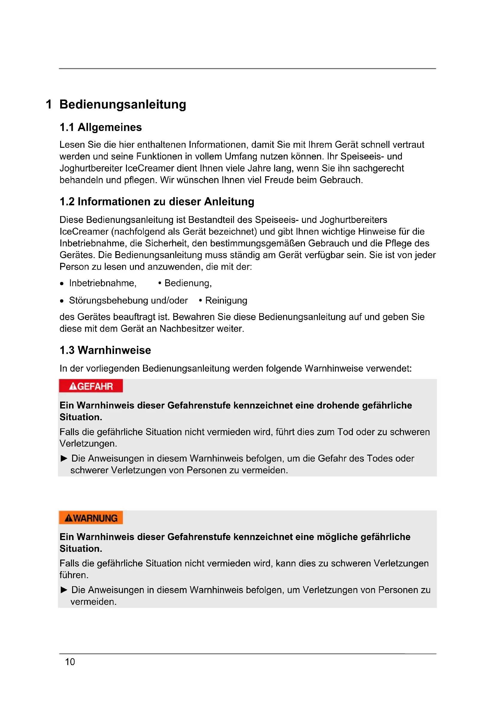 These Bedienungsanleitung ist Bestandteil des Speiseeis- und Joghurtbereiters IceCreamer (nachfolgend als Gerät bezeichnet) und gibt Ihnen wichtige Hinweise für die Inbetriebnahme, die Sicherheit, den bestimmungsgemäßen Gebrauch und die Pflege des Gerätes. Die Bedienungsanleitung muss ständig am Gerät verfügbar sein. Sie ist von jeder Person zulesen und anzuwenden, die mit der: