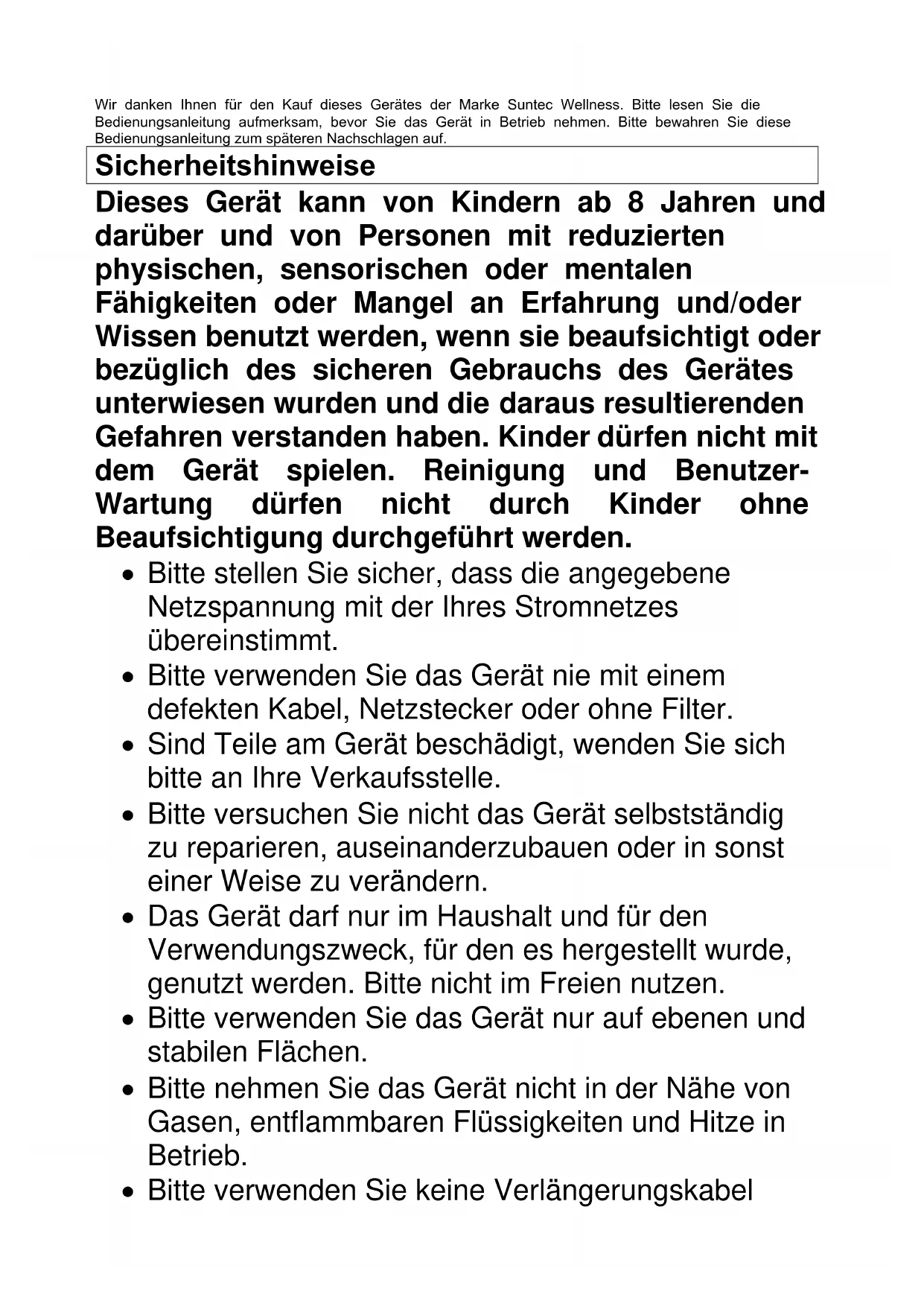 Bedienungsanleitung DEWir danken Ihnen für den Kauf dieses Gerätes der Marke Suntec Wellness. Bitte lesen Sie die Bedienungsanleitung aufmerksam, bevor Sie das Gerät in Betrieb nehmen. Bitte bewahren Sie diese Bedienungsanleitung zum späteren Nachschlagen auf. Sicherheitshinweise Dieses Gerät kann von Kindern ab 8 Jahren und darüber und von Personen mit reduzierten physischen, sensorischen oder mentalen Fähigkeiten oder Mangel an Erfahrung und/oder Wissen benutzt werden, wenn sie beaufsichtigt oder bezüglich des sicheren Gebrauchs des Gerätes unterwiesen wurden und die daraus resultierenden Gefahren verstanden haben. Kinder dürfen nicht mit dem Gerät spielen. Reinigung und Benutzer- Wartung dürfen nicht durch Kinder ohne Beaufsichtigung durchgeführt werden.