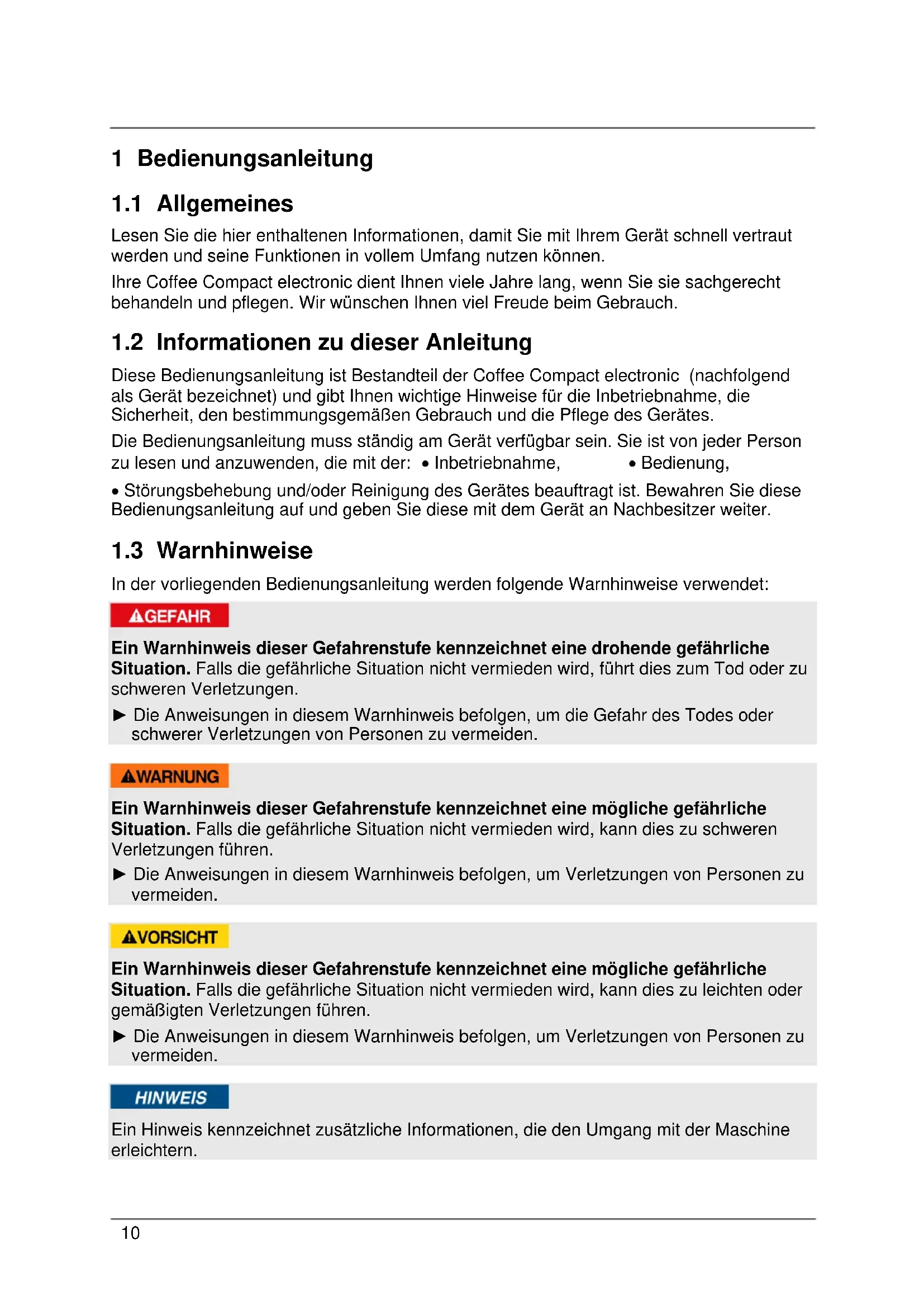 Diese Bedienungsanleitung ist Bestandteil der Coffee Compact electronic (nachfolgend als Gerät bezeichnet) und gibt Ihnen wichtige Hinweise für die Inbetriebnahme, die Sicherheit, den bestimmungsgemäßen Gebrauch und die Pflege des Gerätes. Die Bedienungsanleitung muss ständig am Gerät verfügbar sein. Sie ist von jeder Person zu lesen und anzuwenden, die mit der: • Inbetriebnahme, • Bedienung,