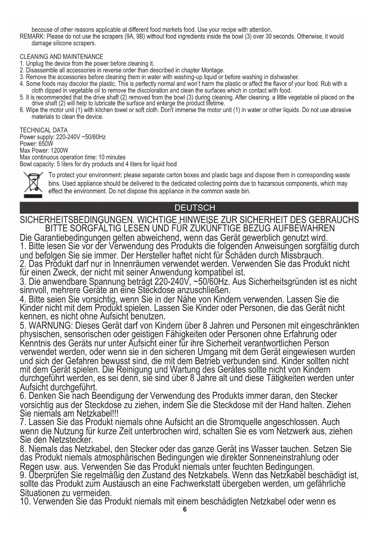 4. Some foods may discolor the plastic. This is perfectly normal and won’t harm the plastic or affect the flavor of your food. Rub with a cloth dipped in vegetable oil to remove the discoloration and clean the surfaces which in contact with food. 5. It is recommended that the drive shaft (2) removed from the bowl (3) during cleaning. After cleaning, a little vegetable oil placed on the drive shaft (2) will help to lubricate the surface and enlarge the product lifetime. 6. Wipe the motor unit (1) with kitchen towel or soft cloth. Don't immerse the motor unit (1) in water or other liquids. Do not use abrasive materials to clean the device. TECHNICAL DATA Power supply: 220-240V ~50/60Hz Power: 650W Max Power: 1200W Max continuous operation time: 10 minutes Bowl capacity: 5 liters for dry products and 4 liters for liquid food7 heruntergefallen oder auf andere Weise beschädigt wurde oder wenn es nicht richtig funktioniert. Versuchen Sie nicht, das defekte Produkt selbst zu reparieren, da dies zu einem Stromschlag führen kann. Bringen Sie das beschädigte Gerät immer zu einer Fachwerkstatt, um es reparieren zu lassen. Alle Reparaturen dürfen nur von autorisierten Servicetechnikern durchgeführt werden. Die unsachgemäß durchgeführte Reparatur kann zu gefährlichen Situationen für den Benutzer führen.