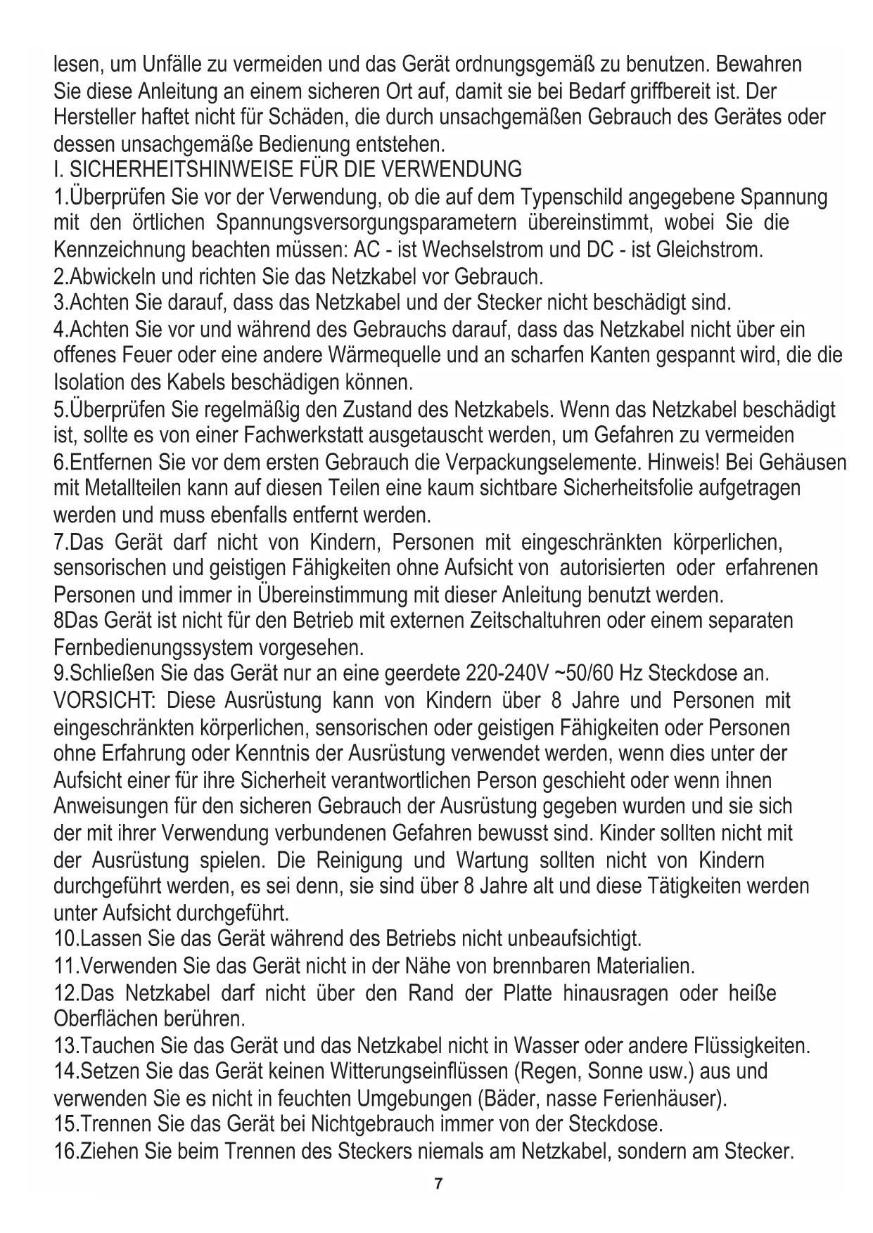 8Das Gerät ist nicht für den Betrieb mit externen Zeitschaltuhren oder einem separaten Fernbedienungssystem vorgesehen. 1.Überprüfen Sie vor der Verwendung, ob die auf dem Typenschild angegebene Spannung mit den örtlichen Spannungsversorgungsparametern übereinstimmt, wobei Sie die Kennzeichnung beachten müssen: AC - ist Wechselstrom und DC - ist Gleichstrom. 11.Verwenden Sie das Gerät nicht in der Nähe von brennbaren Materialien. 10.Lassen Sie das Gerät während des Betriebs nicht unbeaufsichtigt. 16.Ziehen Sie beim Trennen des Steckers niemals am Netzkabel, sondern am Stecker. 12.Das Netzkabel darf nicht über den Rand der Platte hinausragen oder heiße Oberflächen berühren. 14.Setzen Sie das Gerät keinen Witterungseinflüssen (Regen, Sonne usw.) aus und verwenden Sie es nicht in feuchten Umgebungen (Bäder, nasse Ferienhäuser). 13.Tauchen Sie das Gerät und das Netzkabel nicht in Wasser oder andere Flüssigkeiten. 15.Trennen Sie das Gerät bei Nichtgebrauch immer von der Steckdose. 9.Schließen Sie das Gerät nur an eine geerdete 220-240V ~50/60 Hz Steckdose an. VORSICHT: Diese Ausrüstung kann von Kindern über 8 Jahre und Personen mit eingeschränkten körperlichen, sensorischen oder geistigen Fähigkeiten oder Personen ohne Erfahrung oder Kenntnis der Ausrüstung verwendet werden, wenn dies unter der Aufsicht einer für ihre Sicherheit verantwortlichen Person geschieht oder wenn ihnen Anweisungen für den sicheren Gebrauch der Ausrüstung gegeben wurden und sie sich der mit ihrer Verwendung verbundenen Gefahren bewusst sind. Kinder sollten nicht mit der Ausrüstung spielen. Die Reinigung und Wartung sollten nicht von Kindern durchgeführt werden, es sei denn, sie sind über 8 Jahre alt und diese Tätigkeiten werden unter Aufsicht durchgeführt.8 22.Das Gerät ist in Klasse I des Brandschutzes hergestellt und sollte daher ausschließlich an entstehen. 18.Es ist zu beachten, dass einige Teile des Geräts und des Gehäuses während des Betrieb sehr heiß werden, achten Sie also darauf, sie nicht zu berühren, da sie sonst verbrannt werden 19.Verwenden Sie das Gerät nur auf einem trockenen und stabilen Untergrund. 20.Decken Sie das Gerät NIEMALS während des Betriebs oder wenn es nicht vollständig 17.Der Hersteller haftet nicht für Schäden, die durch unsachgemäßen Gebrauch des Gerätes können. abgekühlt ist. abzukühlen. 21.Beachten Sie, dass die Heizelemente des Gerätes Zeit benötigen, um vollständig Gerät herum vorhanden ist. Berühren Sie beim Gebrauch des Geräts keine brennbare 3.Stellen Sie keine leeren Behälter oder Geschirr auf das Gerät Zur Erhöhung der Sicherheit wird empfohlen, die elektrische Anlage mit einem automatischen Fehlerstromschutzschalter mit einem Anlaufstrom von 30 mA auszurüsten. 25.Das Gerät kann nicht mit externen Zeitschaltuhren oder anderen separaten 1.Verwenden Sie das Gerät nur in Innenräumen Oberflächen. In diesem Fall wird empfohlen, Isolierpads zu verwenden. Fernbedienungssystemen verwendet werden. die mit einem Schutzstift versehene Steckdose angeschlossen werden. 4.Verwenden Sie keinen Elektroherd, um Räume zu beheizen und brennbare, explosive, schädliche, flüchtige oder andere Flüssigkeiten oder Materialien zu erhitzen.