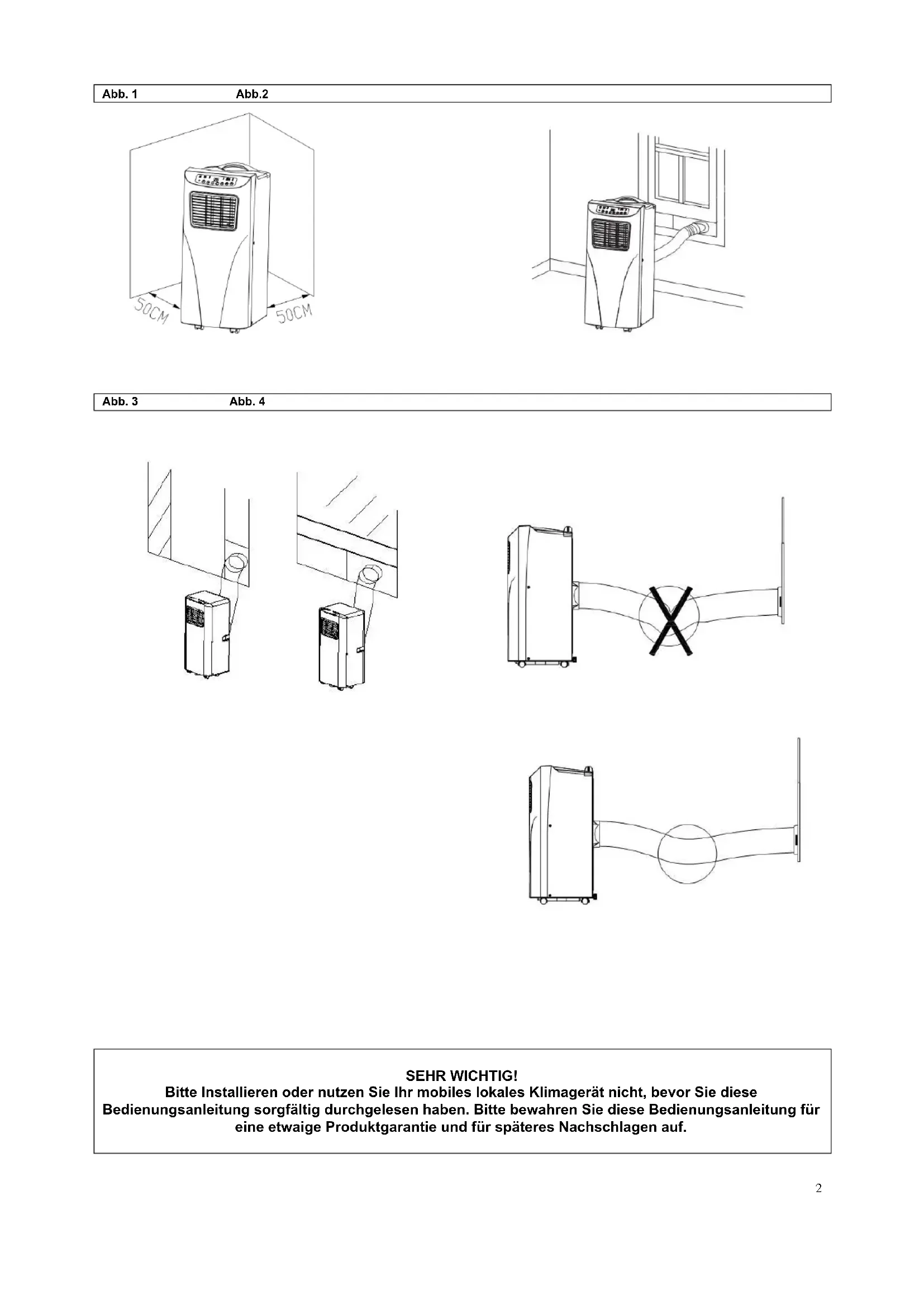 Installation Das Gerät sollte auf dem Boden 50 cm von anderen Objekten platziert werden, da diese die Leistung des Gerätes stark beeinflussen können (Abb. 1). Warnung:Bevor Sie dieses Gerät benutzen, sollten Sie es mindestens 24 Stunden aufrecht stehen lassen. Das Gerät kann problemlos zwischen den Räumen bewegt werden, bitte beachten Sie dennoch folgende Hinweise: Installation des Abluftschlauches, Abb. 2 und 3 1) Bitte stellen Sie das Gerät in der Nähe einer Steckdose auf. 2) Bitte befestigen Sie die Adapter an den Enden des Abluftschlauches.