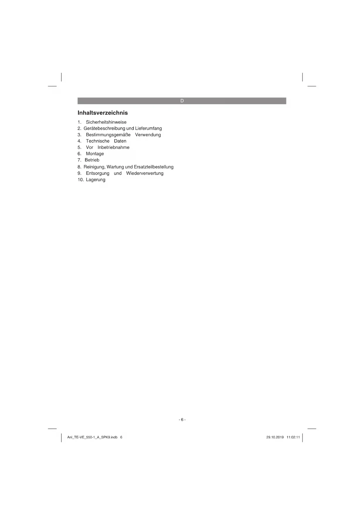 Gefahr! - Zur Verringerung des Verletzungsrisikos Bedienungsanleitung lesen Vorsicht! Tragen Sie einen Gehörschutz. Die Einwirkung von Lärm kann Gehörverlust bewirken. Vorsicht! Tragen Sie eine Staubschutzmaske. Beim Bearbeiten von Holz und anderer Materialien kann gesundheitsschädlicher Staub entstehen. Asbesthaltiges Material darf nicht bearbeitet werden! Anl_TE-VE_550-1_A_SPK9.indb 7Anl_TE-VE_550-1_A_SPK9.indb 7 29.10.2019 11:02:1229.10.2019 11:02:12D