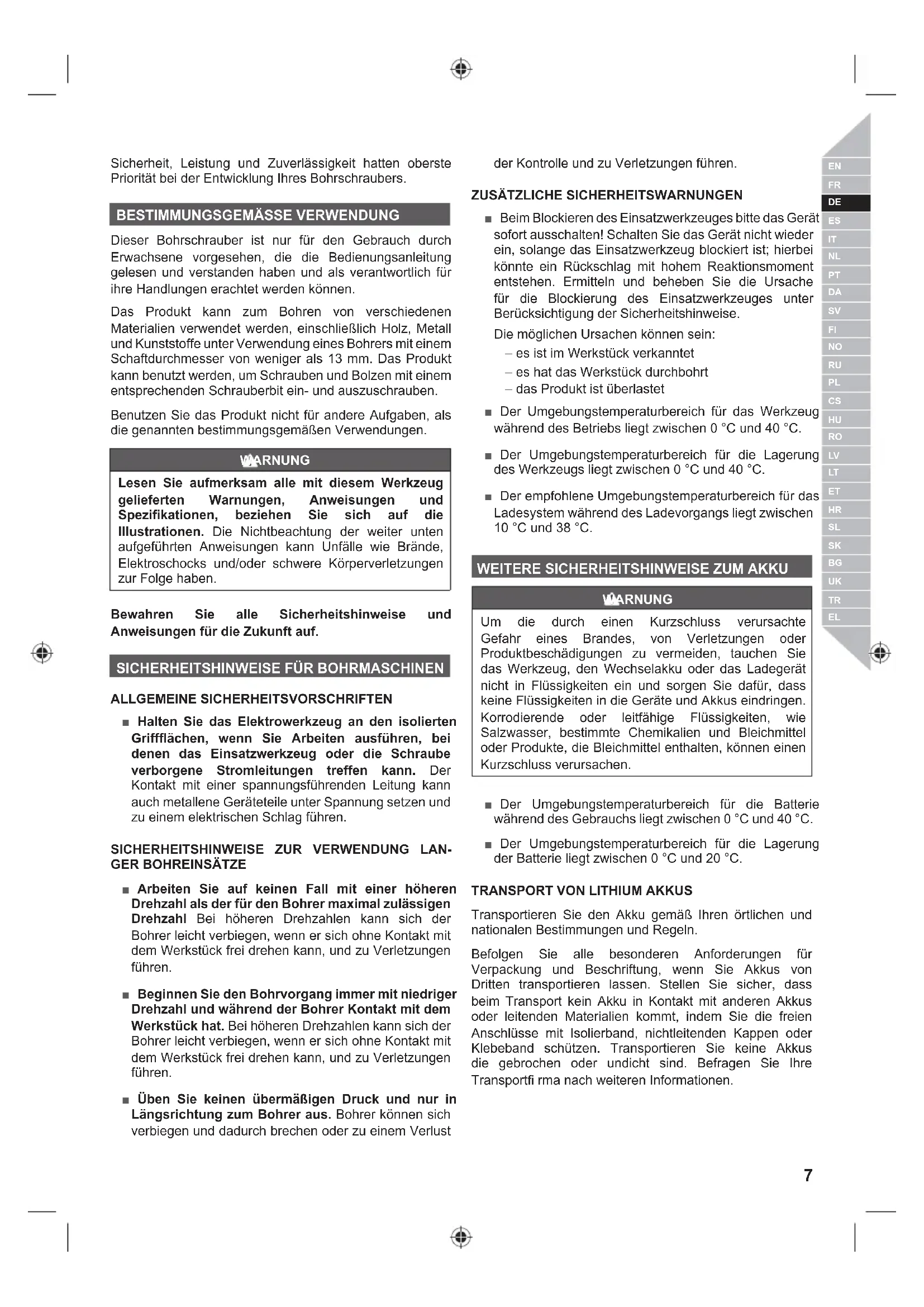 Dieser Bohrschrauber ist nur für den Gebrauch durch Erwachsene vorgesehen, die die Bedienungsanleitung gelesen und verstanden haben und als verantwortlich für ihre Handlungen erachtet werden können. Das Produkt kann zum Bohren von verschiedenen Materialien verwendet werden, einschließlich Holz, Metall und Kunststoffe unter Verwendung eines Bohrers mit einem Schaftdurchmesser von weniger als 13 mm. Das Produkt kann benutzt werden, um Schrauben und Bolzen mit einem entsprechenden Schrauberbit ein- und auszuschrauben. Benutzen Sie das Produkt nicht für andere Aufgaben, als die genannten bestimmungsgemäßen Verwendungen. WARNUNG Lesen Sie aufmerksam alle mit diesem Werkzeug gelieferten Warnungen, Anweisungen und Spezifikationen, beziehen Sie sich auf die Illustrationen. Die Nichtbeachtung der weiter unten aufgeführten Anweisungen kann Unfälle wie Brände, Elektroschocks und/oder schwere Körperverletzungen zur Folge haben. Bewahren Sie alle Sicherheitshinweise und Anweisungen für die Zukunft auf.