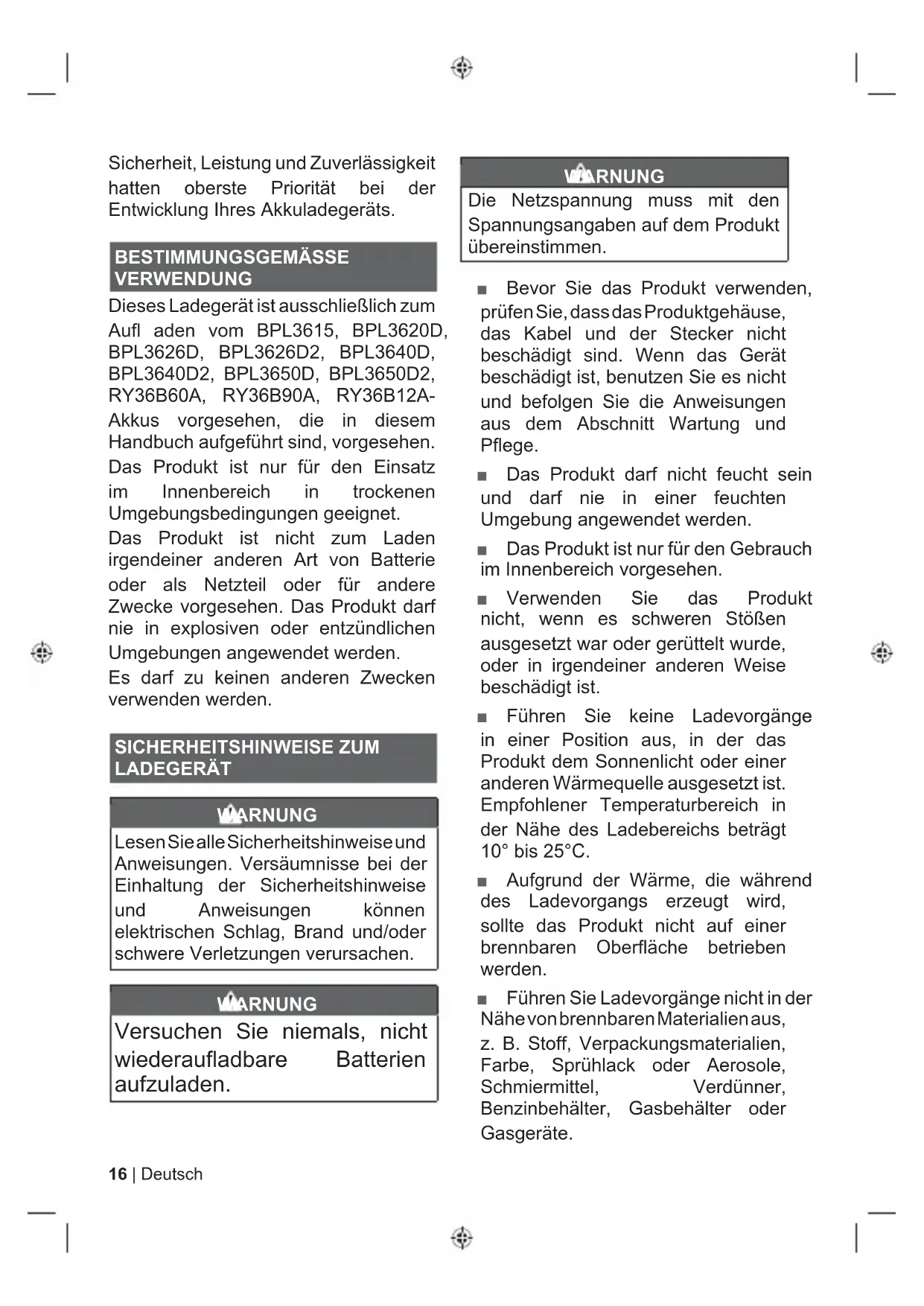En charge Charge rapide Clignotant — Batterie trop déchargée Clignotant Le chargeur pré-charge la batterie jusqu'à ce qu'une tension normale soit atteinte, puis passe en mode de charge rapide. Batterie rechargée — Allumé Le mode charge rapide est terminé, le chargeur continue de charger.16 | Deutsch Sicherheit, Leistung und Zuverlässigkeit hatten oberste Priorität bei der Entwicklung Ihres Akkuladegeräts. BESTIMMUNGSGEMÄSSE VERWENDUNG Dieses Ladegerät ist ausschließlich zum Aufl aden vom BPL3615, BPL3620D, BPL3626D, BPL3626D2, BPL3640D, BPL3640D2, BPL3650D, BPL3650D2, RY36B60A, RY36B90A, RY36B12A- Akkus vorgesehen, die in diesem Handbuch aufgeführt sind, vorgesehen. Das Produkt ist nur für den Einsatz im Innenbereich in trockenen Umgebungsbedingungen geeignet. Das Produkt ist nicht zum Laden irgendeiner anderen Art von Batterie oder als Netzteil oder für andere Zwecke vorgesehen. Das Produkt darf nie in explosiven oder entzündlichen Umgebungen angewendet werden. Es darf zu keinen anderen Zwecken verwenden werden. SICHERHEITSHINWEISE ZUM LADEGERÄT WARNUNG Lesen Sie alle Sicherheitshinweise und Anweisungen. Versäumnisse bei der Einhaltung der Sicherheitshinweise und Anweisungen können elektrischen Schlag, Brand und/oder schwere Verletzungen verursachen. WARNUNG Versuchen Sie niemals, nicht wiederaufladbare Batterien aufzuladen. WARNUNG Die Netzspannung muss mit den Spannungsangaben auf dem Produkt übereinstimmen. ■ Bevor Sie das Produkt verwenden, prüfen Sie, dass das Produktgehäuse, das Kabel und der Stecker nicht beschädigt sind. Wenn das Gerät beschädigt ist, benutzen Sie es nicht und befolgen Sie die Anweisungen aus dem Abschnitt Wartung und Pflege. ■ Das Produkt darf nicht feucht sein und darf nie in einer feuchten Umgebung angewendet werden. ■ Das Produkt ist nur für den Gebrauch im Innenbereich vorgesehen. ■ Verwenden Sie das Produkt nicht, wenn es schweren Stößen ausgesetzt war oder gerüttelt wurde, oder in irgendeiner anderen Weise beschädigt ist. ■ Führen Sie keine Ladevorgänge in einer Position aus, in der das Produkt dem Sonnenlicht oder einer anderen Wärmequelle ausgesetzt ist. Empfohlener Temperaturbereich in der Nähe des Ladebereichs beträgt 10° bis 25°C. ■ Aufgrund der Wärme, die während des Ladevorgangs erzeugt wird, sollte das Produkt nicht auf einer brennbaren Oberfläche betrieben werden. ■ Führen Sie Ladevorgänge nicht in der Nähe von brennbaren Materialien aus, z. B. Stoff, Verpackungsmaterialien, Farbe, Sprühlack oder Aerosole, Schmiermittel, Verdünner, Benzinbehälter, Gasbehälter oder Gasgeräte.17 Deutsch |