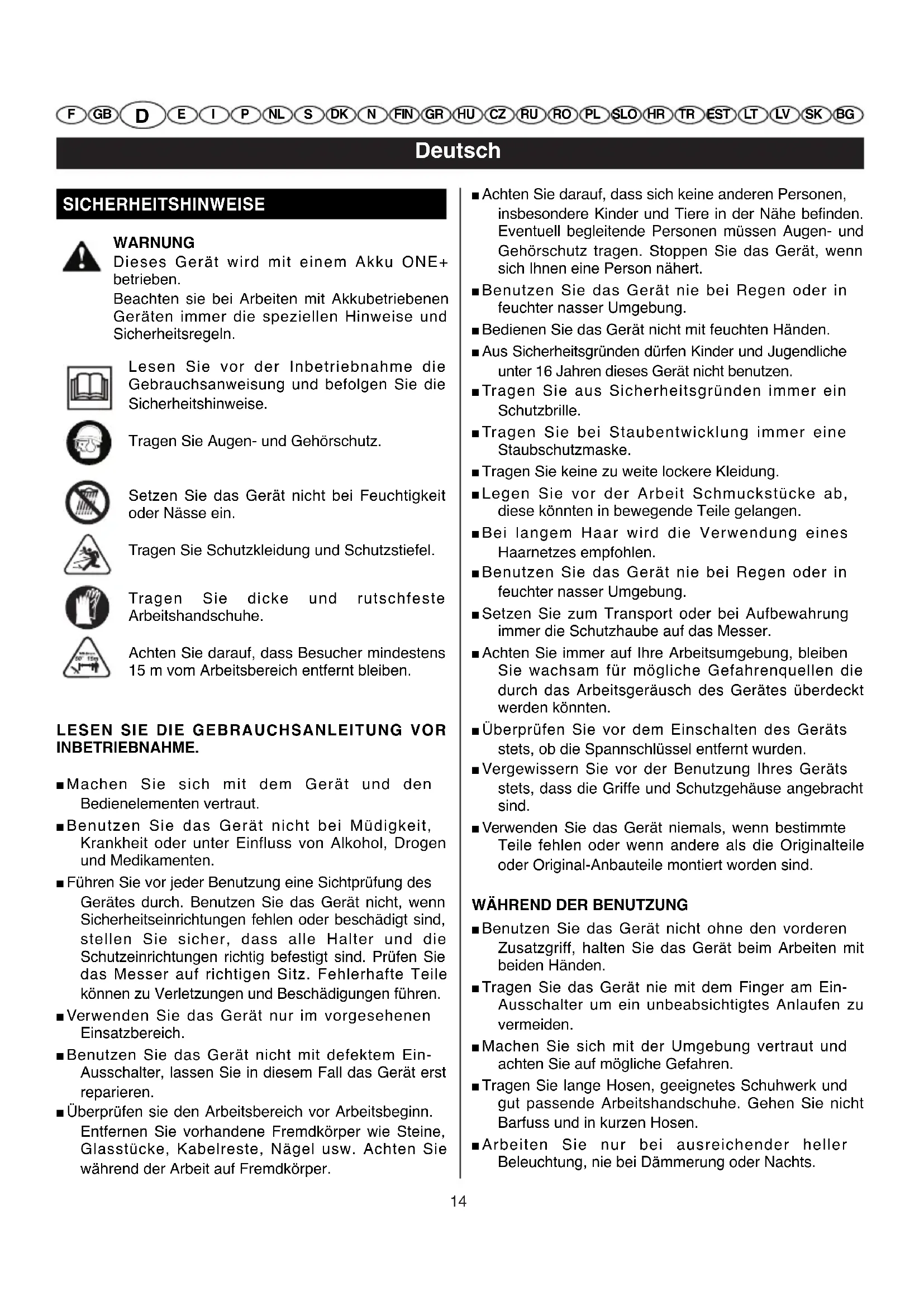 F GB E I P NL S DK N FIN GR HU CZ RU RO PL SLO HR TR EST LT LV SK BG SICHERHEITSHINWEISE WARNUNG Dieses Gerät wird mit einem Akku ONE+ betrieben. Beachten sie bei Arbeiten mit Akkubetriebenen Geräten immer die speziellen Hinweise und Sicherheitsregeln.