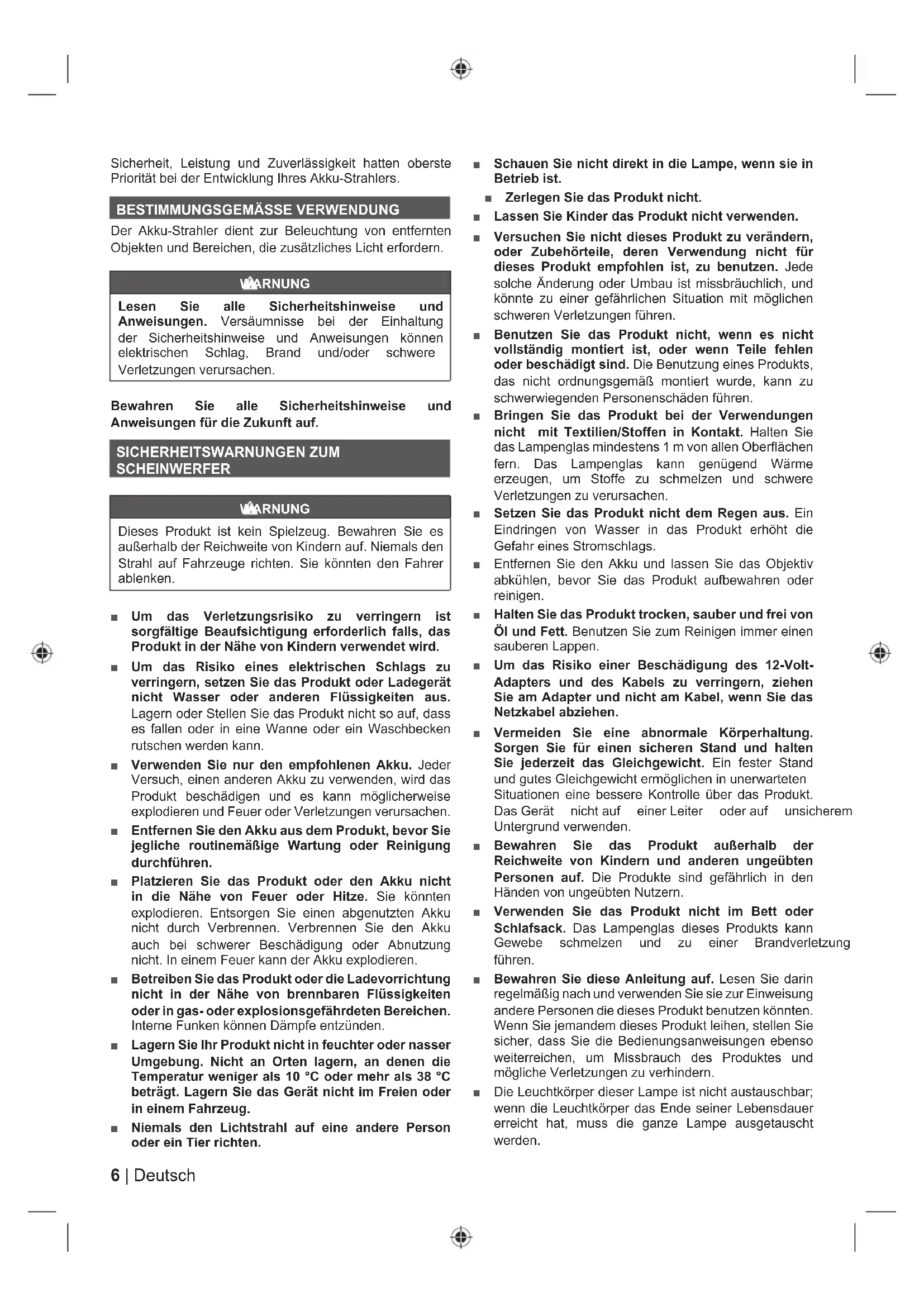 Verletzungen verursachen. Bewahren Sie alle Sicherheitshinweise und Anweisungen für die Zukunft auf. SICHERHEITSWARNUNGEN ZUM SCHEINWERFER WARNUNG Dieses Produkt ist kein Spielzeug. Bewahren Sie es außerhalb der Reichweite von Kindern auf. Niemals den Strahl auf Fahrzeuge richten. Sie könnten den Fahrer ablenken. Ŷ Um das Verletzungsrisiko zu verringern ist sorgfältige Beaufsichtigung erforderlich falls, das Produkt in der Nähe von Kindern verwendet wird. Ŷ Um das Risiko eines elektrischen Schlags zu verringern, setzen Sie das Produkt oder Ladegerät nicht Wasser oder anderen Flüssigkeiten aus. Lagern oder Stellen Sie das Produkt nicht so auf, dass es fallen oder in eine Wanne oder ein Waschbecken rutschen werden kann. Ŷ Verwenden Sie nur den empfohlenen Akku. Jeder Versuch, einen anderen Akku zu verwenden, wird das Produkt beschädigen und es kann möglicherweise explodieren und Feuer oder Verletzungen verursachen. Ŷ Entfernen Sie den Akku aus dem Produkt, bevor Sie jegliche routinemäßige Wartung oder Reinigung durchführen. Ŷ Platzieren Sie das Produkt oder den Akku nicht in die Nähe von Feuer oder Hitze. Sie könnten explodieren. Entsorgen Sie einen abgenutzten Akku nicht durch Verbrennen. Verbrennen Sie den Akku auch bei schwerer Beschädigung oder Abnutzung nicht. In einem Feuer kann der Akku explodieren. Ŷ Betreiben Sie das Produkt oder die Ladevorrichtung nicht in der Nähe von brennbaren Flüssigkeiten oder in gas- oder explosionsgefährdeten Bereichen. Interne Funken können Dämpfe entzünden. Ŷ Lagern Sie Ihr Produkt nicht in feuchter oder nasser Umgebung. Nicht an Orten lagern, an denen die Temperatur weniger als 10 °C oder mehr als 38 °C beträgt. Lagern Sie das Gerät nicht im Freien oder in einem Fahrzeug. Ŷ Niemals den Lichtstrahl auf eine andere Person oder ein Tier richten. Ŷ Schauen Sie nicht direkt in die Lampe, wenn sie in Betrieb ist. Ŷ Zerlegen Sie das Produkt nicht. Ŷ Lassen Sie Kinder das Produkt nicht verwenden. Ŷ Versuchen Sie nicht dieses Produkt zu verändern, oder Zubehörteile, deren Verwendung nicht für dieses Produkt empfohlen ist, zu benutzen. Jede solche Änderung oder Umbau ist missbräuchlich, und könnte zu einer gefährlichen Situation mit möglichen schweren Verletzungen führen. Ŷ Benutzen Sie das Produkt nicht, wenn es nicht vollständig montiert ist, oder wenn Teile fehlen oder beschädigt sind. Die Benutzung eines Produkts, das nicht ordnungsgemäß montiert wurde, kann zu schwerwiegenden Personenschäden führen. Ŷ Bringen Sie das Produkt bei der Verwendungen nicht mit Textilien/Stoffen in Kontakt. Halten Sie das Lampenglas mindestens 1 m von allen Oberflächen fern. Das Lampenglas kann genügend Wärme erzeugen, um Stoffe zu schmelzen und schwere Verletzungen zu verursachen. Ŷ Setzen Sie das Produkt nicht dem Regen aus. Ein Eindringen von Wasser in das Produkt erhöht die *HIDKUHLQHV6WURPVFKODJV Ŷ Entfernen Sie den Akku und lassen Sie das Objektiv abkühlen, bevor Sie das Produkt aufbewahren oder reinigen. Ŷ Halten Sie das Produkt trocken, sauber und frei von Öl und Fett. Benutzen Sie zum Reinigen immer einen sauberen Lappen. Ŷ Um das Risiko einer Beschädigung des 12-Volt- Adapters und des Kabels zu verringern, ziehen Sie am Adapter und nicht am Kabel, wenn Sie das Netzkabel abziehen. Ŷ Vermeiden Sie eine abnormale Körperhaltung. Sorgen Sie für einen sicheren Stand und halten Sie jederzeit das Gleichgewicht. Ein fester Stand