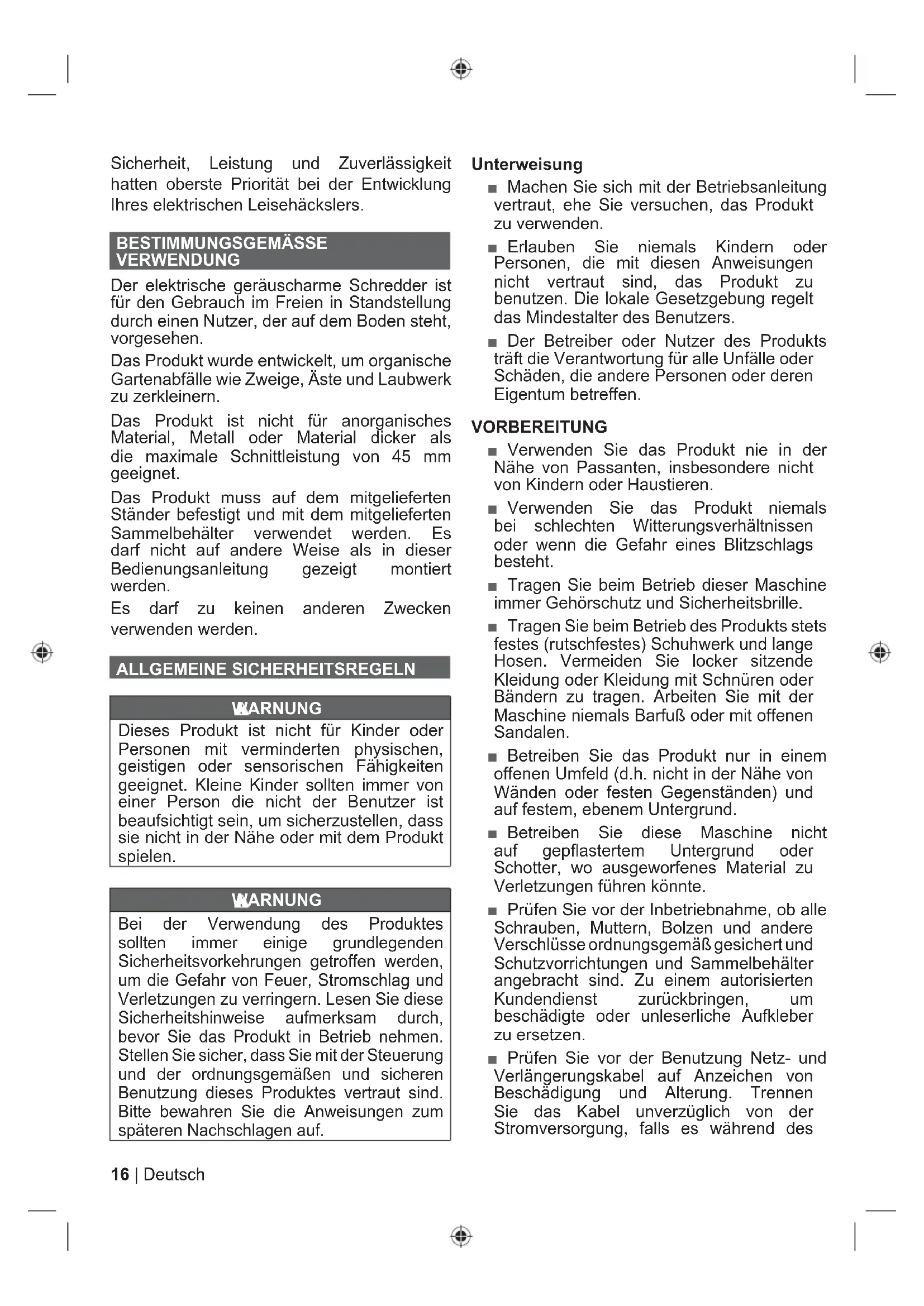 Le moteur ne fonctionne pas. Le dispositif de protection contre les surcharges s’est déclenché. Attendez que le moteur ait refroidi et appuyez sur le bouton de réinitialisation du dispositif de protection contre les surcharges. Remettez le produit en marche. Alimentation défaillante Vérifi er le câble d'alimentation, la fi che et le fusible de la maison. Le bac de collecte n’est pas inséré dans le produit et/ ou l’interrupteur de sécurité n’est pas activé. Insérez le bac de collecte, puis tirez l’interrupteur de sécurité pour l’activer. Les matières à broyer ne sont pas aspirées. Le matériau est bloqué dans la goulotte d'approvisionnement. Suivez les instructions présentes dans ce manuel pour dégager le bourrage. Le contre-plateau est trop éloigné des éléments de coupe. Suivez les instructions présentes dans ce manuel pour procéder au réglage du contre-plateau.16 | Deutsch Sicherheit, Leistung und Zuverlässigkeit hatten oberste Priorität bei der Entwicklung Ihres elektrischen Leisehäckslers. BESTIMMUNGSGEMÄSSE VERWENDUNG Der elektrische geräuscharme Schredder ist für den Gebrauch im Freien in Standstellung durch einen Nutzer, der auf dem Boden steht, vorgesehen. Das Produkt wurde entwickelt, um organische Gartenabfälle wie Zweige, Äste und Laubwerk zu zerkleinern. Das Produkt ist nicht für anorganisches Material, Metall oder Material dicker als die maximale Schnittleistung von 45 mm geeignet. Das Produkt muss auf dem mitgelieferten Ständer befestigt und mit dem mitgelieferten Sammelbehälter verwendet werden. Es darf nicht auf andere Weise als in dieser Bedienungsanleitung gezeigt montiert werden. Es darf zu keinen anderen Zwecken verwenden werden. ALLGEMEINE SICHERHEITSREGELN WARNUNG Dieses Produkt ist nicht für Kinder oder Personen mit verminderten physischen, geistigen oder sensorischen Fähigkeiten geeignet. Kleine Kinder sollten immer von einer Person die nicht der Benutzer ist beaufsichtigt sein, um sicherzustellen, dass sie nicht in der Nähe oder mit dem Produkt spielen. WARNUNG Bei der Verwendung des Produktes sollten immer einige grundlegenden Sicherheitsvorkehrungen getroffen werden, um die Gefahr von Feuer, Stromschlag und Verletzungen zu verringern. Lesen Sie diese Sicherheitshinweise aufmerksam durch, bevor Sie das Produkt in Betrieb nehmen. Stellen Sie sicher, dass Sie mit der Steuerung und der ordnungsgemäßen und sicheren Benutzung dieses Produktes vertraut sind. Bitte bewahren Sie die Anweisungen zum späteren Nachschlagen auf. Unterweisung ■ Machen Sie sich mit der Betriebsanleitung vertraut, ehe Sie versuchen, das Produkt zu verwenden. ■ Erlauben Sie niemals Kindern oder Personen, die mit diesen Anweisungen nicht vertraut sind, das Produkt zu benutzen. Die lokale Gesetzgebung regelt das Mindestalter des Benutzers. ■ Der Betreiber oder Nutzer des Produkts träft die Verantwortung für alle Unfälle oder Schäden, die andere Personen oder deren Eigentum betreffen. VORBEREITUNG ■ Verwenden Sie das Produkt nie in der Nähe von Passanten, insbesondere nicht von Kindern oder Haustieren. ■ Verwenden Sie das Produkt niemals bei schlechten Witterungsverhältnissen oder wenn die Gefahr eines Blitzschlags besteht. ■ Tragen Sie beim Betrieb dieser Maschine immer Gehörschutz und Sicherheitsbrille. ■ Tragen Sie beim Betrieb des Produkts stets festes (rutschfestes) Schuhwerk und lange Hosen. Vermeiden Sie locker sitzende Kleidung oder Kleidung mit Schnüren oder Bändern zu tragen. Arbeiten Sie mit der Maschine niemals Barfuß oder mit offenen Sandalen. ■ Betreiben Sie das Produkt nur in einem offenen Umfeld (d.h. nicht in der Nähe von Wänden oder festen Gegenständen) und auf festem, ebenem Untergrund. ■ Betreiben Sie diese Maschine nicht auf gepflastertem Untergrund oder Schotter, wo ausgeworfenes Material zu Verletzungen führen könnte. ■ Prüfen Sie vor der Inbetriebnahme, ob alle Schrauben, Muttern, Bolzen und andere Verschlüsse ordnungsgemäß gesichert und Schutzvorrichtungen und Sammelbehälter angebracht sind. Zu einem autorisierten Kundendienst zurückbringen, um beschädigte oder unleserliche Aufkleber zu ersetzen. ■ Prüfen Sie vor der Benutzung Netz- und Verlängerungskabel auf Anzeichen von Beschädigung und Alterung. Trennen Sie das Kabel unverzüglich von der Stromversorgung, falls es während des17 Deutsch |