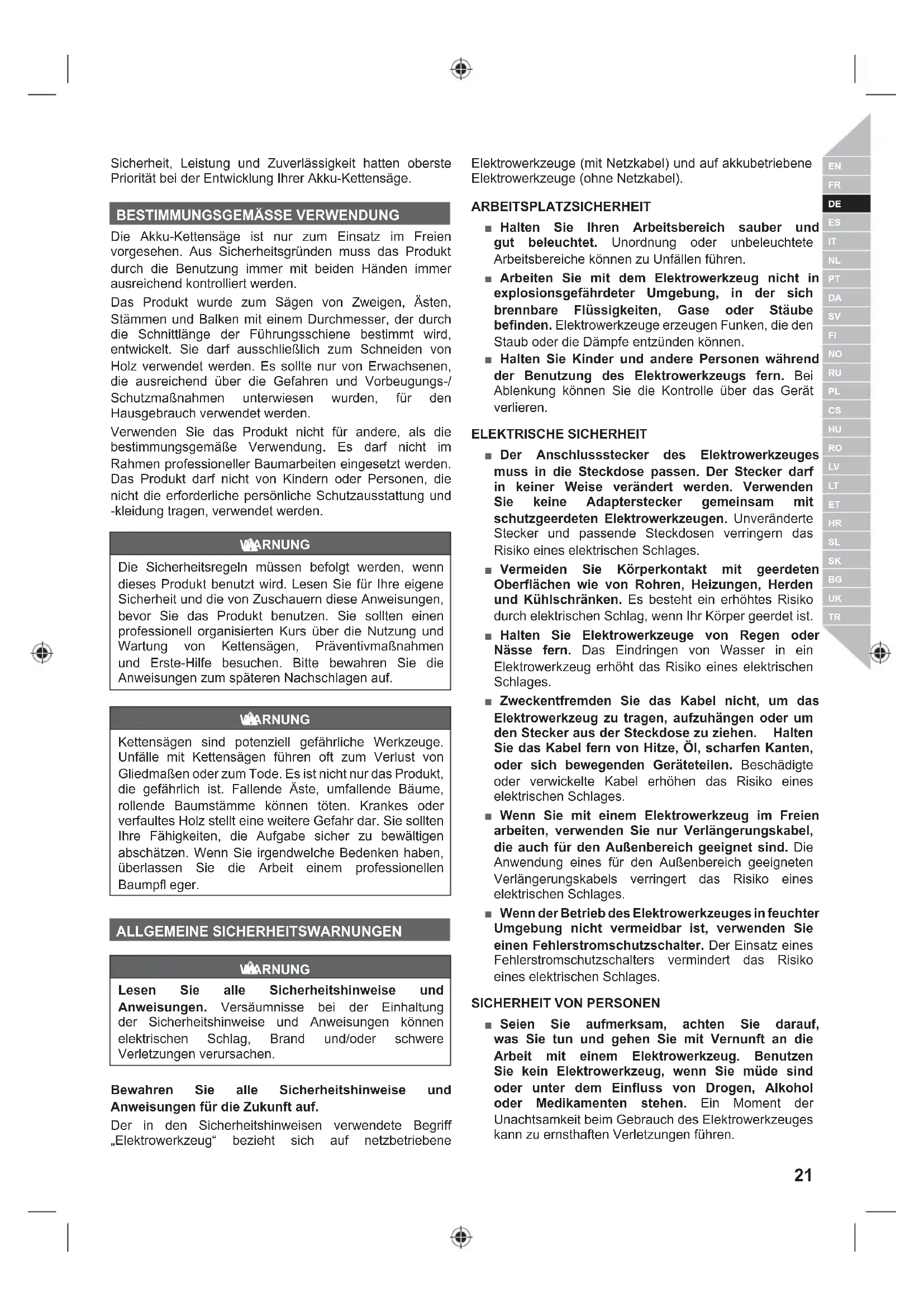 Die Akku-Kettensäge ist nur zum Einsatz im Freien vorgesehen. Aus Sicherheitsgründen muss das Produkt durch die Benutzung immer mit beiden Händen immer ausreichend kontrolliert werden. Das Produkt wurde zum Sägen von Zweigen, Ästen, Stämmen und Balken mit einem Durchmesser, der durch die Schnittlänge der Führungsschiene bestimmt wird, entwickelt. Sie darf ausschließlich zum Schneiden von Holz verwendet werden. Es sollte nur von Erwachsenen, die ausreichend über die Gefahren und Vorbeugungs-/ Schutzmaßnahmen unterwiesen wurden, für den Hausgebrauch verwendet werden. Verwenden Sie das Produkt nicht für andere, als die bestimmungsgemäße Verwendung. Es darf nicht im Rahmen professioneller Baumarbeiten eingesetzt werden. Das Produkt darf nicht von Kindern oder Personen, die nicht die erforderliche persönliche Schutzausstattung und -kleidung tragen, verwendet werden. WARNUNG Die Sicherheitsregeln müssen befolgt werden, wenn dieses Produkt benutzt wird. Lesen Sie für Ihre eigene Sicherheit und die von Zuschauern diese Anweisungen, bevor Sie das Produkt benutzen. Sie sollten einen professionell organisierten Kurs über die Nutzung und Wartung von Kettensägen, Präventivmaßnahmen und Erste-Hilfe besuchen. Bitte bewahren Sie die Anweisungen zum späteren Nachschlagen auf. WARNUNG Kettensägen sind potenziell gefährliche Werkzeuge. Unfälle mit Kettensägen führen oft zum Verlust von Gliedmaßen oder zum Tode. Es ist nicht nur das Produkt, die gefährlich ist. Fallende Äste, umfallende Bäume, rollende Baumstämme können töten. Krankes oder verfaultes Holz stellt eine weitere Gefahr dar. Sie sollten Ihre Fähigkeiten, die Aufgabe sicher zu bewältigen abschätzen. Wenn Sie irgendwelche Bedenken haben, überlassen Sie die Arbeit einem professionellen Baumpfl eger. ALLGEMEINE SICHERHEITSWARNUNGEN WARNUNG Lesen Sie alle Sicherheitshinweise und Anweisungen. Versäumnisse bei der Einhaltung der Sicherheitshinweise und Anweisungen können elektrischen Schlag, Brand und/oder schwere Verletzungen verursachen. Bewahren Sie alle Sicherheitshinweise und Anweisungen für die Zukunft auf. Der in den Sicherheitshinweisen verwendete Begriff „Elektrowerkzeug“ bezieht sich auf netzbetriebene Elektrowerkzeuge (mit Netzkabel) und auf akkubetriebene Elektrowerkzeuge (ohne Netzkabel). ARBEITSPLATZSICHERHEIT ■ Halten Sie Ihren Arbeitsbereich sauber und gut beleuchtet. Unordnung oder unbeleuchtete Arbeitsbereiche können zu Unfällen führen. ■ Arbeiten Sie mit dem Elektrowerkzeug nicht in explosionsgefährdeter Umgebung, in der sich brennbare Flüssigkeiten, Gase oder Stäube befinden. Elektrowerkzeuge erzeugen Funken, die den Staub oder die Dämpfe entzünden können. ■ Halten Sie Kinder und andere Personen während der Benutzung des Elektrowerkzeugs fern. Bei Ablenkung können Sie die Kontrolle über das Gerät verlieren. ELEKTRISCHE SICHERHEIT ■ Der Anschlussstecker des Elektrowerkzeuges muss in die Steckdose passen. Der Stecker darf in keiner Weise verändert werden. Verwenden Sie keine Adapterstecker gemeinsam mit schutzgeerdeten Elektrowerkzeugen. Unveränderte Stecker und passende Steckdosen verringern das Risiko eines elektrischen Schlages. ■ Vermeiden Sie Körperkontakt mit geerdeten Oberflächen wie von Rohren, Heizungen, Herden und Kühlschränken. Es besteht ein erhöhtes Risiko durch elektrischen Schlag, wenn Ihr Körper geerdet ist. ■ Halten Sie Elektrowerkzeuge von Regen oder Nässe fern. Das Eindringen von Wasser in ein Elektrowerkzeug erhöht das Risiko eines elektrischen Schlages. ■ Zweckentfremden Sie das Kabel nicht, um das Elektrowerkzeug zu tragen, aufzuhängen oder um den Stecker aus der Steckdose zu ziehen. Halten Sie das Kabel fern von Hitze, Öl, scharfen Kanten, oder sich bewegenden Geräteteilen. Beschädigte oder verwickelte Kabel erhöhen das Risiko eines elektrischen Schlages. ■ Wenn Sie mit einem Elektrowerkzeug im Freien arbeiten, verwenden Sie nur Verlängerungskabel, die auch für den Außenbereich geeignet sind. Die Anwendung eines für den Außenbereich geeigneten Verlängerungskabels verringert das Risiko eines elektrischen Schlages. ■ Wenn der Betrieb des Elektrowerkzeuges in feuchter Umgebung nicht vermeidbar ist, verwenden Sie einen Fehlerstromschutzschalter. Der Einsatz eines Fehlerstromschutzschalters vermindert das Risiko eines elektrischen Schlages.