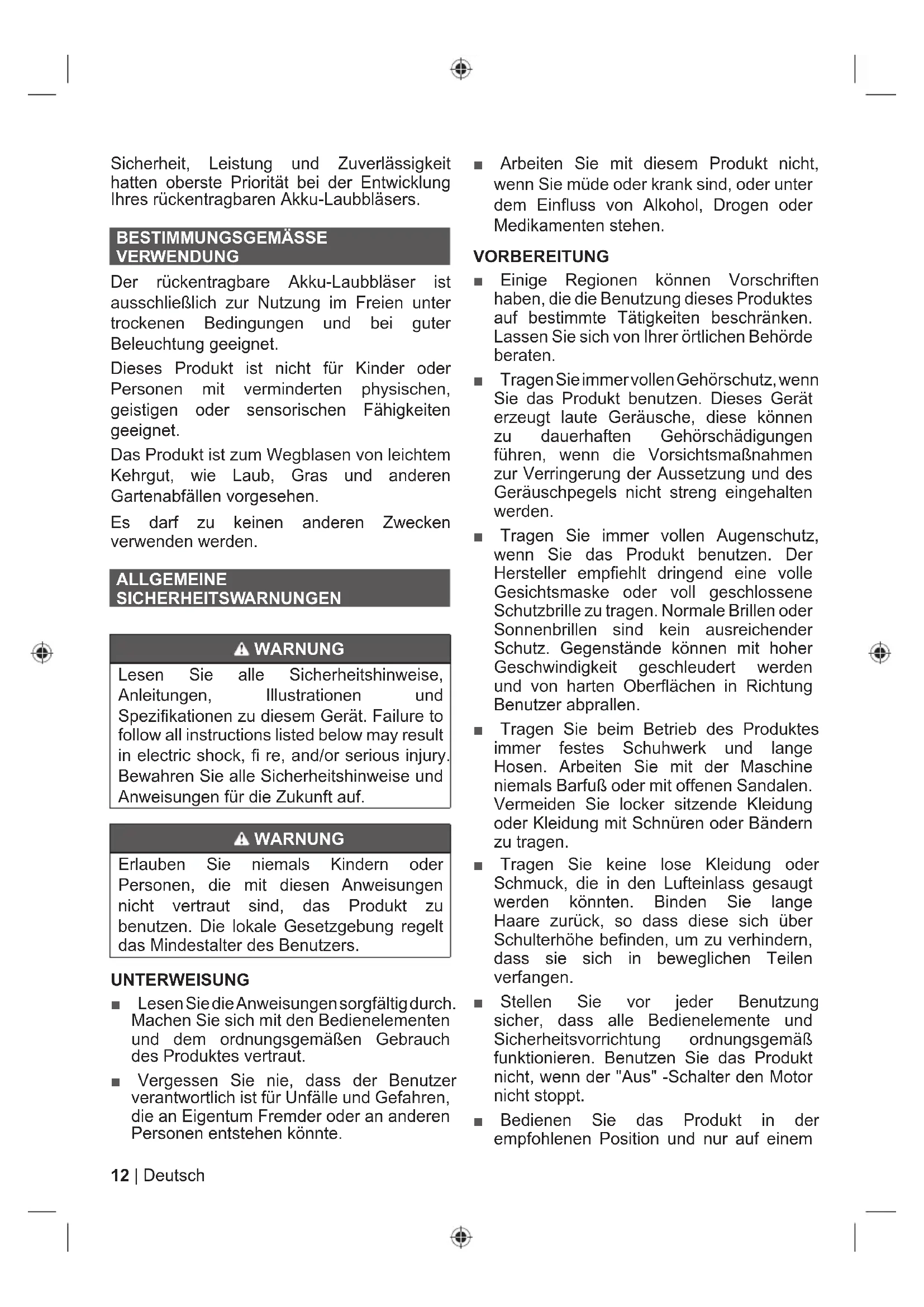 TRSicherheit, Leistung und Zuverlässigkeit hatten oberste Priorität bei der Entwicklung Ihres rückentragbaren Akku-Laubbläsers. BESTIMMUNGSGEMÄSSE VER WENDUNG Der rückentragbare Akku-Laubbläser ist ausschließlich zur Nutzung im Freien unter trockenen Bedingungen und bei guter Beleuchtung geeignet. Dieses Produkt ist nicht für Kinder oder Personen mit verminderten physischen, geistigen oder sensorischen Fähigkeiten geeignet. Das Produkt ist zum Wegblasen von leichtem Kehrgut, wie Laub, Gras und anderen Gartenabfällen vorgesehen. Es darf zu keinen anderen Zwecken verwenden werden. ALLGEMEINE SICHERHEITSW ARNUNGEN WARNUNG Lesen Sie alle Sicherheitshinweise, Anleitungen, Illustrationen und Spezi¿ kationen zu diesem Gerät. Failure to follow all instructions listed below may result in electric shock, ¿ re, and/or serious injury. Bewahren Sie alle Sicherheitshinweise und Anweisungen für die Zukunft auf. WARNUNG Erlauben Sie niemals Kindern oder Personen, die mit diesen Anweisungen nicht vertraut sind, das Produkt zu benutzen. Die lokale Gesetzgebung regelt das Mindestalter des Benutzers. UNTERWEISUNG Ŷ Lesen Sie die Anweisungen sorgfältig durch. Machen Sie sich mit den Bedienelementen und dem ordnungsgemäßen Gebrauch des Produktes vertraut. Ŷ Vergessen Sie nie, dass der Benutzer verantwortlich ist für Unfälle und Gefahren, die an Eigentum Fremder oder an anderen Personen entstehen könnte. Ŷ Arbeiten Sie mit diesem Produkt nicht, wenn Sie müde oder krank sind, oder unter dem Einfluss von Alkohol, Drogen oder Medikamenten stehen. VORBEREITUNG Ŷ Einige Regionen können Vorschriften haben, die die Benutzung dieses Produktes auf bestimmte Tätigkeiten beschränken. Lassen Sie sich von Ihrer örtlichen Behörde beraten. Ŷ Tragen Sie immer vollen Gehörschutz, wenn Sie das Produkt benutzen. Dieses Gerät erzeugt laute Geräusche, diese können zu dauerhaften Gehörschädigungen führen, wenn die Vorsichtsmaßnahmen zur Verringerung der Aussetzung und des Geräuschpegels nicht streng eingehalten werden. Ŷ Tragen Sie immer vollen Augenschutz, wenn Sie das Produkt benutzen. Der Hersteller empfiehlt dringend eine volle Gesichtsmaske oder voll geschlossene Schutzbrille zu tragen. Normale Brillen oder Sonnenbrillen sind kein ausreichender Schutz. Gegenstände können mit hoher Geschwindigkeit geschleudert werden und von harten Oberflächen in Richtung Benutzer abprallen. Ŷ Tragen Sie beim Betrieb des Produktes immer festes Schuhwerk und lange Hosen. Arbeiten Sie mit der Maschine niemals Barfuß oder mit offenen Sandalen. Vermeiden Sie locker sitzende Kleidung oder Kleidung mit Schnüren oder Bändern zu tragen. Ŷ Tragen Sie keine lose Kleidung oder Schmuck, die in den Lufteinlass gesaugt werden könnten. Binden Sie lange Haare zurück, so dass diese sich über Schulterhöhe befinden, um zu verhindern, dass sie sich in beweglichen Teilen verfangen. Ŷ Stellen Sie vor jeder Benutzung sicher, dass alle Bedienelemente und Sicherheitsvorrichtung ordnungsgemäß funktionieren. Benutzen Sie das Produkt nicht, wenn der "Aus" -Schalter den Motor nicht stoppt. Ŷ Bedienen Sie das Produkt in der empfohlenen Position und nur auf einem 12 | Deutschfesten, ebenen Untergrund. Ŷ Betreiben Sie diese Maschine nicht auf gepflastertem Untergrund oder Schotter, wo ausgeworfenes Material zu Verletzungen führen könnte. Ŷ Überprüfen Sie das Gehäuse vor jeder Benutzung auf Beschädigung. Stellen Sie sicher, dass alle Schutzabdeckungen und Griffe montiert und ordnungsgemäß gesichert sind. Ersetzen Sie abgenutzte oder beschädigte Teile satzweise, um das Gleichgewicht zu erhalten. Ersetzen Sie beschädigte oder unleserliche Etiketten. Ŷ Benutzen Sie nicht das Produkt, wenn andere Personen, insbesondere Kinder, in der Nähe sind. Ŷ Halten Sie alle Lüftungseinlässe von Verunreinigungen frei. Stecken Sie keine Gegenstände in Öffnungen. Verwenden Sie das Gerät nicht bei blockierten Öffnungen und halten Sie es frei von Staub, Flusen, Haaren und allem, was den Luftfluss einschränken könnte. Ŷ Verwenden Sie Rechen und Besen um Verschmutzungen zu lösen, bevor sie das Blasgerät einsetzen. Ŷ Untersuchen Sie vor jeder Benutzung den Arbeitsbereich. Entfernen Sie alle Objekte wie z.B. Steine, zerbrochenes Glas, Nägel, Draht oder Fäden, die von dem Luftstrom eine beträchtliche Distanz geblasen werden können. VER