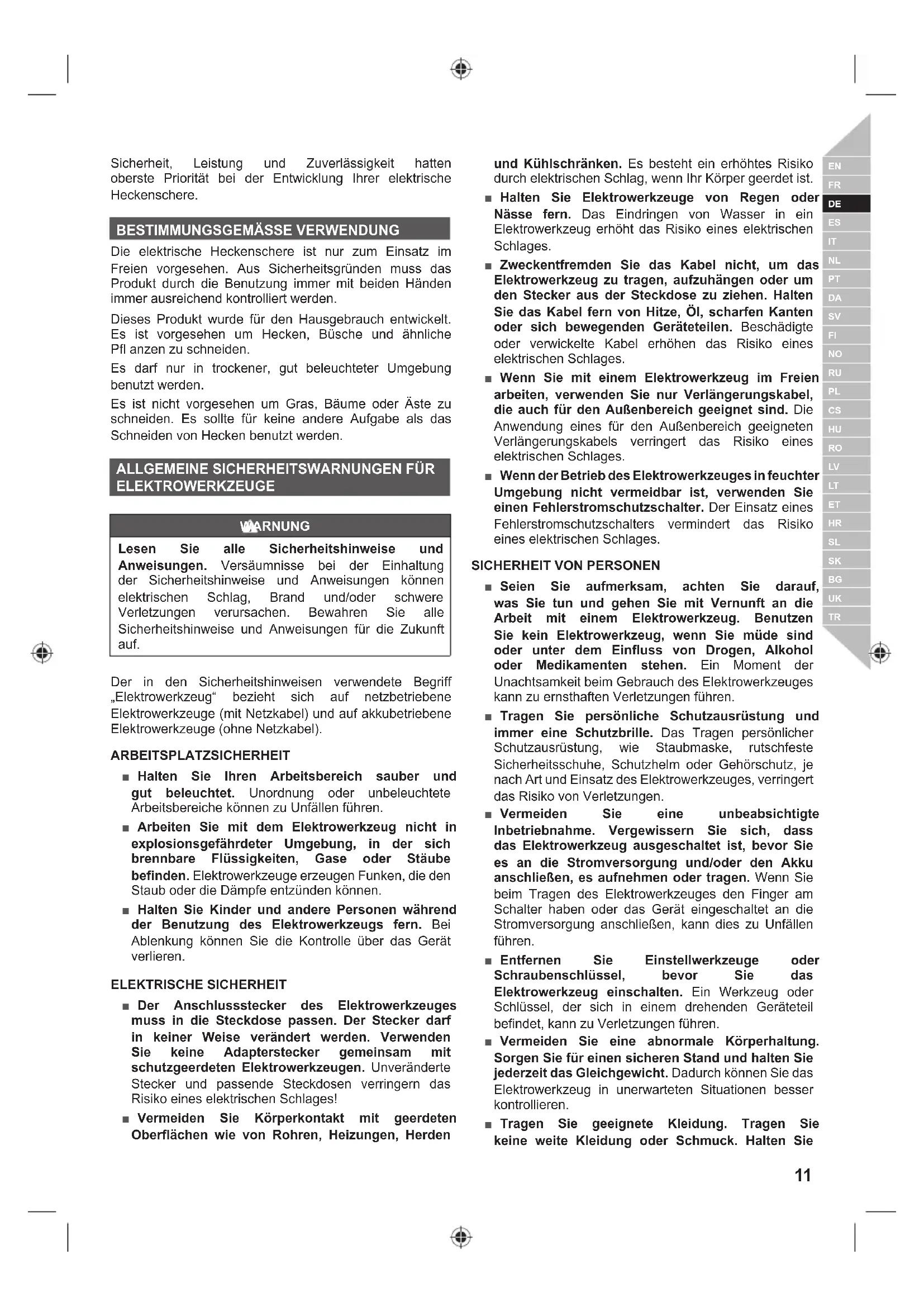 Sicherheitswarnung Lesen und verstehen Sie alle Anweisungen, bevor Sie das Produkt benutzen, befolgen Sie alle Warnungen und Sicherheitsanweisungen. Tragen Sie einen Gehörschutz Tragen Sie einen Augenschutz Halten Sie die Heckenschere beim Betrieb immer mit beiden Händen. Tragen Sie rutschfeste, schwere Schutzhandschuhe. Trennen Sie vor Wartungsarbeiten den Stecker sofort vom Stromnetz, oder falls das Kabel beschädigt oder geschnitten ist. Scharfes Schneidmesser. Berühren Sie zur Vermeidung von Verletzungen nicht die Schneidmesser. Nicht Regen oder feuchten Bedingungen aussetzen. Achten Sie auf geschleuderte oder fl iegende Objekte. Halten Sie alle Zuschauer, besonders Kinder und Haustiere, mindestens 15 m von dem Arbeitsbereich fern. Klasse II Werkzeug, Doppelisolierung CE-Konformität EurAsian Konformitätszeichen Ukrainisches Prüfzeichen Der auf diesem Etikett angegebene garantierte Schalldruckpegel beträgt 98 dB. Elektrische Geräte sollten nicht mit dem übrigen Müll entsorgt werden. Bitte entsorgen Sie diese an den entsprechenden Entsorgungsstellen. Wenden Sie sich an die örtliche Behörde oder Ihren Händler, um Auskunft über die Entsorgung zu erhalten.