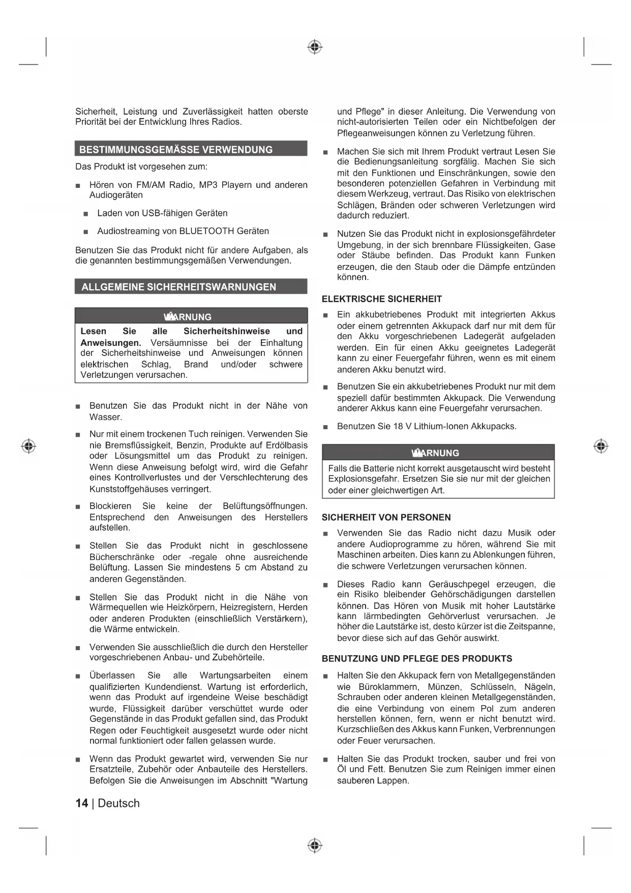 Das Produkt ist vorgesehen zum: ■ Hören von FM/AM Radio, MP3 Playern und anderen Audiogeräten ■ Laden von USB-fähigen Geräten ■ Audiostreaming von BLUETOOTH Geräten Benutzen Sie das Produkt nicht für andere Aufgaben, als die genannten bestimmungsgemäßen Verwendungen. ALLGEMEINE SICHERHEITSWARNUNGEN WARNUNG Lesen Sie alle Sicherheitshinweise und Anweisungen. Versäumnisse bei der Einhaltung der Sicherheitshinweise und Anweisungen können elektrischen Schlag, Brand und/oder schwere Verletzungen verursachen. ■ Benutzen Sie das Produkt nicht in der Nähe von Wasser. ■ Nur mit einem trockenen Tuch reinigen. Verwenden Sie nie Bremsflüssigkeit, Benzin, Produkte auf Erdölbasis oder Lösungsmittel um das Produkt zu reinigen. Wenn diese Anweisung befolgt wird, wird die Gefahr eines Kontrollverlustes und der Verschlechterung des Kunststoffgehäuses verringert. ■ Blockieren Sie keine der Belüftungsöffnungen. Entsprechend den Anweisungen des Herstellers aufstellen. ■ Stellen Sie das Produkt nicht in geschlossene Bücherschränke oder -regale ohne ausreichende Belüftung. Lassen Sie mindestens 5 cm Abstand zu anderen Gegenständen. ■ Stellen Sie das Produkt nicht in die Nähe von Wärmequellen wie Heizkörpern, Heizregistern, Herden oder anderen Produkten (einschließlich Verstärkern), die Wärme entwickeln. ■ Verwenden Sie ausschließlich die durch den Hersteller vorgeschriebenen Anbau- und Zubehörteile. ■ Überlassen Sie alle Wartungsarbeiten einem qualifizierten Kundendienst. Wartung ist erforderlich, wenn das Produkt auf irgendeine Weise beschädigt wurde, Flüssigkeit darüber verschüttet wurde oder Gegenstände in das Produkt gefallen sind, das Produkt Regen oder Feuchtigkeit ausgesetzt wurde oder nicht normal funktioniert oder fallen gelassen wurde. ■ Wenn das Produkt gewartet wird, verwenden Sie nur Ersatzteile, Zubehör oder Anbauteile des Herstellers. Befolgen Sie die Anweisungen im Abschnitt "Wartung und Pflege" in dieser Anleitung. Die Verwendung von nicht-autorisierten Teilen oder ein Nichtbefolgen der Pflegeanweisungen können zu Verletzung führen. ■ Machen Sie sich mit Ihrem Produkt vertraut Lesen Sie die Bedienungsanleitung sorgfälig. Machen Sie sich mit den Funktionen und Einschränkungen, sowie den besonderen potenziellen Gefahren in Verbindung mit diesem Werkzeug, vertraut. Das Risiko von elektrischen Schlägen, Bränden oder schweren Verletzungen wird dadurch reduziert. ■ Nutzen Sie das Produkt nicht in explosionsgefährdeter Umgebung, in der sich brennbare Flüssigkeiten, Gase oder Stäube befinden. Das Produkt kann Funken erzeugen, die den Staub oder die Dämpfe entzünden können. ELEKTRISCHE SICHERHEIT ■ Ein akkubetriebenes Produkt mit integrierten Akkus oder einem getrennten Akkupack darf nur mit dem für den Akku vorgeschriebenen Ladegerät aufgeladen werden. Ein für einen Akku geeignetes Ladegerät kann zu einer Feuergefahr führen, wenn es mit einem anderen Akku benutzt wird. ■ Benutzen Sie ein akkubetriebenes Produkt nur mit dem speziell dafür bestimmten Akkupack. Die Verwendung anderer Akkus kann eine Feuergefahr verursachen. ■ Benutzen Sie 18 V Lithium-Ionen Akkupacks. WARNUNG Falls die Batterie nicht korrekt ausgetauscht wird besteht Explosionsgefahr. Ersetzen Sie sie nur mit der gleichen oder einer gleichwertigen Art.