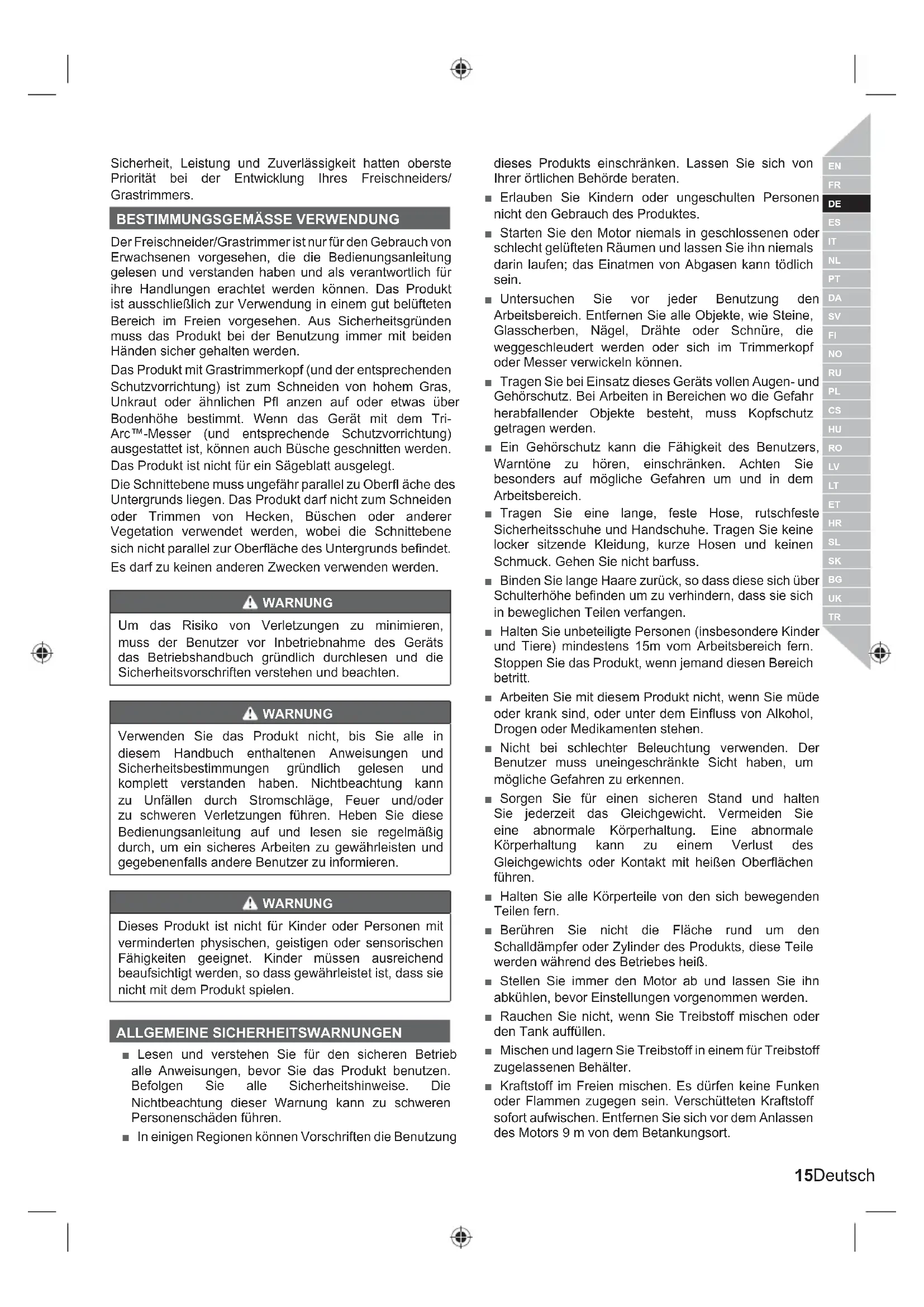 Drücken Sie die Einspritzpumpe 10 Mal. Ziehen Sie das Starterseil durch. Drücken Sie zum Starten/Betrieb den Gashebel. Verriegeln Sie den Gashebel in der Position, indem Sie die Gashebelarretierung drücken. Verwenden Sie bleifreies Benzin für Autos mit einem Oktanindex von 91 ([R+M]/2) oder höher. Verwenden Sie 2-Takt-Öl für luftgekühlte Motoren. Mischen Sie die Treibstoffmixtur gründlich und auch jedes Mal vor dem Auffüllen. Einen kalten Motor per Hand starten Einen warmen Motor per Hand starten Einen kalten Motor mit einem Elektrostarter starten Einen warmen Motor mit Elektrostarter starten Gerader Schaft: Bei der Montage der Fadenspule auf die Schneidgarnitur sollte dieses Symbol für den Bediener sichtbar sein. Das Tri-Arc™ Messer ist für dieses Produkt geeignet und ist zum Schneiden von Unkraut und Reben geeignet. Achten Sie auf den Rüchschlag des Messers. Drehrichtung und maximale Drehzahl des Schaftes für die Schneidgarnitur. Ziehen: Schnellverschluss Dieses Gerät entspricht allen gesetzlichen Normen des Landes der Europäischen Union, in dem es gekauft wurde. EurAsian Konformitätszeichen Ukrainisches Prüfzeichen Mit den folgenden Symbolen wird die Bedeutung der verschiedenen Risikostufen, die mit dem Produkt einhergehen, dargestellt. GEFAHR Weist auf eine unmittelbare gefährliche Situation hin, die, falls nicht vermieden, zu Tod oder ernsthafter Verletzung führen kann. WARNUNG Weist auf eine mögliche gefährliche Situation hin, die, falls nicht vermieden, zu Tod oder ernsthafter Verletzung führen kann. VORSICHT Weist auf eine mögliche gefährliche Situation hin, die, falls nicht vermieden, zu einer leichten oder mittleren22 | Deutsch Verletzung führen kann. VORSICHT Ohne Sicherheitswarnsymbol Weist auf eine Situation hin, die zu Sachbeschädigungen führen kann.