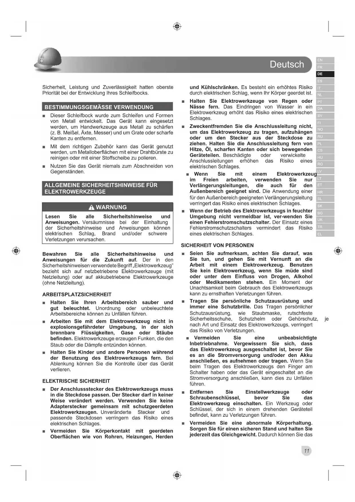 SCHLEIFBOCK Ŷ Tragen Sie immer eine Sicherheitsbrille und Staubmaske. Ŷ Tragen Sie Gehörschutz. Die Einwirkung von Lärm kann Gehörverlust bewirken. Ŷ Dieses Gerät ist nicht zum Nassschleifen geeignet. Ŷ Benutzen Sie kein beschädigtes Zubehör. Untersuchen Sie das Zubehör, z. B. die Schleifscheiben, vor jeder Benutzung auf Splitter und Risse. Nachdem Sie den korrekten Zustand des Zubehörs geprüft und sie es montiert haben, nehmen Sie Abstand vom beweglichen Zubehörteil und lassen das Werkzeug eine Minute lang auf Höchstgeschwindigkeit laufen. Wenn das Zubehörteil beschädigt ist, bricht es bei diesem Test. Ŷ Die nominale Geschwindigkeit des Zubehörs muss gleich oder schneller sein, als die maximale, auf dem Werkzeug angegebene Geschwindigkeit. Zubehörteile, die schneller drehen als ihre Nominalgeschwindigkeit, können brechen und weggeschleudert werden. Ŷ Schleifen Sie niemals seitlich an der Schleifscheibe. Seitliches Schleifen kann dazu führen, dass die Schleifscheibe bricht und auseinander fällt. Ŷ Der Stecker muss in eine entsprechende Steckdose, die ordnungsgemäß installiert und gemäß sämtlicher regionaler Vorschriften und Verordnungen geerdet ist, gesteckt werden. Wenn Sie nicht sicher sind, lassen Sie die Steckdose von einem Elektriker prüfen. Ŷ Befestigen Sie das Gerät vor der Benutzung sicher auf der Werkbank, einem Schleifstand oder einem anderen starren Rahmen. Wenn das Gerät nicht gesichert wird, ist es instabil und kann sich während des Betriebs bewegen. Dies kann zu Beschädigungen und Verletzungen führen. Ŷ Sorgen Sie für ausreichend allgemeine und punktuelle Beleuchtung, um Stroboskopeffekt und Gefahren zu verhindern. Ŷ Verwenden Sie das Gerät immer mit SchleifscheibenDeutsch