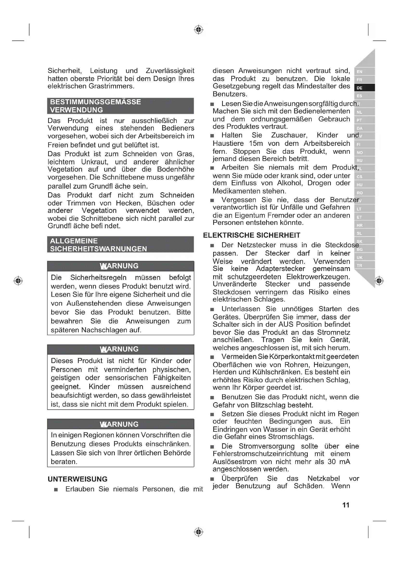 Sicherheit, Leistung und Zuverlässigkeit hatten oberste Priorität bei dem Design Ihres elektrischen Grastrimmers. BESTIMMUNGSGEMÄSSE VER WENDUNG Das Produkt ist nur ausschließlich zur Verwendung eines stehenden Bedieners vorgesehen, wobei sich der Arbeitsbereich im Freien be ndet und gut belüftet ist. Das Produkt ist zum Schneiden von Gras, leichtem Unkraut, und anderer ähnlicher Vegetation auf und über die Bodenhöhe vorgesehen. Die Schnittebene muss ungefähr parallel zum Grund äche sein. Das Produkt darf nicht zum Schneiden oder Trimmen von Hecken, Büschen oder anderer Vegetation verwendet werden, wobei die Schnittebene sich nicht parallel zur Grund äche be ndet. ALLGEMEINE SICHERHEITSW ARNUNGEN WARNUNG Die Sicherheitsregeln müssen befolgt werden, wenn dieses Produkt benutzt wird. Lesen Sie für Ihre eigene Sicherheit und die von Außenstehenden diese Anweisungen bevor Sie das Produkt benutzen. Bitte bewahren Sie die Anweisungen zum späteren Nachschlagen auf. WARNUNG Dieses Produkt ist nicht für Kinder oder Personen mit verminderten physischen, geistigen oder sensorischen Fähigkeiten geeignet. Kinder müssen ausreichend beaufsichtigt werden, so dass gewährleistet ist, dass sie nicht mit dem Produkt spielen. WARNUNG In einigen Regionen können Vorschriften die Benutzung dieses Produkts einschränken. Lassen Sie sich von Ihrer örtlichen Behörde beraten. UNTERWEISUNG Ŷ Erlauben Sie niemals Personen, die mit diesen Anweisungen nicht vertraut sind, das Produkt zu benutzen. Die lokale Gesetzgebung regelt das Mindestalter des Benutzers. Ŷ Lesen Sie die Anweisungen sorgfältig durch. Machen Sie sich mit den Bedienelementen und dem ordnungsgemäßen Gebrauch des Produktes vertraut. Ŷ Halten Sie Zuschauer, Kinder und Haustiere 15m von dem Arbeitsbereich fern. Stoppen Sie das Produkt, wenn jemand diesen Bereich betritt. Ŷ Arbeiten Sie niemals mit dem Produkt, wenn Sie müde oder krank sind, oder unter dem Einfluss von Alkohol, Drogen oder Medikamenten stehen. Ŷ Vergessen Sie nie, dass der Benutzer verantwortlich ist für Unfälle und Gefahren die an Eigentum Fremder oder an anderen Personen entstehen könnte. ELEKTRISCHE SICHERHEIT Ŷ Der Netzstecker muss in die Steckdose passen. Der Stecker darf in keiner Weise verändert werden. Verwenden Sie keine Adapterstecker gemeinsam mit schutzgeerdeten Elektrowerkzeugen. Unveränderte Stecker und passende Steckdosen verringern das Risiko eines elektrischen Schlages. Ŷ Unterlassen Sie unnötiges Starten des Gerätes. Überprüfen Sie immer, dass der Schalter sich in der AUS Position befindet bevor Sie das Produkt an das Stromnetz anschließen. Tragen Sie kein Gerät, welches angeschlossen ist, mit sich herum. Ŷ Vermeiden Sie Körperkontakt mit geerdeten Oberflächen wie von Rohren, Heizungen, Herden und Kühlschränken. Es besteht ein erhöhtes Risiko durch elektrischen Schlag, wenn Ihr Körper geerdet ist. Ŷ Benutzen Sie das Produkt nicht, wenn die Gefahr von Blitzschlag besteht. Ŷ Setzen Sie dieses Produkt nicht im Regen oder feuchten Bedingungen aus. Ein Eindringen von Wasser in ein Gerät erhöht die Gefahr eines Stromschlags. Ŷ Die Stromversorgung sollte über eine Fehlerstromschutzeinrichtung mit einem Auslösestrom von nicht mehr als 30 mA angeschlossen werden. Ŷ Überprüfen Sie das Netzkabel vor jeder Benutzung auf Schäden. Wenn12 | Deutsch Beschädigungen sichtbar sind, muss es ausgetauscht werden. Entrollen Sie bei der Benutzung immer das Netzkabel, aufgerollte Kabel können sich überhitzen. Ŷ Wenn Sie ein Verlängerungskabel benutzen müssen, stellen Sie sicher, dass es für den Einsatz im Freien geeignet ist und ausreichend für die Strombelastung Ihres Produktes ist. Das Verlängerungskabel sollte entweder mit “H05 RN-F” oder “H05VV-F” gekennzeichnet sein. Überprüfen Sie es vor jeder Benutzung auf Schäden. Entrollen Sie es immer, weil aufgewickelte Kabel überhitzen können. Beschädigte Verlängerungskabel sollten nicht repariert werden; sie sollten durch einen gleichwertigen Typ ersetzt werden. Ŷ Verwenden Sie das Produkt nicht falls die Stromkabel beschädigt oder abgenutzt ist. Ŷ Trennen Sie sofort die Stromversorgung, wenn das Netzkabel oder Verlängerungskabel beim Einsatz beschädigt wird. Berühren Sie nicht die Stromkabel bis die Stromversorgung getrennt ist. Ŷ Stellen Sie sicher, dass das Stromkabel so liegt das es nicht von dem Schneidwerkzeug beschädigt wird, man nicht darauf tritt, darüber stolpert, oder es auf andere Weise Beschädigungen und Belastungen ausgesetzt wird. Ŷ Heben oder tragen Sie das Produkt niemals mit dem Netzkabel. Ŷ Ziehen Sie niemals das Netzkabel um die Stromversorgung zu trennen. Ŷ Halten Sie das Netzkabel fern von Hitze, Öl, und scharfen Kanten. Ŷ Stellen Sie sicher, dass die Spannung für Ihr Produkt richtig ist. Ein Typenschild auf dem Produkt zeigt die Spannung des Produktes an. Schließen Sie das Produkt niemals an eine andere als diese Gleichstromspannung an. Ŷ Stellen Sie sicher, dass sich der Schalter auf der Aus Position befindet, bevor Sie die Stromversorgung trennen. VORBEREITUNG Ŷ Tragen Sie bei Einsatz dieses Geräts vollen Augen- und Gehörschutz. Bei Arbeiten in Bereichen wo die Gefahr herabfallender Objekte besteht, muss Kopfschutz getragen werden. Ŷ Gehörschutz kann die Fähigkeit des Benutzers Warntöne zu hören einschränken. Achten Sie besonders auf mögliche Gefahren in der Nähe und in dem Arbeitsbereich. Ŷ Tragen Sie lange, dicke Hosen, Stiefel und Handschuhe. Tragen Sie keine locker sitzende Kleidung, kurze Hosen und keinen Schmuck; gehen Sie nicht barfuß. Ŷ Binden Sie lange Haare zurück, so dass diese sich über Schulterhöhe befinden um zu verhindern, dass sie sich in beweglichen Teilen verfangen. Ŷ Überprüfen Sie vor jeder Benutzung und nach jedem Schlag, dass keine Teile beschädigt sind. Ein defekter Schalter oder ein anderes Teil, das beschädigt oder abgenutzt ist, sollte durch den autorisierten Kundendienst ord