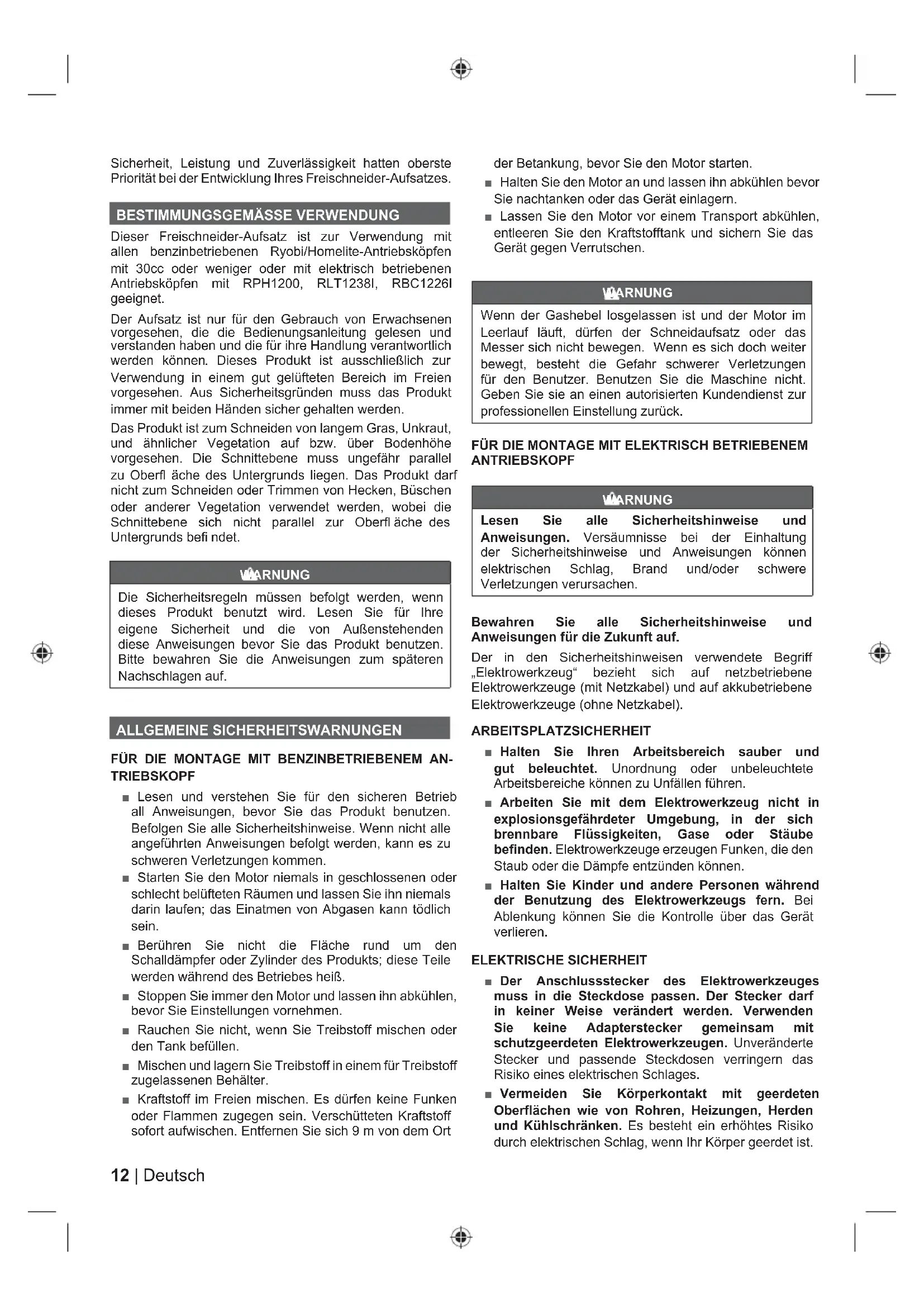 Dieser Freischneider-Aufsatz ist zur Verwendung mit allen benzinbetriebenen Ryobi/Homelite-Antriebsköpfen mit 30cc oder weniger oder mit elektrisch betriebenen Antriebsköpfen mit RPH1200, RLT1238I, RBC1226I geeignet. Der Aufsatz ist nur für den Gebrauch von Erwachsenen vorgesehen, die die Bedienungsanleitung gelesen und verstanden haben und die für ihre Handlung verantwortlich werden können . Dieses Produkt ist ausschließlich zur Verwendung in einem gut gelüfteten Bereich im Freien vorgesehen. Aus Sicherheitsgründen muss das Produkt immer mit beiden Händen sicher gehalten werden. Das Produkt ist zum Schneiden von langem Gras, Unkraut, und ähnlicher Vegetation auf bzw. über Bodenhöhe vorgesehen. Die Schnittebene muss ungefähr parallel zu Oberfl äche des Untergrunds liegen. Das Produkt darf nicht zum Schneiden oder Trimmen von Hecken, Büschen oder anderer Vegetation verwendet werden, wobei die Schnittebene sich nicht parallel zur Oberfl äche des Untergrunds befi ndet. WARNUNG Die Sicherheitsregeln müssen befolgt werden, wenn dieses Produkt benutzt wird. Lesen Sie für Ihre eigene Sicherheit und die von Außenstehenden diese Anweisungen bevor Sie das Produkt benutzen. Bitte bewahren Sie die Anweisungen zum späteren Nachschlagen auf. ALLGEMEINE SICHERHEITSWARNUNGEN FÜR DIE MONTAGE MIT BENZINBETRIEBENEM AN- TRIEBSKOPF ■ Lesen und verstehen Sie für den sicheren Betrieb all Anweisungen, bevor Sie das Produkt benutzen. Befolgen Sie alle Sicherheitshinweise. Wenn nicht alle angeführten Anweisungen befolgt werden, kann es zu schweren Verletzungen kommen. ■ Starten Sie den Motor niemals in geschlossenen oder schlecht belüfteten Räumen und lassen Sie ihn niemals darin laufen; das Einatmen von Abgasen kann tödlich sein. ■ Berühren Sie nicht die Fläche rund um den Schalldämpfer oder Zylinder des Produkts; diese Teile werden während des Betriebes heiß. ■ Stoppen Sie immer den Motor und lassen ihn abkühlen, bevor Sie Einstellungen vornehmen. ■ Rauchen Sie nicht, wenn Sie Treibstoff mischen oder den Tank befüllen. ■ Mischen und lagern Sie Treibstoff in einem für Treibstoff zugelassenen Behälter. ■ Kraftstoff im Freien mischen. Es dürfen keine Funken oder Flammen zugegen sein. Verschütteten Kraftstoff sofort aufwischen. Entfernen Sie sich 9 m von dem Ort der Betankung, bevor Sie den Motor starten. ■ Halten Sie den Motor an und lassen ihn abkühlen bevor Sie nachtanken oder das Gerät einlagern. ■ Lassen Sie den Motor vor einem Transport abkühlen, entleeren Sie den Kraftstofftank und sichern Sie das Gerät gegen Verrutschen. WARNUNG Wenn der Gashebel losgelassen ist und der Motor im Leerlauf läuft, dürfen der Schneidaufsatz oder das Messer sich nicht bewegen. Wenn es sich doch weiter bewegt, besteht die Gefahr schwerer Verletzungen für den Benutzer. Benutzen Sie die Maschine nicht. Geben Sie sie an einen autorisierten Kundendienst zur professionellen Einstellung zurück. FÜR DIE MONTAGE MIT ELEKTRISCH BETRIEBENEM ANTRIEBSKOPF WARNUNG Lesen Sie alle Sicherheitshinweise und Anweisungen. Versäumnisse bei der Einhaltung der Sicherheitshinweise und Anweisungen können elektrischen Schlag, Brand und/oder schwere Verletzungen verursachen. Bewahren Sie alle Sicherheitshinweise und Anweisungen für die Zukunft auf. Der in den Sicherheitshinweisen verwendete Begriff „Elektrowerkzeug“ bezieht sich auf netzbetriebene Elektrowerkzeuge (mit Netzkabel) und auf akkubetriebene Elektrowerkzeuge (ohne Netzkabel). ARBEITSPLATZSICHERHEIT ■ Halten Sie Ihren Arbeitsbereich sauber und gut beleuchtet. Unordnung oder unbeleuchtete Arbeitsbereiche können zu Unfällen führen. ■ Arbeiten Sie mit dem Elektrowerkzeug nicht in explosionsgefährdeter Umgebung, in der sich brennbare Flüssigkeiten, Gase oder Stäube befinden. Elektrowerkzeuge erzeugen Funken, die den Staub oder die Dämpfe entzünden können. ■ Halten Sie Kinder und andere Personen während der Benutzung des Elektrowerkzeugs fern. Bei Ablenkung können Sie die Kontrolle über das Gerät verlieren. ELEKTRISCHE SICHERHEIT ■ Der Anschlussstecker des Elektrowerkzeuges muss in die Steckdose passen. Der Stecker darf in keiner Weise verändert werden. Verwenden Sie keine Adapterstecker gemeinsam mit schutzgeerdeten Elektrowerkzeugen. Unveränderte Stecker und passende Steckdosen verringern das Risiko eines elektrischen Schlages. ■ Vermeiden Sie Körperkontakt mit geerdeten Oberflächen wie von Rohren, Heizungen, Herden und Kühlschränken. Es besteht ein erhöhtes Risiko durch elektrischen Schlag, wenn Ihr Körper geerdet ist.13 Deutsch |