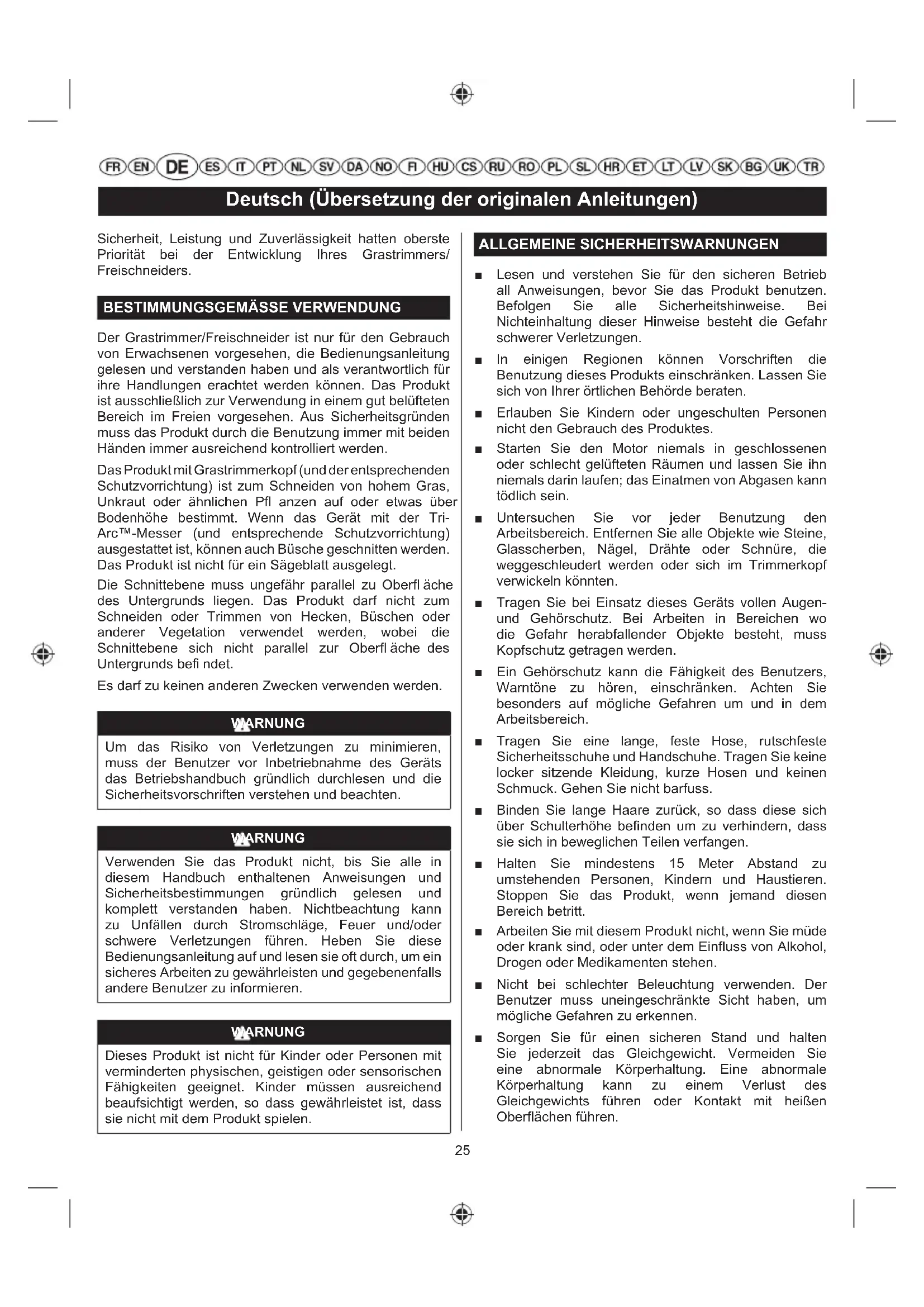 WARNUNG Ein undichter Tankdeckel stellt eine Feuergefahr dar und muss unverzüglich ersetzt werden! Der Tankdeckel enthält einen wartungsfreien Filter und ein Rückschlagventil. Ein verstopfter Treibstofffi lter führt zu einer verschlechterten Motorleistung. Falls die Leistung sich verbessert, wenn der Tankdeckel gelöst wird, kann das Rückschlagventil defekt oder der Filter verstopft sein. Ersetzen Sie falls erforderlich den Tankdeckel.37 Deutsch (Übersetzung der originalen Anleitungen) ZÜNDKERZE Dieser Motor verwendet eine L8RTF/NHSP LD oder L8RTF/BOSCH oder gleichwertige Zündkerze mit 0.5 mm Elektrodenabstand. Benutzen Sie einen genauen Ersatz. VORSICHT Darauf achten, die Zündkerze nicht verkantet einzuschrauben. Durch Verschneiden wird der Motor schwer beschädigt.38 Deutsch (Übersetzung der originalen Anleitungen) FEHLERBEHEBUNG Problem Mögliche Ursache Lösung Motor springt nicht an. Kein Zündfunke. Die Zündkerze kann beschädigt sein, entfernen Sie sie und überprüfen Sie sie auf Schmutz und Risse. Ersetzen durch eine neue Zündkerze. Kein Treibstoff Betätigen Sie den Einspritzknopf, bis sie mit Kraftstoff gefüllt ist. Wenn sich der Einspritzknopf nicht füllt, ist das Kraftstoffzuleitungssystem verstopft. Wenden Sie sich an IhrReparatur- zentrum. Wenn sich der Einspritzknopf füllt, ist der Motor möglicherweise abgesoffen (siehe folgender Abschnitt). Motor ist "abgesoffen". Entfernen Sie die Zündkerze und drehen dann das Gerät so, dass das Zündkerzenloch auf den Boden gerichtet ist. Stellen Sie den Chokehebel auf die Position und ziehen Sie den Startegriff 10 bis 15 Mal. Das entfernt überschüssigen Kraftstoff aus dem Motor. Die Zündkerze reinigen und wieder einbauen. Drücken Sie, bei geöffnetem Choke, den Gashebel voll durch und ziehen den Startergriff, bis der Motor startet. Ziehen Sie den Startergriff nicht mehr als 3 Mal. Wenn der Motor nicht startet, stellen Sie den Chokehebel auf die Position und wiederholen den normalen Startvorgang. Wenn der Motor noch immer nicht anspringt, den Vorgang mit einer neuen Zündkerze wiederholen. Das Starterseil lässt sich schwerer als im Neuzustand ziehen. Wenden Sie sich an einen Kundendienst. Griffknöpfe nicht festgezogen. Das Produkt verfügt über einen eingebauten Mikroschalter, der den Motor deaktiviert, wenn der Knopf nicht vollständig festgedreht ist und die Ausrichtungspfeile nicht richtig ausgerichtet sind. Stellen Sie sicher, dass die Ausrichtungspfeile ausgerichtet sind. Den Knopf fest anziehen. Motor springt an, nimmt aber kein Gas an. Vergaser muss eingestellt werden. Wenden Sie sich an einen Kundendienst. Motor erreicht die Nenndrehzahl nicht und/oder raucht stark. Öl-Kraftstoff-Gemisch prüfen. Frisches Benzin und die korrekte Zweitaktmotorölmischung verwenden. Luftfilter ist verschmutzt. Siehe Wartung - Luftfilter reinigen wie vorher beschrieben in dieser Bedienungsanleitung. Vergaser muss eingestellt werden. Wenden Sie sich an einen Kundendienst. Motor springt an, läuft, beschleunigt, läuft aber nicht bei Leerlaufdrehzahl. Vergaser muss eingestellt werden. Wenden Sie sich an einen Kundendienst. Das Messer dreht im Leerlauf weiter. Vergaser muss eingestellt werden. Wenden Sie sich an einen Kundendienst. Das Gras wickelt sich um den Schaft und Schneidkopf ein. Schneiden von hohem Gras auf Bodenhöhe Schneiden Sie hohes Gras von oben nach unten. Betreiben des Geräts bei gedrosselter Drehzahl. Betreiben Sie das Gerät bei voller Drehzahl.39 Deutsch (Übersetzung der originalen Anleitungen) Öl tropft aus dem Schalldämpfer. Betreiben des Geräts bei gedrosselter Drehzahl. Betreiben Sie das Gerät bei voller Drehzahl. Öl-Kraftstoff-Gemisch prüfen. Frisches Benzin und die korrekte Zweitaktmotorölmischung verwenden. Luftfilter ist verschmutzt. Siehe Wartung - Luftfilter reinigen wie vorher beschrieben in dieser Bedienungsanleitung. Vergaser muss eingestellt werden. Wenden Sie sich an einen Kundendienst.40 Español (Traducción de las instrucciones originales) En el diseño de este cortacésped/desbrozadora, se ha dado prioridad absoluta a la seguridad, el rendimiento y la fi abilidad. USO PREVISTO El uso del cortacésped/desbrozadora está destinado exclusivamente a personas adultas que hayan leído y comprendido las instrucciones y las advertencias de este manual, y que puedan considerarse responsables de sus acciones. El producto solo está pensado para utilizarse al aire libre en una zona bien ventilada. Por razones de seguridad, es necesario controlar el producto correctamente utilizando las dos manos. El producto equipado con el cabezal del cortacésped (y la protección adecuada) está destinado a cortar césped alto, hierbas con mucho tallo y vegetación similar a nivel del suelo o cerca de este. Si se utiliza con la cuchilla Tri-Arc™ (y la protección adecuada), también sirve para cortar arbustos. El producto no está diseñado para equiparse con una hoja de sierra. El plano de corte debe ser aproximadamente paralelo a la superfi cie del suelo. Este producto no debería ser utilizado para cortar o recortar setos, arbustos u otro tipo de vegetación cuando el plano de corte no es paralelo a la superfi cie del suelo. No utilice el producto para cualquier otro propósito que no sea alguno de los mencionados anteriormente. ADVERTENCIA Para reducir el riesgo de lesiones, el usuario debe leer y entender el manual del operario antes de usar este producto. ADVERTENCIA No intente poner en funcionamiento el producto hasta que haya leído atentamente todas las instrucciones y normas de seguridad incluidas en este manual y las haya comprendido por completo. Si no las cumple correctamente puede provocar accidentes relacionados con descargas eléctricas, incendios y/o lesiones personales graves. Conserve este manual de utilización y consúltelo a menudo para trabajar con total seguridad e informar a otros posibles usuarios. ADVERTENCIA Este producto no debe ser utilizado por niños o personas con dis