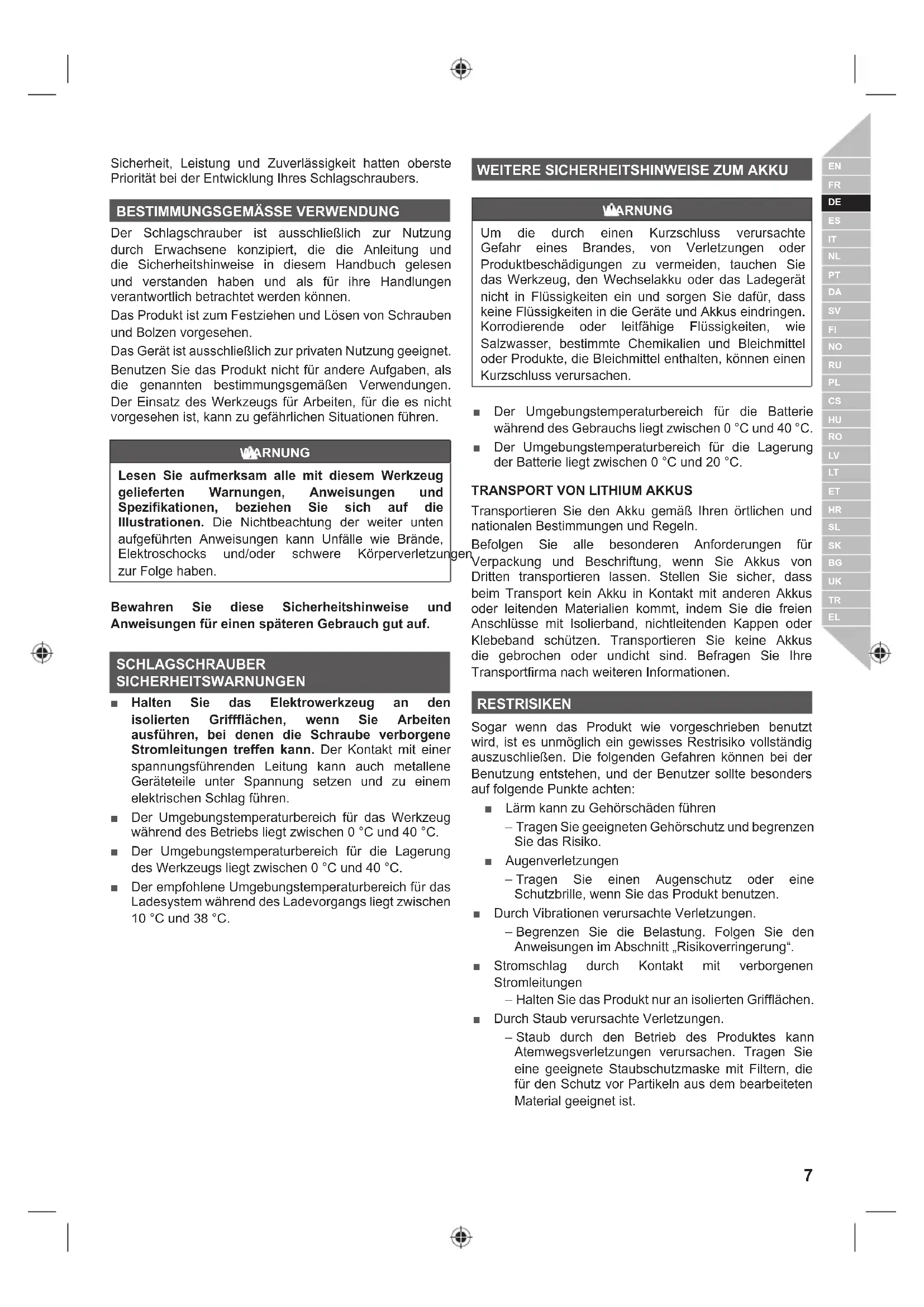 WARNUNG Um die durch einen Kurzschluss verursachte Gefahr eines Brandes, von Verletzungen oder Produktbeschädigungen zu vermeiden, tauchen Sie das Werkzeug, den Wechselakku oder das Ladegerät nicht in Flüssigkeiten ein und sorgen Sie dafür, dass keine Flüssigkeiten in die Geräte und Akkus eindringen. Korrodierende oder leitfähige Flüssigkeiten, wie Salzwasser, bestimmte Chemikalien und Bleichmittel oder Produkte, die Bleichmittel enthalten, können einen Kurzschluss verursachen. Ŷ Der Umgebungstemperaturbereich für die Batterie während des Gebrauchs liegt zwischen 0 °C und 40 °C. Ŷ Der Umgebungstemperaturbereich für die Lagerung der Batterie liegt zwischen 0 °C und 20 °C.