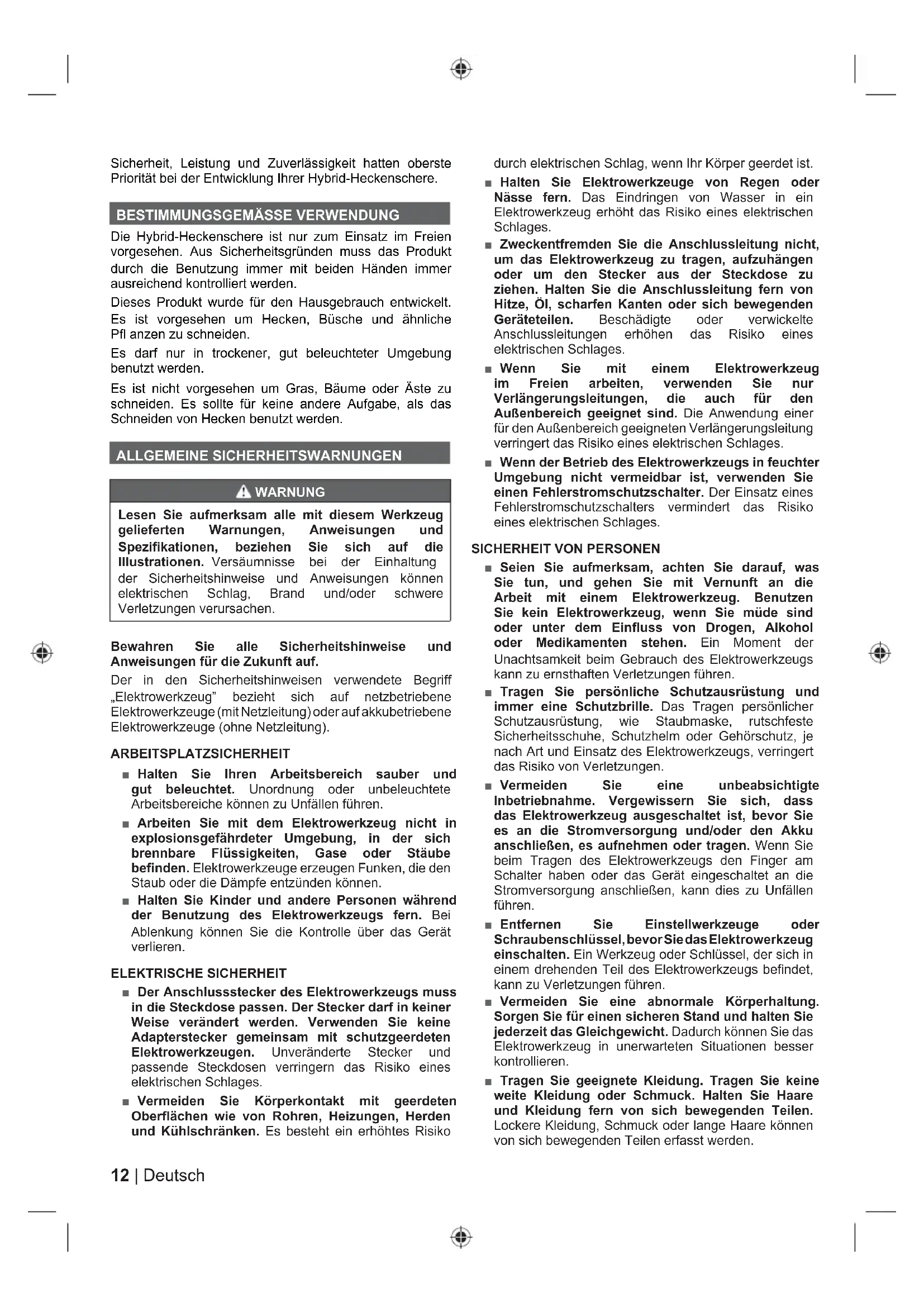 Die Hybrid-Heckenschere ist nur zum Einsatz im Freien vorgesehen. Aus Sicherheitsgründen muss das Produkt durch die Benutzung immer mit beiden Händen immer ausreichend kontrolliert werden. Dieses Produkt wurde für den Hausgebrauch entwickelt. Es ist vorgesehen um Hecken, Büsche und ähnliche Pfl anzen zu schneiden. Es darf nur in trockener, gut beleuchteter Umgebung benutzt werden. Es ist nicht vorgesehen um Gras, Bäume oder Äste zu schneiden. Es sollte für keine andere Aufgabe, als das Schneiden von Hecken benutzt werden. ALLGEMEINE SICHERHEITSWARNUNGEN WARNUNG Lesen Sie aufmerksam alle mit diesem Werkzeug gelieferten Warnungen, Anweisungen und Spezifikationen, beziehen Sie sich auf die Illustrationen. Versäumnisse bei der Einhaltung der Sicherheitshinweise und Anweisungen können elektrischen Schlag, Brand und/oder schwere Verletzungen verursachen. Bewahren Sie alle Sicherheitshinweise und Anweisungen für die Zukunft auf. Der in den Sicherheitshinweisen verwendete Begriff „Elektrowerkzeug” bezieht sich auf netzbetriebene Elektrowerkzeuge (mit Netzleitung) oder auf akkubetriebene Elektrowerkzeuge (ohne Netzleitung). ARBEITSPLATZSICHERHEIT ■ Halten Sie Ihren Arbeitsbereich sauber und gut beleuchtet. Unordnung oder unbeleuchtete Arbeitsbereiche können zu Unfällen führen. ■ Arbeiten Sie mit dem Elektrowerkzeug nicht in explosionsgefährdeter Umgebung, in der sich brennbare Flüssigkeiten, Gase oder Stäube befinden. Elektrowerkzeuge erzeugen Funken, die den Staub oder die Dämpfe entzünden können. ■ Halten Sie Kinder und andere Personen während der Benutzung des Elektrowerkzeugs fern. Bei Ablenkung können Sie die Kontrolle über das Gerät verlieren. ELEKTRISCHE SICHERHEIT ■ Der Anschlussstecker des Elektrowerkzeugs muss in die Steckdose passen. Der Stecker darf in keiner Weise verändert werden. Verwenden Sie keine Adapterstecker gemeinsam mit schutzgeerdeten Elektrowerkzeugen. Unveränderte Stecker und passende Steckdosen verringern das Risiko eines elektrischen Schlages. ■ Vermeiden Sie Körperkontakt mit geerdeten Oberflächen wie von Rohren, Heizungen, Herden und Kühlschränken. Es besteht ein erhöhtes Risiko durch elektrischen Schlag, wenn Ihr Körper geerdet ist. ■ Halten Sie Elektrowerkzeuge von Regen oder Nässe fern. Das Eindringen von Wasser in ein Elektrowerkzeug erhöht das Risiko eines elektrischen Schlages. ■ Zweckentfremden Sie die Anschlussleitung nicht, um das Elektrowerkzeug zu tragen, aufzuhängen oder um den Stecker aus der Steckdose zu ziehen. Halten Sie die Anschlussleitung fern von Hitze, Öl, scharfen Kanten oder sich bewegenden Geräteteilen. Beschädigte oder verwickelte Anschlussleitungen erhöhen das Risiko eines elektrischen Schlages. ■ Wenn Sie mit einem Elektrowerkzeug im Freien arbeiten, verwenden Sie nur Verlängerungsleitungen, die auch für den Außenbereich geeignet sind. Die Anwendung einer für den Außenbereich geeigneten Verlängerungsleitung verringert das Risiko eines elektrischen Schlages. ■ Wenn der Betrieb des Elektrowerkzeugs in feuchter Umgebung nicht vermeidbar ist, verwenden Sie einen Fehlerstromschutzschalter. Der Einsatz eines Fehlerstromschutzschalters vermindert das Risiko eines elektrischen Schlages.