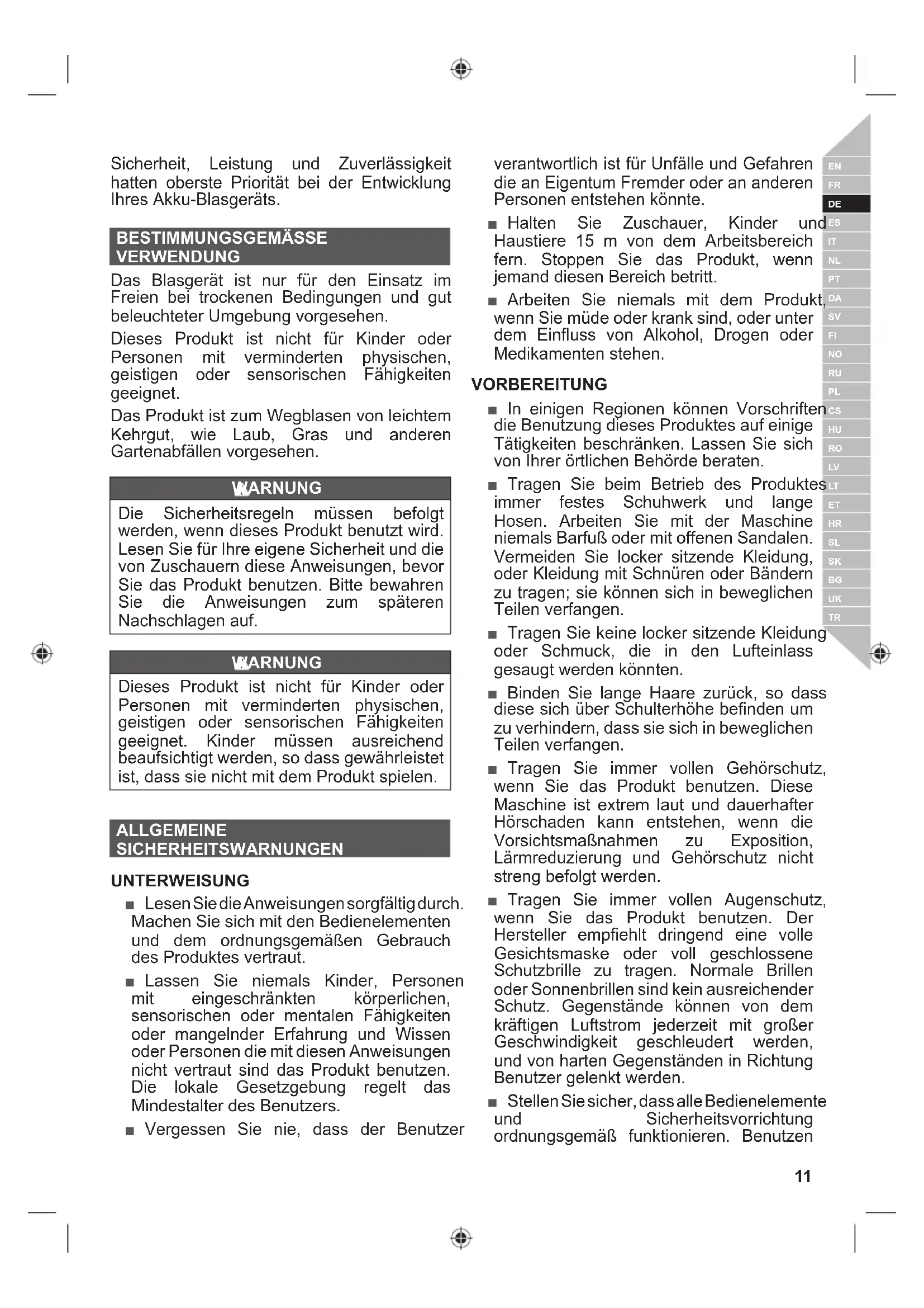 Sicherheit, Leistung und Zuverlässigkeit hatten oberste Priorität bei der Entwicklung Ihres Akku-Blasgeräts. BESTIMMUNGSGEMÄSSE VERWENDUNG Das Blasgerät ist nur für den Einsatz im Freien bei trockenen Bedingungen und gut beleuchteter Umgebung vorgesehen. Dieses Produkt ist nicht für Kinder oder Personen mit verminderten physischen, geistigen oder sensorischen Fähigkeiten geeignet. Das Produkt ist zum Wegblasen von leichtem Kehrgut, wie Laub, Gras und anderen Gartenabfällen vorgesehen. WARNUNG Die Sicherheitsregeln müssen befolgt werden, wenn dieses Produkt benutzt wird. Lesen Sie für Ihre eigene Sicherheit und die von Zuschauern diese Anweisungen, bevor Sie das Produkt benutzen. Bitte bewahren Sie die Anweisungen zum späteren Nachschlagen auf. WARNUNG Dieses Produkt ist nicht für Kinder oder Personen mit verminderten physischen, geistigen oder sensorischen Fähigkeiten geeignet. Kinder müssen ausreichend beaufsichtigt werden, so dass gewährleistet ist, dass sie nicht mit dem Produkt spielen. ALLGEMEINE SICHERHEITSWARNUNGEN UNTERWEISUNG ■ Lesen Sie die Anweisungen sorgfältig durch. Machen Sie sich mit den Bedienelementen und dem ordnungsgemäßen Gebrauch des Produktes vertraut. ■ Lassen Sie niemals Kinder, Personen mit eingeschränkten körperlichen, sensorischen oder mentalen Fähigkeiten oder mangelnder Erfahrung und Wissen oder Personen die mit diesen Anweisungen nicht vertraut sind das Produkt benutzen. Die lokale Gesetzgebung regelt das Mindestalter des Benutzers. ■ Vergessen Sie nie, dass der Benutzer verantwortlich ist für Unfälle und Gefahren die an Eigentum Fremder oder an anderen Personen entstehen könnte. ■ Halten Sie Zuschauer, Kinder und Haustiere 15 m von dem Arbeitsbereich fern. Stoppen Sie das Produkt, wenn jemand diesen Bereich betritt. ■ Arbeiten Sie niemals mit dem Produkt, wenn Sie müde oder krank sind, oder unter dem Einfluss von Alkohol, Drogen oder Medikamenten stehen. VORBEREITUNG ■ In einigen Regionen können Vorschriften die Benutzung dieses Produktes auf einige Tätigkeiten beschränken. Lassen Sie sich von Ihrer örtlichen Behörde beraten. ■ Tragen Sie beim Betrieb des Produktes immer festes Schuhwerk und lange Hosen. Arbeiten Sie mit der Maschine niemals Barfuß oder mit offenen Sandalen. Vermeiden Sie locker sitzende Kleidung, oder Kleidung mit Schnüren oder Bändern zu tragen; sie können sich in beweglichen Teilen verfangen. ■ Tragen Sie keine locker sitzende Kleidung oder Schmuck, die in den Lufteinlass gesaugt werden könnten. ■ Binden Sie lange Haare zurück, so dass diese sich über Schulterhöhe befinden um zu verhindern, dass sie sich in beweglichen Teilen verfangen. ■ Tragen Sie immer vollen Gehörschutz, wenn Sie das Produkt benutzen. Diese Maschine ist extrem laut und dauerhafter Hörschaden kann entstehen, wenn die Vorsichtsmaßnahmen zu Exposition, Lärmreduzierung und Gehörschutz nicht streng befolgt werden. ■ Tragen Sie immer vollen Augenschutz, wenn Sie das Produkt benutzen. Der Hersteller empfiehlt dringend eine volle Gesichtsmaske oder voll geschlossene Schutzbrille zu tragen. Normale Brillen oder Sonnenbrillen sind kein ausreichender Schutz. Gegenstände können von dem kräftigen Luftstrom jederzeit mit großer Geschwindigkeit geschleudert werden, und von harten Gegenständen in Richtung Benutzer gelenkt werden. ■ Stellen Sie sicher, dass alle Bedienelemente und Sicherheitsvorrichtung ordnungsgemäß funktionieren. Benutzen12 | Deutsch Sie das Werkzeug nicht, wenn der "Aus" -Schalter das Produkt nicht stoppt. ■ Überprüfen Sie das Gehäuse vor jeder Benutzung auf Beschädigung. Stellen Sie sicher, dass alle Schutzabdeckungen und Griffe montiert und ordnungsgemäß gesichert sind. ■ Zu einem autorisierten Kundendienst zurückbringen, um beschädigte oder unleserliche Aufkleber zu ersetzen. ■ Betreiben Sie das Produkt niemals mit defekten Schutzvorrichtungen oder Abschirmungen oder ohne montierte Sicherheitsvorrichtungen. ■ Halten Sie alle Lüftungseinlässe von Verunreinigungen frei. ■ Verwenden Sie Rechen und Besen um Verschmutzungen zu lösen, bevor sie das Blasgerät einsetzen. ■ Reinigen Sie vor jeder Benutzung den Arbeitsbereich. Entfernen Sie alle Objekte wie z.B. Steine, zerbrochenes Glas, Nägel, Draht oder Fäden, die von dem Luftstrom eine beträchtliche Distanz geblasen werden können. ■ Bedienen Sie das Produkt nur auf einem festen, ebenen Untergrund.