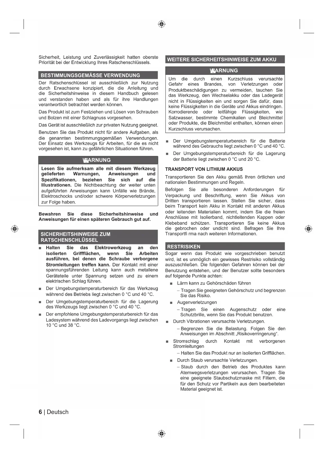 Der Ratschenschlüssel ist ausschließlich zur Nutzung durch Erwachsene konzipiert, die die Anleitung und die Sicherheitshinweise in diesem Handbuch gelesen und verstanden haben und als für ihre Handlungen verantwortlich betrachtet werden können. Das Produkt ist zum Festziehen und Lösen von Schrauben und Bolzen mit einer Schlagnuss vorgesehen. Das Gerät ist ausschließlich zur privaten Nutzung geeignet. Benutzen Sie das Produkt nicht für andere Aufgaben, als die genannten bestimmungsgemäßen Verwendungen. Der Einsatz des Werkzeugs für Arbeiten, für die es nicht vorgesehen ist, kann zu gefährlichen Situationen führen. WARNUNG Lesen Sie aufmerksam alle mit diesem Werkzeug gelieferten Warnungen, Anweisungen und Spezifikationen, beziehen Sie sich auf die Illustrationen. Die Nichtbeachtung der weiter unten aufgeführten Anweisungen kann Unfälle wie Brände, Elektroschocks und/oder schwere Körperverletzungen zur Folge haben. Bewahren Sie diese Sicherheitshinweise und Anweisungen für einen späteren Gebrauch gut auf. SICHERHEITSHINWEISE ZUM RATSCHENSCHLÜSSEL ■ Halten Sie das Elektrowerkzeug an den isolierten Griffflächen, wenn Sie Arbeiten ausführen, bei denen die Schraube verborgene Stromleitungen treffen kann. Der Kontakt mit einer spannungsführenden Leitung kann auch metallene Geräteteile unter Spannung setzen und zu einem elektrischen Schlag führen. ■ Der Umgebungstemperaturbereich für das Werkzeug während des Betriebs liegt zwischen 0 °C und 40 °C. ■ Der Umgebungstemperaturbereich für die Lagerung des Werkzeugs liegt zwischen 0 °C und 40 °C. ■ Der empfohlene Umgebungstemperaturbereich für das Ladesystem während des Ladevorgangs liegt zwischen 10 °C und 38 °C.