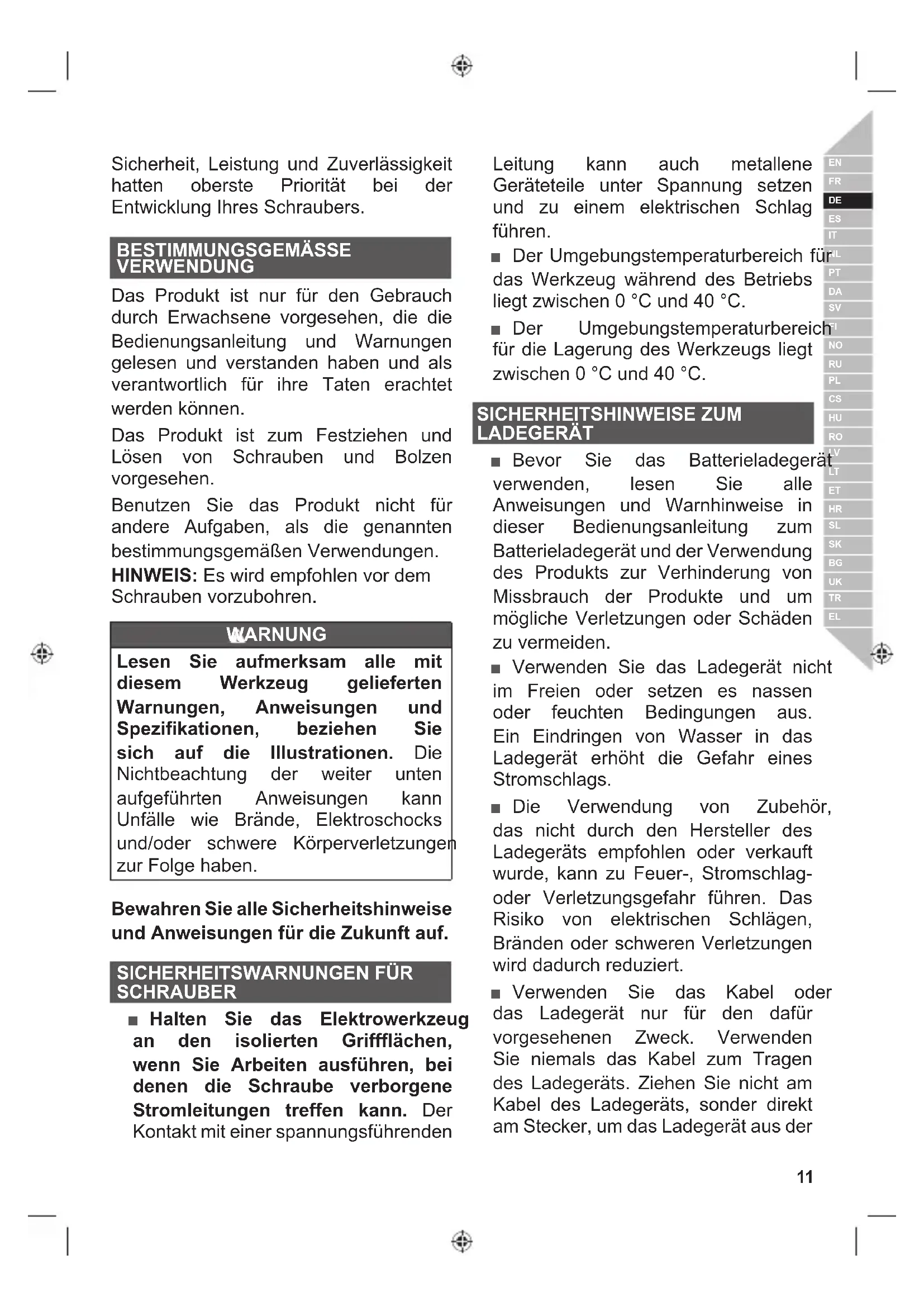 Sicherheit, Leistung und Zuverlässigkeit hatten oberste Priorität bei der Entwicklung Ihres Schraubers. BESTIMMUNGSGEMÄSSE VERWENDUNG Das Produkt ist nur für den Gebrauch durch Erwachsene vorgesehen, die die Bedienungsanleitung und Warnungen gelesen und verstanden haben und als verantwortlich für ihre Taten erachtet werden können. Das Produkt ist zum Festziehen und Lösen von Schrauben und Bolzen vorgesehen. Benutzen Sie das Produkt nicht für andere Aufgaben, als die genannten bestimmungsgemäßen Verwendungen. HINWEIS: Es wird empfohlen vor dem Schrauben vorzubohren. WARNUNG Lesen Sie aufmerksam alle mit diesem Werkzeug gelieferten Warnungen, Anweisungen und Spezifikationen, beziehen Sie sich auf die Illustrationen. Die Nichtbeachtung der weiter unten aufgeführten Anweisungen kann Unfälle wie Brände, Elektroschocks