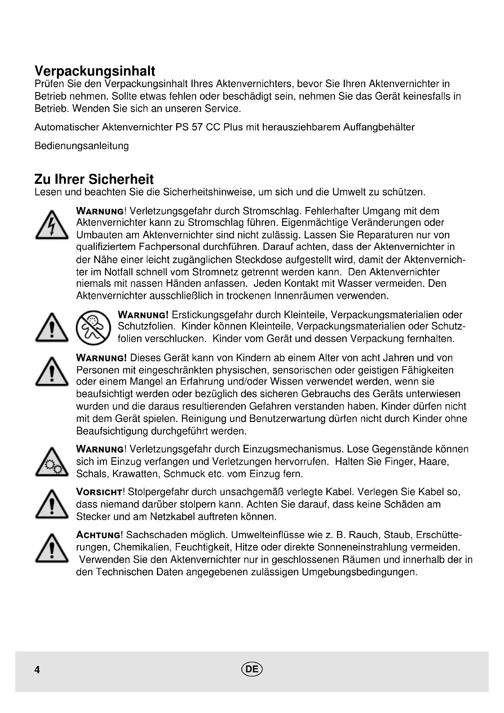 - Záruka Verpackungsinhalt Prüfen Sie den Verpackungsinhalt Ihres Aktenvernichters, bevor Sie Ihren Aktenvernichter in Betrieb nehmen. Sollte etwas fehlen oder beschädigt sein, nehmen Sie das Gerät keinesfalls in Betrieb. Wenden Sie sich an unseren Service. Automatischer Aktenvernichter PS 57 CC Plus mit herausziehbarem Auangbehälter Bedienungsanleitung Zu Ihrer Sicherheit Lesen und beachten Sie die Sicherheitshinweise, um sich und die Umwelt zu schützen. Warnung! Verletzungsgefahr durch Stromschlag. Fehlerhafter Umgang mit dem Aktenvernichter kann zu Stromschlag führen. Eigenmächtige Veränderungen oder Umbauten am Aktenvernichter sind nicht zulässig. Lassen Sie Reparaturen nur von qualiziertem Fachpersonal durchführen. Darauf achten, dass der Aktenvernichter in der Nähe einer leicht zugänglichen Steckdose aufgestellt wird, damit der Aktenvernich- ter im Notfall schnell vom Stromnetz getrennt werden kann. Den Aktenvernichter niemals mit nassen Händen anfassen. Jeden Kontakt mit Wasser vermeiden. Den Aktenvernichter ausschließlich in trockenen Innenräumen verwenden. Warnung! Erstickungsgefahr durch Kleinteile, Verpackungsmaterialien oder Schutzfolien. Kinder können Kleinteile, Verpackungsmaterialien oder Schutz- folien verschlucken. Kinder vom Gerät und dessen Verpackung fernhalten. Warnung! Dieses Gerät kann von Kindern ab einem Alter von acht Jahren und von Personen mit eingeschränkten physischen, sensorischen oder geistigen Fähigkeiten oder einem Mangel an Erfahrung und/oder Wissen verwendet werden, wenn sie beaufsichtigt werden oder bezüglich des sicheren Gebrauchs des Geräts unterwiesen wurden und die daraus resultierenden Gefahren verstanden haben. Kinder dürfen nicht mit dem Gerät spielen. Reinigung und Benutzerwartung dürfen nicht durch Kinder ohne Beaufsichtigung durchgeführt werden. Warnung! Verletzungsgefahr durch Einzugsmechanismus. Lose Gegenstände können sich im Einzug verfangen und Verletzungen hervorrufen. Halten Sie Finger, Haare, Schals, Krawatten, Schmuck etc. vom Einzug fern. Vorsicht! Stolpergefahr durch unsachgemäß verlegte Kabel. Verlegen Sie Kabel so, dass niemand darüber stolpern kann. Achten Sie darauf, dass keine Schäden am Stecker und am Netzkabel auftreten können. Achtung! Sachschaden möglich. Umwelteinüsse wie z. B. Rauch, Staub, Erschütte- rungen, Chemikalien, Feuchtigkeit, Hitze oder direkte Sonneneinstrahlung vermeiden. Verwenden Sie den Aktenvernichter nur in geschlossenen Räumen und innerhalb der in den Technischen Daten angegebenen zulässigen Umgebungsbedingungen. p. 594