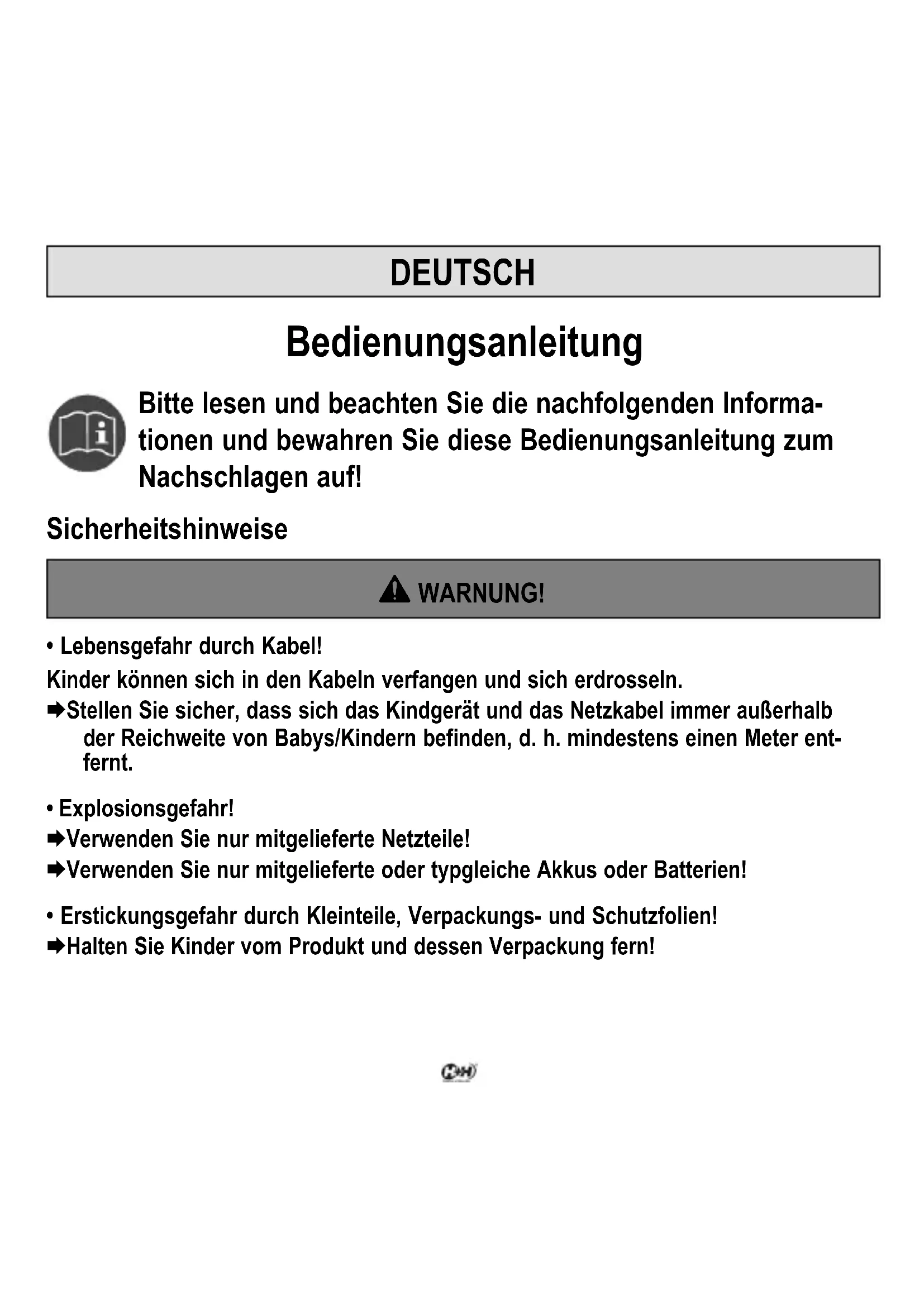 - Lebensgefahr durch Kabel! Kinder können sich in den Kabeln verfangen und sich erdrosseln. Stellen Sie sicher, dass sich das Kindgerät und das Netzkabel immer außerhalb der Reichweite von Babys/Kindern befinden, d. h. mindestens einen Meter ent fernt.
