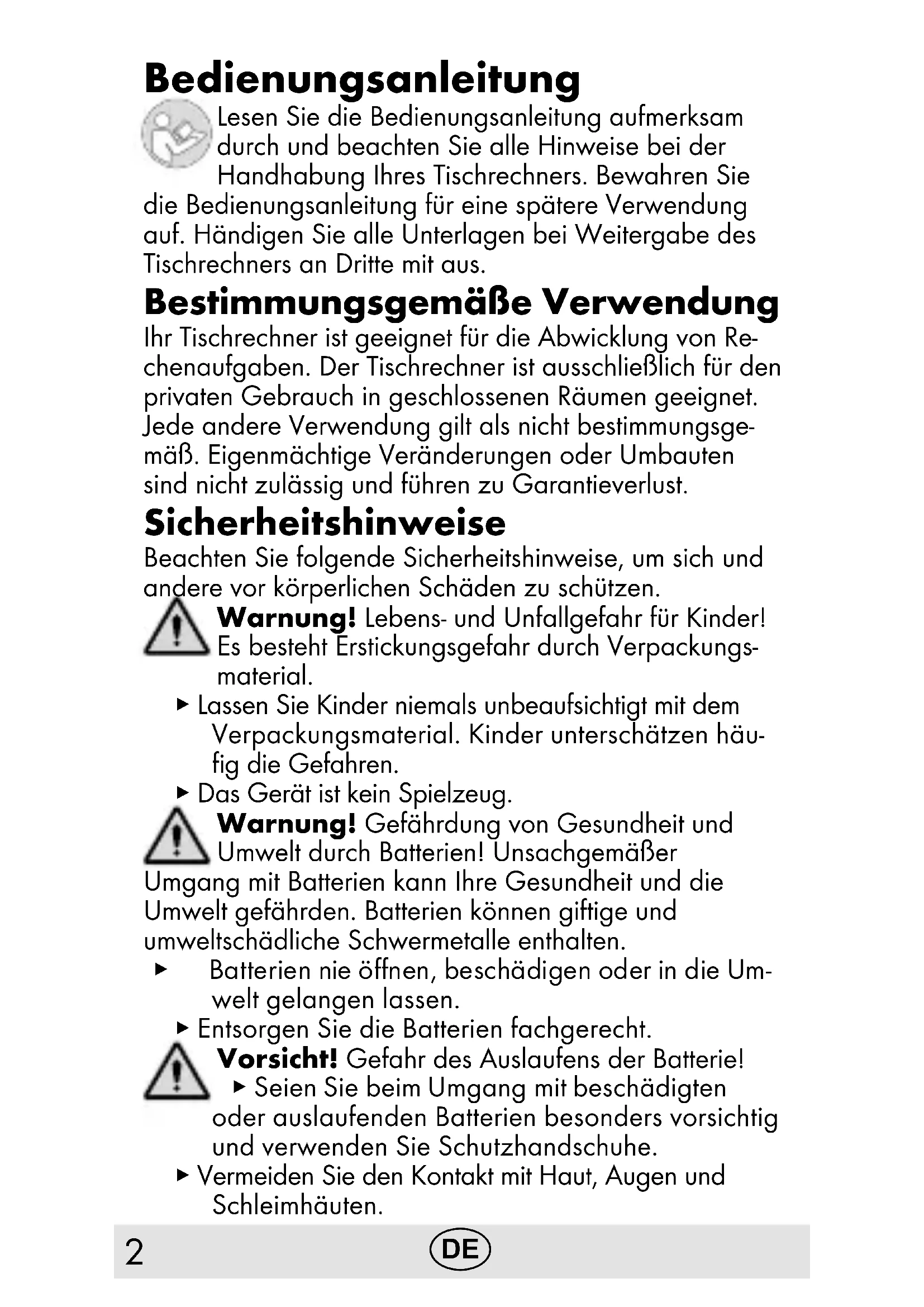 Bedienungsanleitung Lesen Sie die Bedienungsanleitung aufmerksam durch und beachten Sie alle Hinweise bei der Handhabung Ihres Tischrechners. Bewahren Sie die Bedienungsanleitung für eine spätere Verwendung auf. Händigen Sie alle Unterlagen bei Weitergabe des Tischrechners an Dritte mit aus. Bestimmungsgemäße Verwendung Ihr Tischrechner ist geeignet für die Abwicklung von Re- chenaufgaben. Der Tischrechner ist ausschließlich für den privaten Gebrauch in geschlossenen Räumen geeignet. Jede andere Verwendung gilt als nicht bestimmungsge- mäß. Eigenmächtige Veränderungen oder Umbauten sind nicht zulässig und führen zu Garantieverlust. Sicherheitshinweise Beachten Sie folgende Sicherheitshinweise, um sich und andere vor körperlichen Schäden zu schützen. Warnung! Lebens- und Unfallgefahr für Kinder! Es besteht Erstickungsgefahr durch Verpackungs- material.