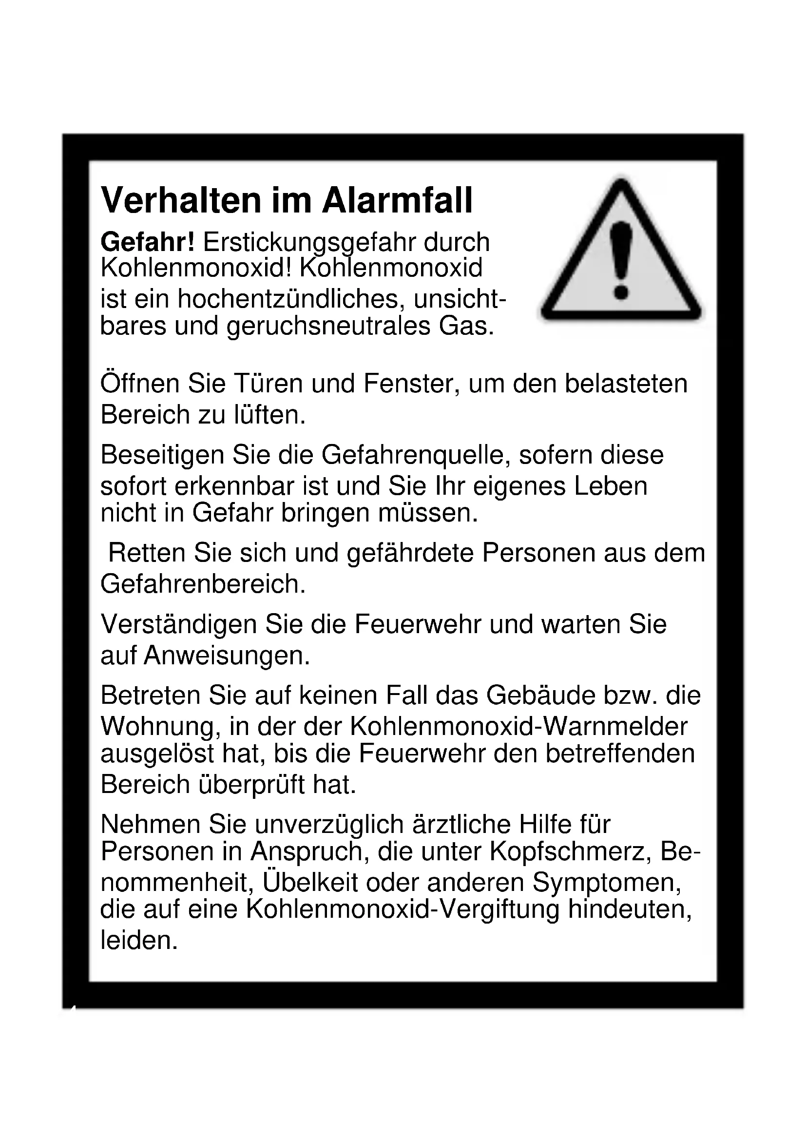 Inhaltsverzeichnis Verhalten im Alarmfall 4 Sicherheitshinweise 5 Wichtige Hinweise und Prävention 7 Bestimmungsgemäße Verwendung 8 Verpackungsinhalt 8 Übersicht 9 Batterien einlegen 10 Montageort auswählen 10 CO-Warnmelder montieren 12 Im Alarmfall 13 Alarm ausschalten 13 Batterie-Warnhinweis 14 CO-Warnmelder auf Funktion prüfen 14 Selbsttest 15 Gebrauchsende 15 Lautlos-Modus einschalten 16 Was Sie sonst noch wissen müssen 17 Symptome bei Kohlenmonoxid-Vergiftung 17 Reaktionszeit des CO-Warnmelders 19 Entsorgung 20 Technische Daten 21 Wartung und Pege 22 Garantie 23 Konformitätserklärung 234 Verhalten im Alarmfall Gefahr! Erstickungsgefahr durch Kohlenmonoxid! Kohlenmonoxid ist ein hochentzündliches, unsicht- bares und geruchsneutrales Gas Öffnen Sie Türen und Fenster, um den belasteten Bereich zu lüften Beseitigen Sie die Gefahrenquelle, sofern diese sofort erkennbar ist und Sie Ihr eigenes Leben nicht in Gefahr bringen müssen Retten Sie sich und gefährdete Personen aus dem Gefahrenbereich Verständigen Sie die Feuerwehr und warten Sie auf Anweisungen Betreten Sie auf keinen Fall das Gebäude bzw die Wohnung, in der der Kohlenmonoxid-Warnmelder ausgelöst hat, bis die Feuerwehr den betreffenden Bereich überprüft hat Nehmen Sie unverzüglich ärztliche Hilfe für Personen in Anspruch, die unter Kopfschmerz, Be- nommenheit, Übelkeit oder anderen Symptomen, die auf eine Kohlenmonoxid-Vergiftung hindeuten, leiden5 Sicherheitshinweise Lesen Sie die Bedienungsanleitung aufmerksam durch und beachten Sie die Hinweise bei der Handhabung des Kohlenmonoxid-Warnmelders Bewahren Sie die Bedienungsanleitung für eine spätere Verwendung auf Achten Sie auf dieses Symbol Die mit diesem Symbol gekennzeichneten Texte geben Ihnen nützliche Hinweise Warnung! Kohlenmonoxid kann tödliche Auswirkungen haben Die Kohlenmonoxid-Kon- zentration im Blut stört die Fähigkeit des Körpers, sich mit Sauerstoff zu versorgen Je nach Konzentration kann Kohlenmonoxid in Minuten tödlich wirken Beachten Sie die Abschnitte Verhalten im Alarmfall auf Seite 4, Wichtige Hinweise und Prävention auf Seite 7 sowie Was Sie sonst noch wissen müssen auf Seite 17 Warnung! Kohlenmonoxid ist ein hochentzündli- ches, unsichtbares und geruchsneutrales Gas Nehmen Sie jeden Alarm ernst Vermeiden Sie im Alarmfall jegliche Funken- oder Flammenbildung! Im Alarmfall darf weder geraucht noch eine Kerze angezündet werden Schalten Sie kein Licht an und ziehen Sie keine elektrischen Stecker Folgen Sie den Anweisungen im Abschnitt Verhalten im Alarmfall auf Seite 46 Warnung! Erstickungsgefahr! Kinder können Kleinteile, Verpackungs- oder Schutzfolien verschlucken Halten Sie Kinder vom Produkt und dessen Verpackung fern! Warnung! Gefährdung von Gesundheit und Umwelt durch Akkus und Batterien! Unsachge- mäßer Umgang mit Batterien kann Ihre Gesundheit und die Umwelt gefährden Batterien nie öffnen, beschädigen, verschlucken oder in die Umwelt gelangen lassen Batterien können giftige und umweltschädliche Schwermetalle enthalten Vorsicht! Gehörschaden durch lautes Warnsignal! Das laute Warnsignal kann das Gehör schädigen Verwenden Sie das Gerät nur an den empfohlenen Montageorten Halten Sie sich im Alarmfall nicht über einen längeren Zeitraum in der Nähe des Warnsignals auf Wichtig! Sachschaden durch Umwelteinüsse! Ungüns- tige Umwelteinüsse wie z. B. Rauch, Staub, Erschüt- terungen, Chemikalien, Feuchtigkeit, Hitze oder direkte Sonneneinstrahlung können das Gerät beschädigen bzw die Funktion beeinträchtigen. Umwelteinüsse wie z. B. Rauch, Staub, Erschütterungen, Chemikalien, Feuchtig- keit, Hitze oder direkte Sonneneinstrahlung vermeiden Wichtig! Der Sensor darf aus technischen Gründen nicht länger als 10 Jahre in Betrieb gehalten werden7 Ein chemischer Abnutzungsprozess des Sensors führt dazu, dass der CO-Warnmelder nach Ablauf der angege- benen Lebensdauer von 10 Jahren nicht mehr ordnungs- gemäß funktioniert Ersetzen Sie das Gerät spätestens nach 10 Jahren, auch wenn das äußere Erscheinungsbild keine Abnutzungsspuren erkennen lässt Vermeiden Sie den unmittelbaren Kontakt mit Dämpfen, die von Klebern, Lacken und Reinigungsmitteln ausgehen, um eine schnellere Alterung bzw Abnutzung des Sensors zu verhindern Wichtige Hinweise und Prävention In dieser Bedienungsanleitung wird Kohlenmonoxid mit CO abgekürzt