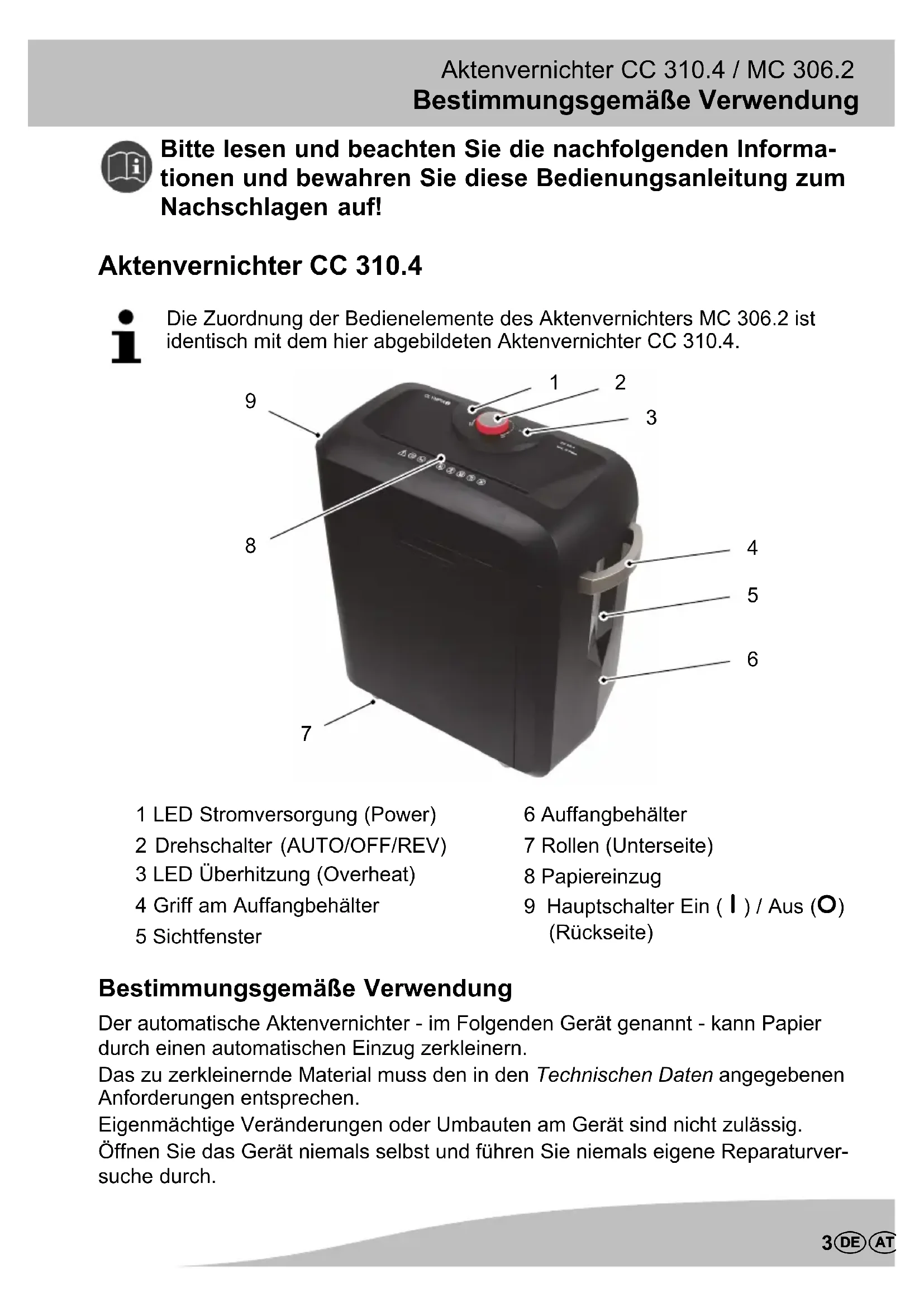 DAc Aktenvernichter Gi Paper Shredder F Destructeur de documents I Distruggi documenti E Destructora de documentos n Papiervernietiger C Skartovač P Destruidor de documentos CC 310.4 MC 306.2Bestimmungsgemäße Verwendung Aktenvernichter CC 310.4 / MC 306.2 3DAc Bitte lesen und beachten Sie die nachfolgenden Informa tionen und bewahren Sie diese Bedienungsanleitung zum Nachschlagen auf! Aktenvernichter CC 310.4 Die Zuordnung der Bedienelemente des Aktenvernichters MC 306.2 ist identisch mit dem hier abgebildeten Aktenvernichter CC 310.4.