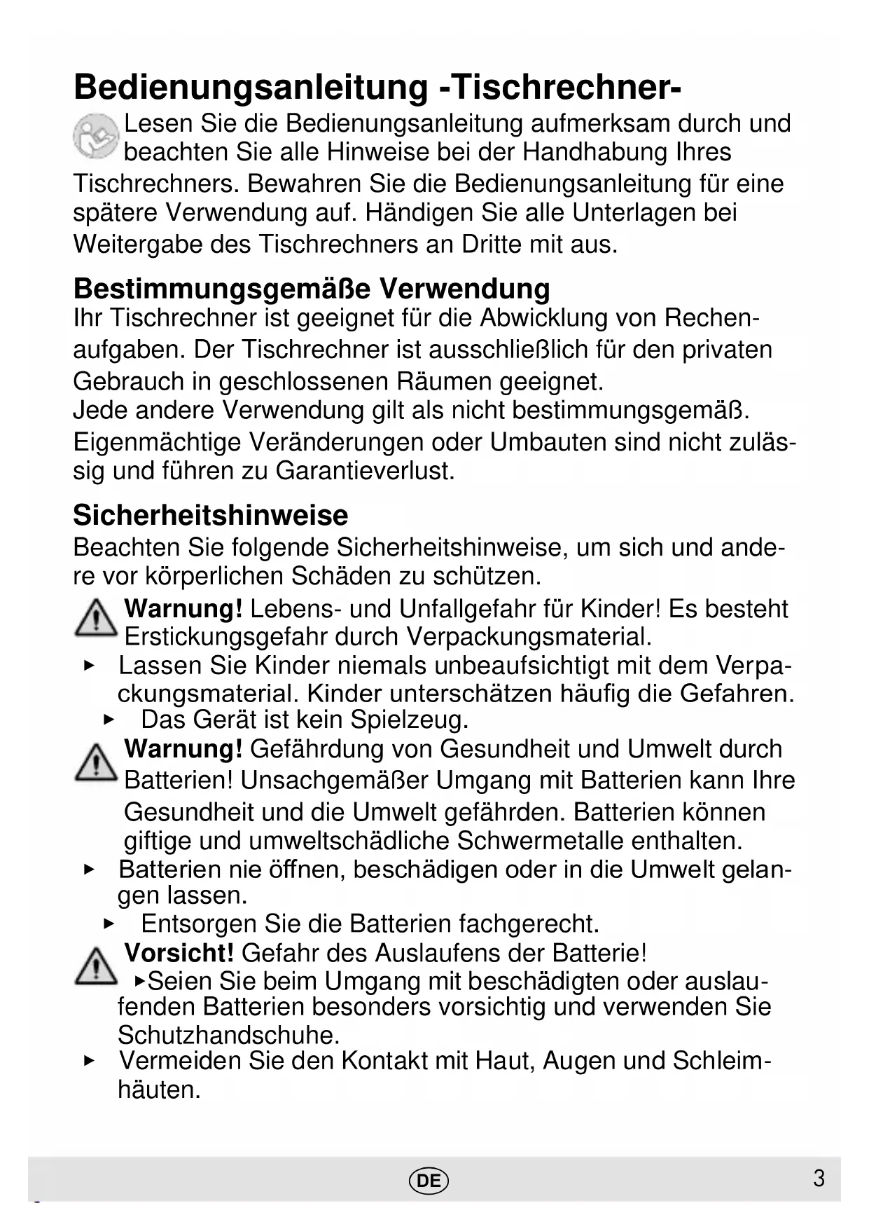 Bedienungsanleitung -Tischrechner- Lesen Sie die Bedienungsanleitung aufmerksam durch und beachten Sie alle Hinweise bei der Handhabung Ihres Tischrechners. Bewahren Sie die Bedienungsanleitung für eine spätere Verwendung auf. Händigen Sie alle Unterlagen bei Weitergabe des Tischrechners an Dritte mit aus. Bestimmungsgemäße Verwendung Ihr Tischrechner ist geeignet für die Abwicklung von Rechen- aufgaben. Der Tischrechner ist ausschließlich für den privaten Gebrauch in geschlossenen Räumen geeignet. Jede andere Verwendung gilt als nicht bestimmungsgemäß. Eigenmächtige Veränderungen oder Umbauten sind nicht zuläs- sig und führen zu Garantieverlust. Sicherheitshinweise Beachten Sie folgende Sicherheitshinweise, um sich und ande- re vor körperlichen Schäden zu schützen. Warnung! Lebens- und Unfallgefahr für Kinder! Es besteht Erstickungsgefahr durch Verpackungsmaterial.