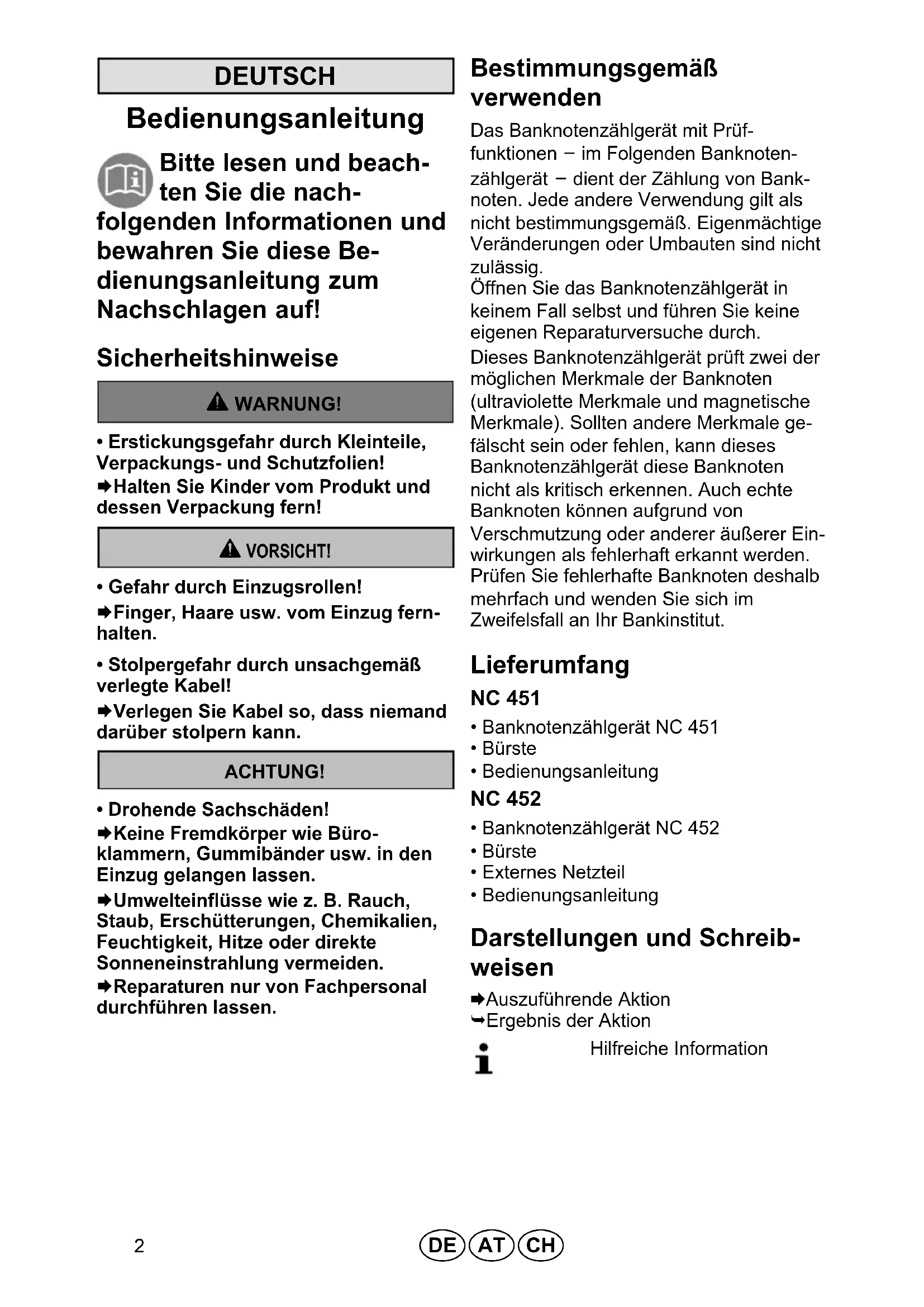 - Drohende Sachschäden! Æ Keine Fremdkörper wie Büro klammern, Gummibänder usw. in den Einzug gelangen lassen. Æ Umwelteinflüsse wie z. B. Rauch, Staub, Erschütterungen, Chemikalien, Feuchtigkeit, Hitze oder direkte Sonneneinstrahlung vermeiden. Æ Reparaturen nur von Fachpersonal durchführen lassen. Bestimmungsgemäß verwenden Das Banknotenzählgerät mit Prüf funktionen – im Folgenden Banknoten zählgerät – dient der Zählung von Bank noten. Jede andere Verwendung gilt als nicht bestimmungsgemäß. Eigenmächtige Veränderungen oder Umbauten sind nicht zulässig. Öffnen Sie das Banknotenzählgerät in keinem Fall selbst und führen Sie keine eigenen Reparaturversuche durch. Dieses Banknotenzählgerät prüft zwei der möglichen Merkmale der Banknoten (ultraviolette Merkmale und magnetische Merkmale). Sollten andere Merkmale ge fälscht sein oder fehlen, kann dieses Banknotenzählgerät diese Banknoten nicht als kritisch erkennen. Auch echte Banknoten können aufgrund von Verschmutzung oder anderer äußerer Ein wirkungen als fehlerhaft erkannt werden. Prüfen Sie fehlerhafte Banknoten deshalb mehrfach und wenden Sie sich im Zweifelsfall an Ihr Bankinstitut. Lieferumfang NC 451