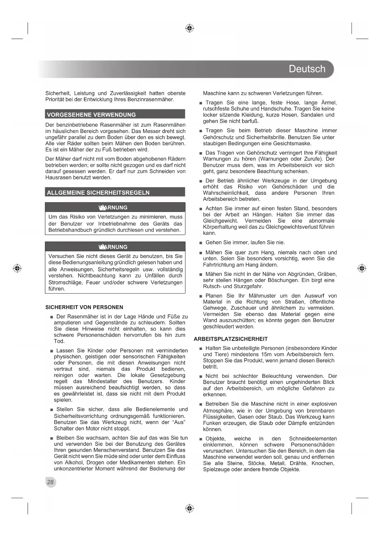 ■ Der Rasenmäher ist in der Lage Hände und Füße zu amputieren und Gegenstände zu schleudern. Sollten Sie diese Hinweise nicht einhalten, so kann dies schwere Personenschäden hervorrufen bis hin zum Tod. ■ Lassen Sie Kinder oder Personen mit verminderten physischen, geistigen oder sensorischen Fähigkeiten oder Personen, die mit diesen Anweisungen nicht vertraut sind, niemals das Produkt bedienen, reinigen oder warten. Die lokale Gesetzgebung regelt das Mindestalter des Benutzers. Kinder müssen ausreichend beaufsichtigt werden, so dass es gewährleistet ist, dass sie nicht mit dem Produkt spielen. ■ Stellen Sie sicher, dass alle Bedienelemente und Sicherheitsvorrichtung ordnungsgemäß funktionieren. Benutzen Sie das Werkzeug nicht, wenn der “Aus” Schalter den Motor nicht stoppt. ■ Bleiben Sie wachsam, achten Sie auf das was Sie tun und verwenden Sie bei der Benutzung des Gerätes Ihren gesunden Menschenverstand. Benutzen Sie das Gerät nicht wenn Sie müde sind oder unter dem Einfluss von Alkohol, Drogen oder Medikamenten stehen. Ein unkonzentrierter Moment während der Bedienung der Maschine kann zu schweren Verletzungen führen. ■ Tragen Sie eine lange, feste Hose, lange Ärmel, rutschfeste Schuhe und Handschuhe. Tragen Sie keine locker sitzende Kleidung, kurze Hosen, Sandalen und gehen Sie nicht barfuß. ■ Tragen Sie beim Betrieb dieser Maschine immer Gehörschutz und Sicherheitsbrille. Benutzen Sie unter staubigen Bedingungen eine Gesichtsmaske. ■ Das Tragen von Gehörschutz verringert Ihre Fähigkeit Warnungen zu hören (Warnungen oder Zurufe). Der Benutzer muss dem, was im Arbeitsbereich vor sich geht, ganz besondere Beachtung schenken. ■ Der Betrieb ähnlicher Werkzeuge in der Umgebung erhöht das Risiko von Gehörschäden und die Wahrscheinlichkeit, dass andere Personen Ihren Arbeitsbereich betreten. ■ Achten Sie immer auf einen festen Stand, besonders bei der Arbeit an Hängen. Halten Sie immer das Gleichgewicht. Vermeiden Sie eine abnormale Körperhaltung weil das zu Gleichgewichtsverlust führen kann. ■ Gehen Sie immer, laufen Sie nie. ■ Mähen Sie quer zum Hang, niemals nach oben und unten. Seien Sie besonders vorsichtig, wenn Sie die Fahrtrichtung am Hang ändern. ■ Mähen Sie nicht in der Nähe von Abgründen, Gräben, sehr steilen Hängen oder Böschungen. Ein birgt eine Rutsch- und Sturzgefahr. ■ Planen Sie Ihr Mähmuster um den Auswurf von Material in die Richtung von Straßen, öffentliche Gehwege, Zuschauer und ähnlichem zu vermeiden. Vermeiden Sie ebenso das Material gegen eine Wand auszuschütten; es könnte gegen den Benutzer geschleudert werden. ARBEITSPLATZSICHERHEIT ■ Halten Sie unbeteiligte Personen (insbesondere Kinder und Tiere) mindestens 15m vom Arbeitsbereich fern. Stoppen Sie das Produkt, wenn jemand diesen Bereich betritt. ■ Nicht bei schlechter Beleuchtung verwenden. Der Benutzer braucht benötigt einen ungehinderten Blick auf den Arbeitsbereich, um mögliche Gefahren zu erkennen. ■ Betreiben Sie die Maschine nicht in einer explosiven Atmosphäre, wie in der Umgebung von brennbaren Flüssigkeiten, Gasen oder Staub. Das Werkzeug kann Funken erzeugen, die Staub oder Dämpfe entzünden können. ■ Objekte, welche in den Schneideelementen einklemmen, können schwere Personenschäden verursachen. Untersuchen Sie den Bereich, in dem die Maschine verwendet werden soll, genau und entfernen Sie alle Steine, Stöcke, Metall, Drähte, Knochen, Spielzeuge oder andere fremde Objekte.Deutsch