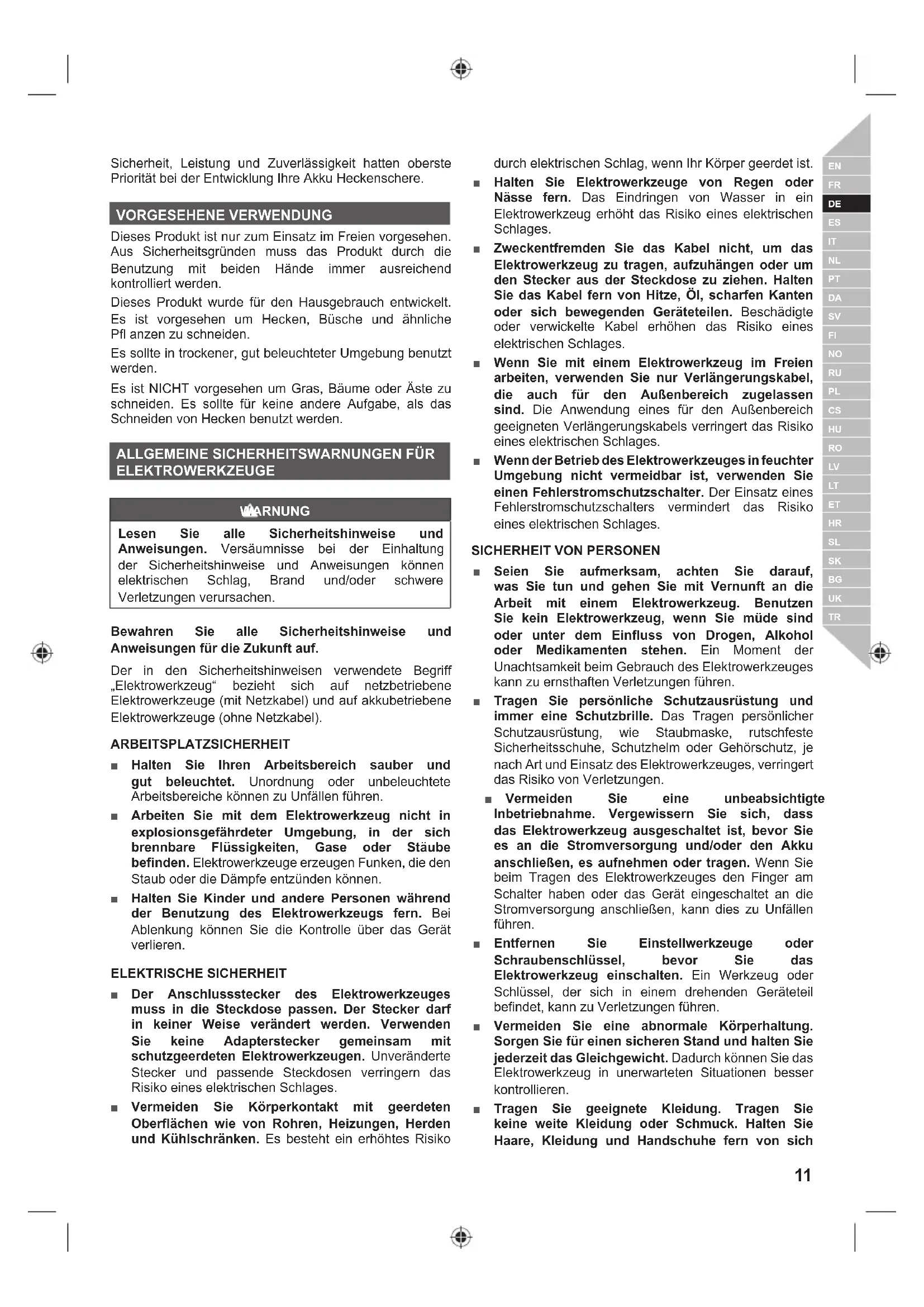 WARNUNG Verwenden Sie ausschließlich original Ersatzteile, Zubehör und Aufsätze des Herstellers. Nichtbefolgung kann mögliche Verletzungen oder schlechte Leistung verursachen und Ihre Garantie ungültig machen. WARNUNG Service und Wartung des Gerätes erfordert besonderen Schutz und Kenntnisstand und sollte nur durch qualifiziertes Personal durchgeführt werden. Wir empfehlen zu diesem Zweck das Produkt umgehend an ein Authorisiertes Service Center zur Reparatur zu senden. Beim Service sollten Sie nur originale Ersatzteile benutzen. WARNUNG Die Schneidmesser sind scharf. Seien Sie bei der Reinigung, dem Ölen und Anbringen oder Entfernen des Klingenschutzes extrem vorsichtig, um Verletzungen zu vermeiden. Entfernen Sie vor Einstellungen, Wartung oder Reinigung den Akku. ■ Sie dürfen die die in dieser Bedienungsanleitung beschriebenen Einstellungen und Reparaturen durchführen. Kontaktieren Sie Ihren autorisierten Kundendienst für andere Reparaturen. ■ Reinigen Sie das Gehäuse und die Griffe nach jeder Benutzung des Produktes mit einem weichen, trockenen Lappen. ■ Reinigen Sie nach jeder Benutzung den Schmutz mit einer harten Bürste und tragen dann vorsichtig ein Öl als Rostschutz auf, bevor Sie den Klingenschutz wieder anbringen. Der Hersteller empfiehlt, dass Sie ein Spray als Rostschutz und zum Ölen benutzen, um eine gleichmäßige Verteilung zu gewährleisten und die Gefahr einer Verletzung durch Berührung der Klingen zu verringern. Fragen Sie Ihren autorisierten Kundendienst nach einem geeignete Spray-Produkt. ■ Wenn Sie möchten, können Sie die Schneidmesser vor jeder Benutzung auf die oben genannte Weise leicht einölen. ■ Überprüfen Sie Bolzen, Muttern und Schrauben immer wieder ob alles fest angezogen wird so dass das Produkt in einem sicheren Zustand ist. Jedes beschädigte Teil sollte durch den autorisierten Kundendienst ordnungsgemäß repariert oder ausgetauscht werden. RESTRISIKEN Sogar wenn das Produkt wie vorgeschrieben benutzt wird, ist es unmöglich ein gewisses Restrisiko vollständig zu beseitigen. Die folgenden Gefahren können bei der Benutzung entstehen, und der Benutzer sollte besonders auf folgende Punkte achten: ■ Verletzungen, die durch ein ungedeckte Messer verursacht wurden. Kontakt mit den Messern kann schwere Verletzungen verursachen. Halten Sie das Schneidwerkzeug fern vom Körper und niedriger als Hüfthöhe. Benutzen Sie den Schutzabdeckung, wenn Sie nicht Schneiden. ■ Durch Vibrationen verursachte Verletzungen. Benutzen Sie immer das richtige Werkzeug für die Aufgabe, benutzen Sie die vorgesehenen Griffe und schränken die Arbeitszeit und Exposition ein. ■ Lärm kann zu Gehörschäden führen. Tragen Sie einen Gehörschutz und schränken Sie die Belastung ein. RISIKOVERRINGERUNG Vibrationen von in der Hand gehaltenen Werkzeugen können bei einigen Personen zu einem Zustand, der Raynaud-Syndrom genannt wird, führen. Symptome sind u.a. Kribbeln, Taubheitsgefühl und episodische Weißfärbung der Finger und treten normalerweise bei Kälte auf. Man geht davon aus, dass ererbte Faktoren, Kälte und Feuchtigkeit, Essgewohnheiten, Rauchen und Arbeitsweise zur Entwicklung dieser Symptome beitragen. Der Anwender kann Maßnahmen ergreifen, um die Auswirkungen der Vibrationen möglicherweise zu verringern: ■ Halten Sie den Körper bei Kälte warm. Tragen Sie beim Betrieb des Geräts Handschuhe, um Hände und Handgelenke warm zu halten. Berichten zu Folge ist kaltes Wetter ein wesentlicher Faktor, der zum Raynaud Syndrom beiträgt. ■ Betätigen Sie sich nach jedem Einsatz körperlich, um den Blutkreislauf zu steigern. ■ Machen Sie regelmäßig Pausen. Beschränken Sie die Beanspruchung pro Tag. ■ Sollten bei Ihnen Symptome dieses Zustands auftreten, stellen Sie unverzüglich den Betrieb ein und suchen Sie in Hinsicht auf die Symptome einen Arzt auf.15 Deutsch |