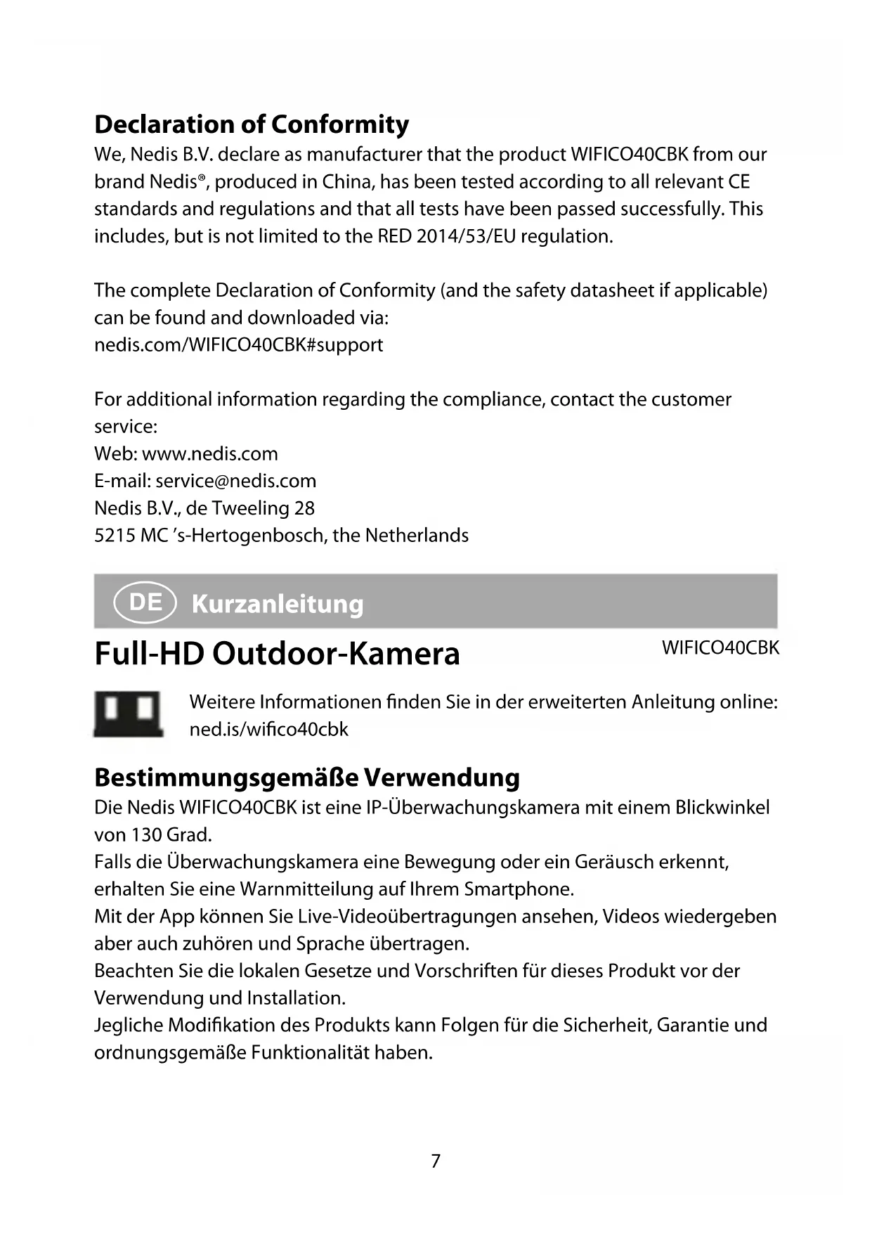 - Halten Sie die Kamera mindestens 1 Meter von drahtlosen Geräten wie WLAN-Routern und Telefonen fern, um Funkstörungen zu vermeiden. Konformitätserklärung Wir, Nedis B.V., erklären als Hersteller, dass das Produkt WIFICO40CBK unserer Marke Nedis®, produziert in China, nach allen geltenden CE-Standards und Vorschriften getestet wurde und alle diese Tests erfolgreich bestanden hat. Dies gilt unter anderem auch für die Richtlinie RED 2014/53/EU. Die vollständige Konformitätserklärung (und das Sicherheitsdatenblatt, falls zutreend) steht zum Download zur Verfügung unter: nedis.de/WIFICO40CBK#support Weiterführende Informationen zur Compliance erhalten Sie über den Kundenservice: Web: www.nedis.com11 E-Mail: service@nedis.com Nedis B.V., de Tweeling 28 5215 MC ’s-Hertogenbosch, Niederlande