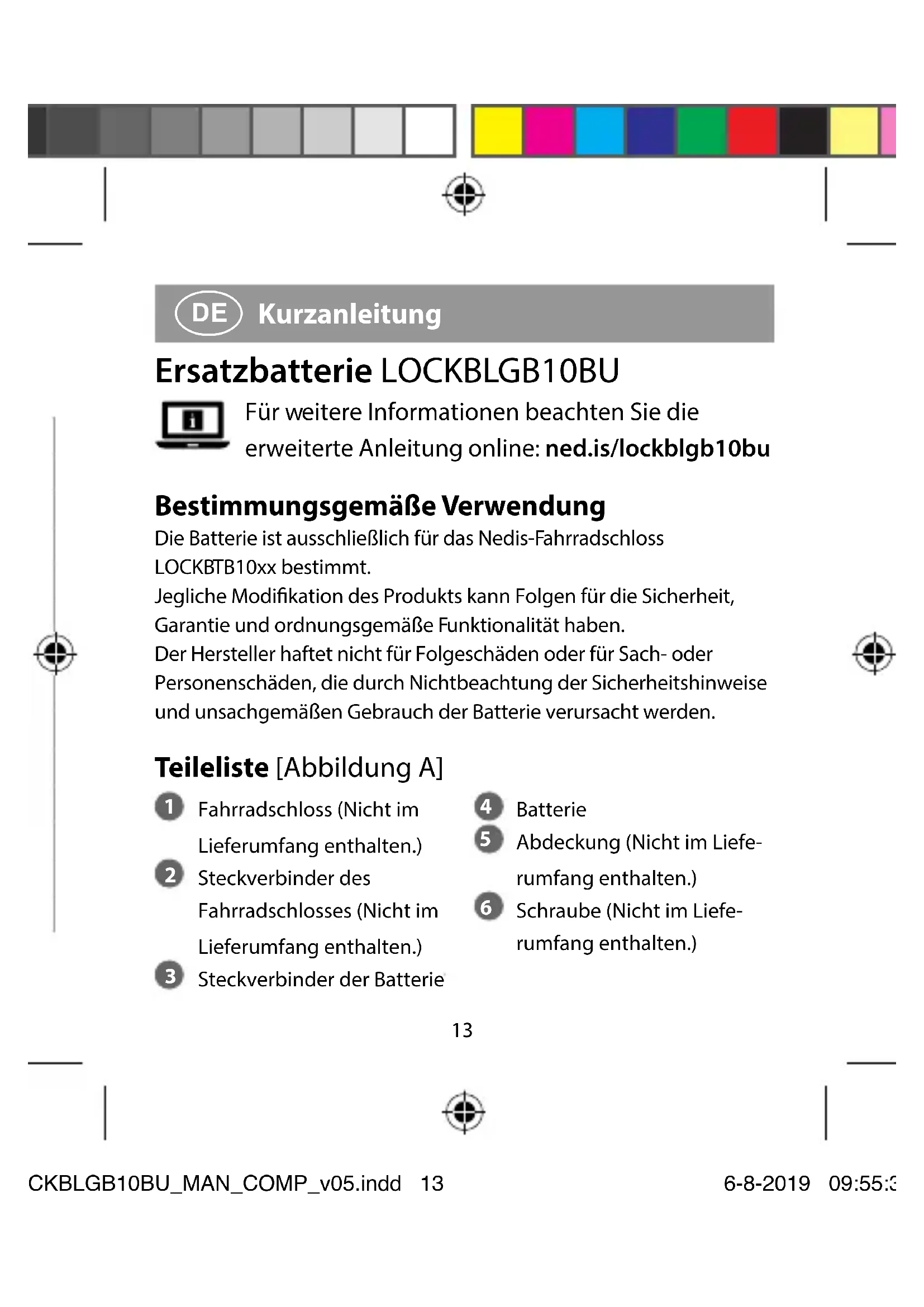 Kurzanleitung Ersatzbatterie LOCKBLGB10BU Für weitere Informationen beachten Sie die erweiterte Anleitung online: ned.is/lockblgb10bu Bestimmungsgemäße Verwendung Die Batterie ist ausschließlich für das Nedis-Fahrradschloss LOCKBTB10xx bestimmt. Jegliche Modikation des Produkts kann Folgen für die Sicherheit, Garantie und ordnungsgemäße Funktionalität haben. Der Hersteller haftet nicht für Folgeschäden oder für Sach- oder Personenschäden, die durch Nichtbeachtung der Sicherheitshinweise und unsachgemäßen Gebrauch der Batterie verursacht werden. Teileliste [Abbildung A]