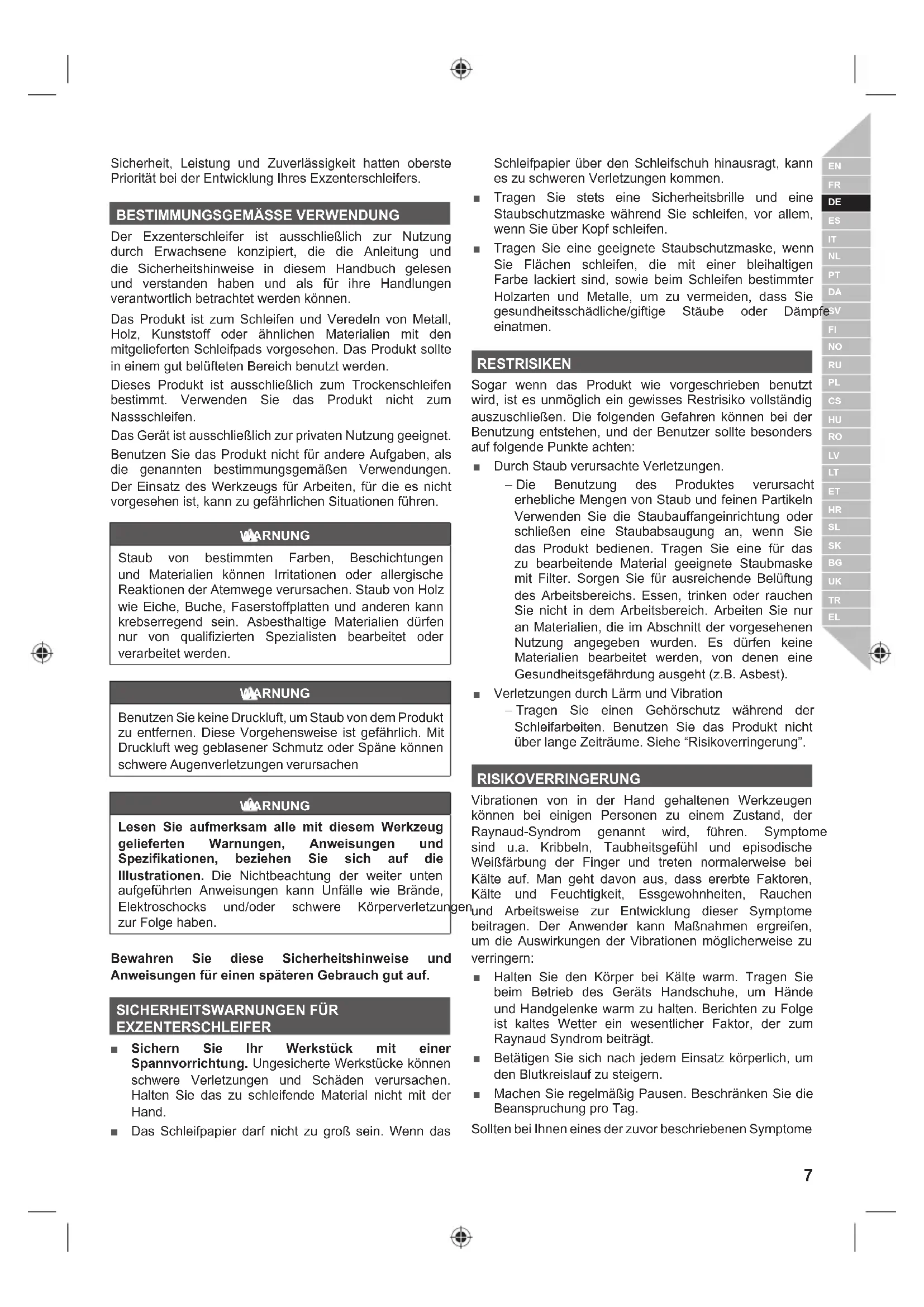 EXZENTERSCHLEIFER Ŷ Sichern Sie Ihr Werkstück mit einer Spannvorrichtung. Ungesicherte Werkstücke können schwere Verletzungen und Schäden verursachen. Halten Sie das zu schleifende Material nicht mit der Hand. Ŷ Das Schleifpapier darf nicht zu groß sein. Wenn das Schleifpapier über den Schleifschuh hinausragt, kann es zu schweren Verletzungen kommen. Ŷ Tragen Sie stets eine Sicherheitsbrille und eine Staubschutzmaske während Sie schleifen, vor allem, wenn Sie über Kopf schleifen. Ŷ Tragen Sie eine geeignete Staubschutzmaske, wenn Sie Flächen schleifen, die mit einer bleihaltigen Farbe lackiert sind, sowie beim Schleifen bestimmter Holzarten und Metalle, um zu vermeiden, dass Sie JHVXQGKHLWVVFKlGOLFKHJLIWLJH 6WlXEH RGHU 'lPSIH einatmen. RESTRISIKEN Sogar wenn das Produkt wie vorgeschrieben benutzt wird, ist es unmöglich ein gewisses Restrisiko vollständig auszuschließen. Die folgenden Gefahren können bei der Benutzung entstehen, und der Benutzer sollte besonders auf folgende Punkte achten: Ŷ Durch Staub verursachte Verletzungen. – Die Benutzung des Produktes verursacht erhebliche Mengen von Staub und feinen Partikeln Verwenden Sie die Staubauffangeinrichtung oder schließen eine Staubabsaugung an, wenn Sie das Produkt bedienen. Tragen Sie eine für das zu bearbeitende Material geeignete Staubmaske mit Filter. Sorgen Sie für ausreichende Belüftung des Arbeitsbereichs. Essen, trinken oder rauchen Sie nicht in dem Arbeitsbereich. Arbeiten Sie nur an Materialien, die im Abschnitt der vorgesehenen Nutzung angegeben wurden. Es dürfen keine Materialien bearbeitet werden, von denen eine Gesundheitsgefährdung ausgeht (z.B. Asbest). Ŷ Verletzungen durch Lärm und Vibration – Tragen Sie einen Gehörschutz während der Schleifarbeiten. Benutzen Sie das Produkt nicht über lange Zeiträume. Siehe “Risikoverringerung”. RISIKOVERRINGERUNG Vibrationen von in der Hand gehaltenen Werkzeugen können bei einigen Personen zu einem Zustand, der 5D\QDXG6\QGURP JHQDQQW ZLUG IKUHQ 6\PSWRPH sind u.a. Kribbeln, Taubheitsgefühl und episodische Weißfärbung der Finger und treten normalerweise bei Kälte auf. Man geht davon aus, dass ererbte Faktoren, Kälte und Feuchtigkeit, Essgewohnheiten, Rauchen und Arbeitsweise zur Entwicklung dieser Symptome beitragen. Der Anwender kann Maßnahmen ergreifen, um die Auswirkungen der Vibrationen möglicherweise zu verringern: Ŷ Halten Sie den Körper bei Kälte warm. Tragen Sie beim Betrieb des Geräts Handschuhe, um Hände und Handgelenke warm zu halten. Berichten zu Folge ist kaltes Wetter ein wesentlicher Faktor, der zum Raynaud Syndrom beiträgt. Ŷ Betätigen Sie sich nach jedem Einsatz körperlich, um den Blutkreislauf zu steigern. Ŷ Machen Sie regelmäßig Pausen. Beschränken Sie die Beanspruchung pro Tag. Sollten bei Ihnen eines der zuvor beschriebenen Symptome8 | Deutsch =XVWlQGHDXIWUHWHQVWHOOHQ6LHXQYHU]JOLFKGHQ%HWULHE ein und suchen Sie bezüglich der Symptome einen Arzt auf. WARNUNG Verletzungen können durch lange Benutzung eines Werkzeugs entstehen oder verschlimmert werden. Machen Sie regelmäßig Pause, wenn Sie ein Werkzeug für lange Zeit benutzen.