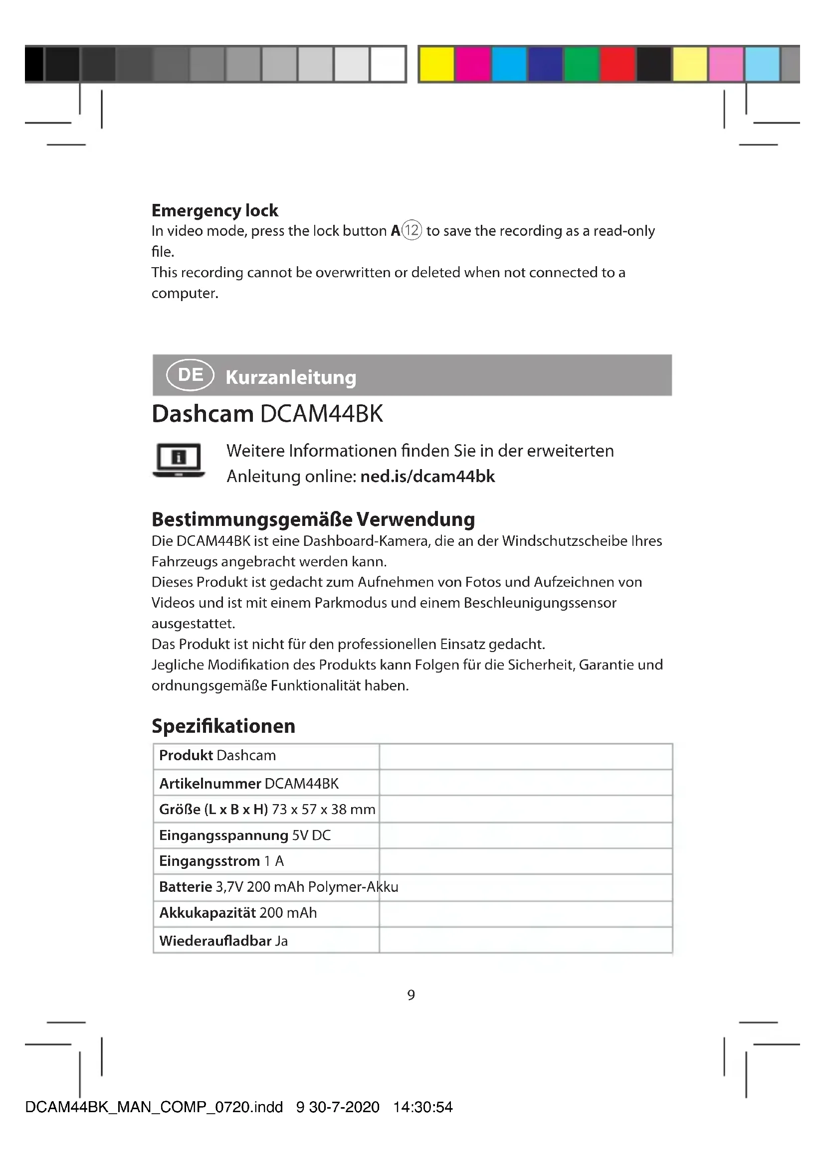 Kurzanleitung Dashcam DCAM44BK Weitere Informationen finden Sie in der erweiterten Anleitung online: ned.is/dcam44bk Bestimmungsgemäße Verwendung Die DCAM44BK ist eine Dashboard-Kamera, die an der Windschutzscheibe Ihres Fahrzeugs angebracht werden kann. Dieses Produkt ist gedacht zum Aufnehmen von Fotos und Aufzeichnen von Videos und ist mit einem Parkmodus und einem Beschleunigungssensor ausgestattet. Das Produkt ist nicht für den professionellen Einsatz gedacht. Jegliche Modifikation des Produkts kann Folgen für die Sicherheit, Garantie und ordnungsgemäße Funktionalität haben. Spezikationen Produkt Dashcam Artikelnummer DCAM44BK Größe (L x B x H) 73 x 57 x 38 mm Eingangsspannung 5V DC Eingangsstrom 1 A Batterie 3,7V 200 mAh Polymer-Akku Akkukapazität 200 mAh Wiederauadbar Ja DCAM44BK_MAN_COMP_0720.indd 9 30-7-2020 14:30:5410 Lagertemperatur -20 - 60 °C Betriebstemperatur -20 - 60 °C Anzeige 2,45 Zoll LCD-Display Blickwinkel 140 Grad Videoaufnahmedauer 1 / 3 / 5 min Videoformat .mp4 Video-Codierung H.264 / H.265 Videoauösung 3840 x 2160 P30 / 2560 x 1440 P30 / 1920 x 1080 P60 / 1920 x 1080 P30 Bildauösung 12M / 10M / 8M / 5M / 3M / VGA Sprache Englisch, Französisch, Deutsch, Italienisch, Niederländisch, Schwedisch, Finnisch, Rumänisch, Ungarisch, Tschechisch, , Erstellen von Aufnahmen Integriertes Mikrofon Speicherkarte microSD-Karte Speicherkartenkapazität 4 - 128 GB USB-Schnittstelle Micro-USB Automatische Abschaltung 1 / 3 / 5 min Bildschirmschoner 1 / 3 / 5 min Hauptbestandteile (Abbildung A)